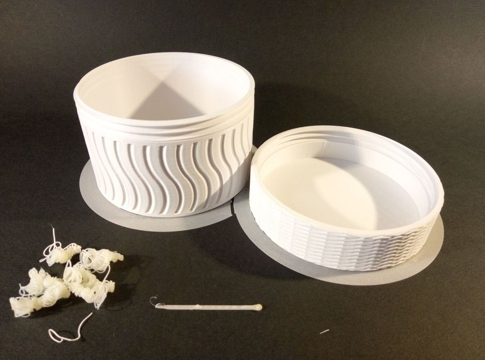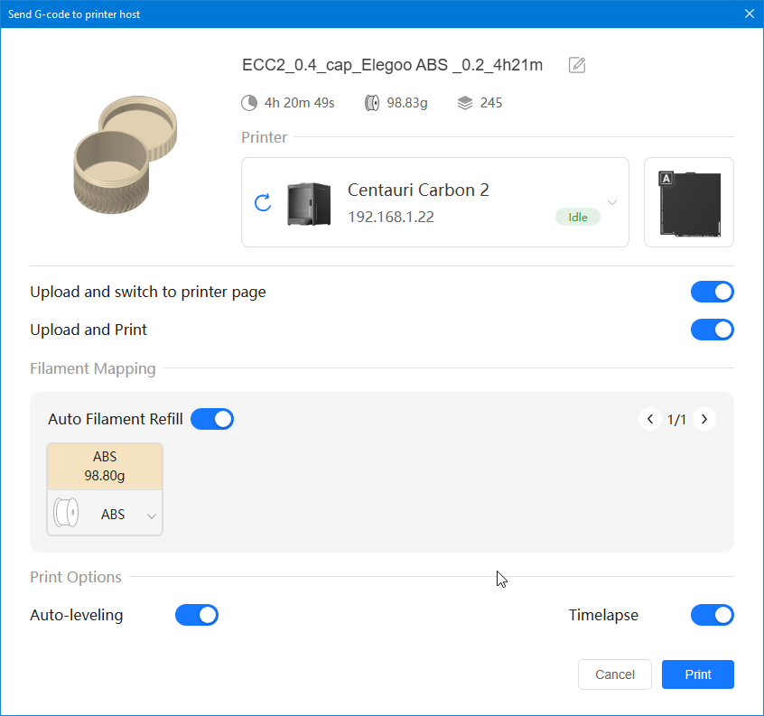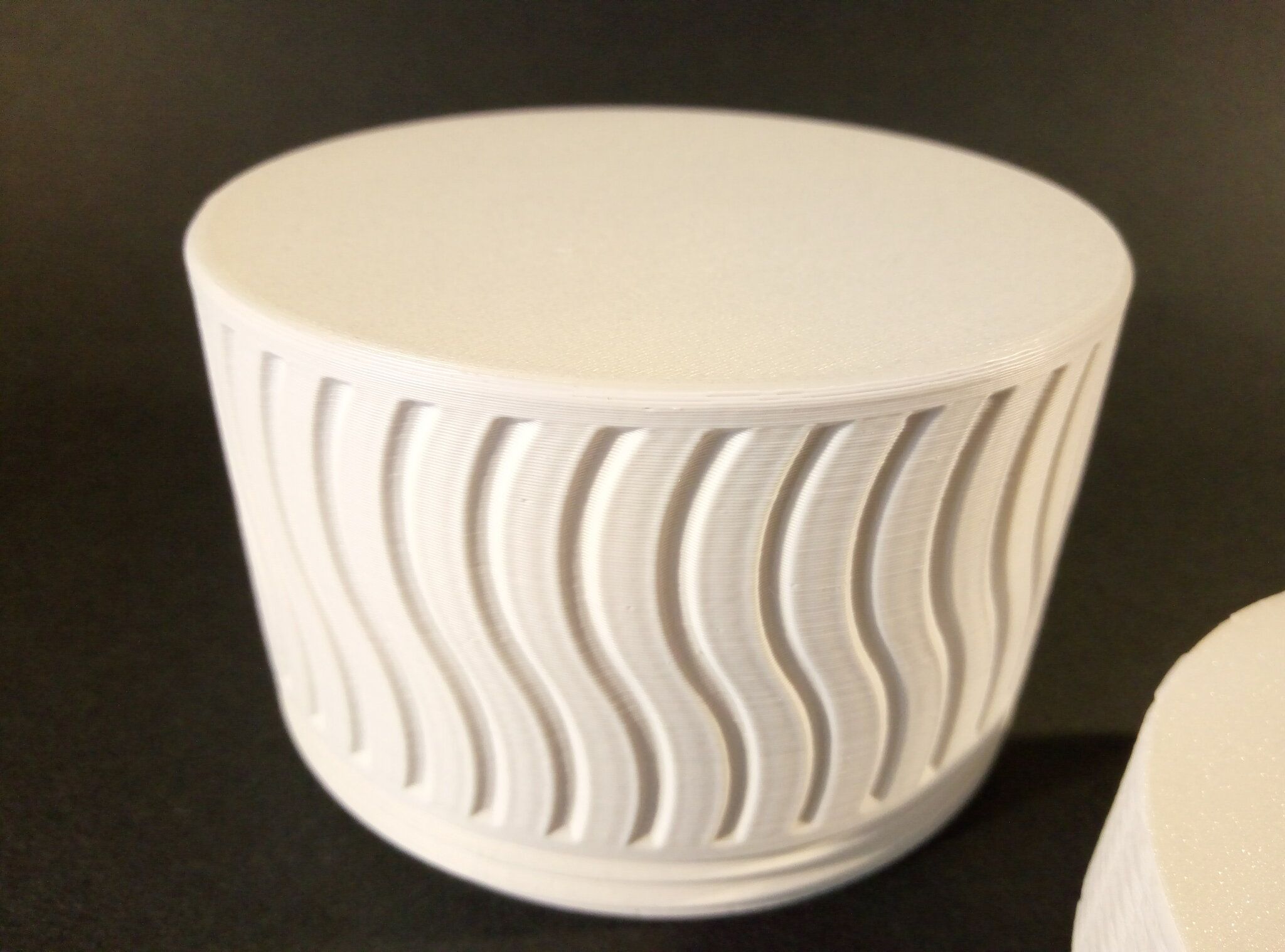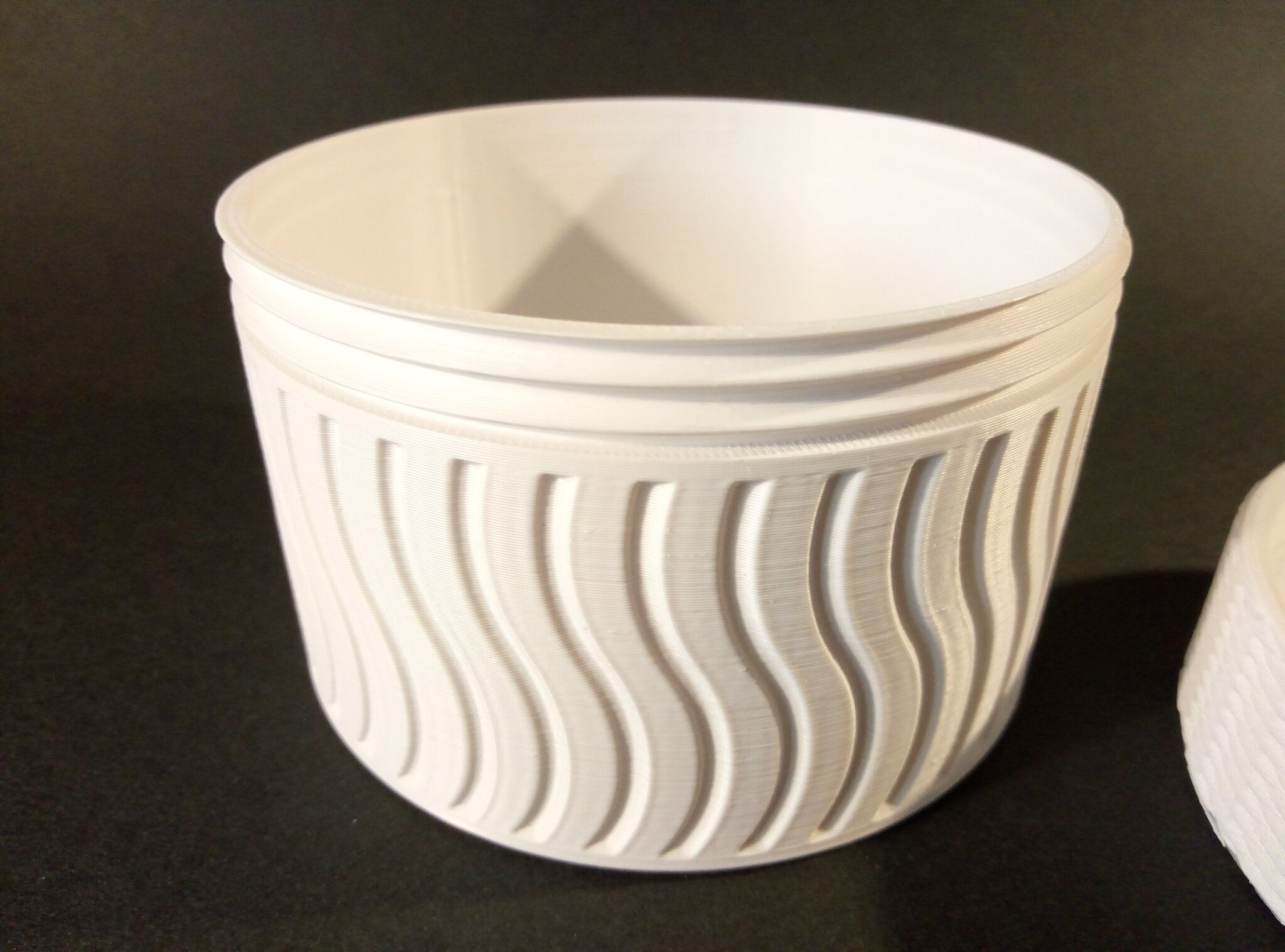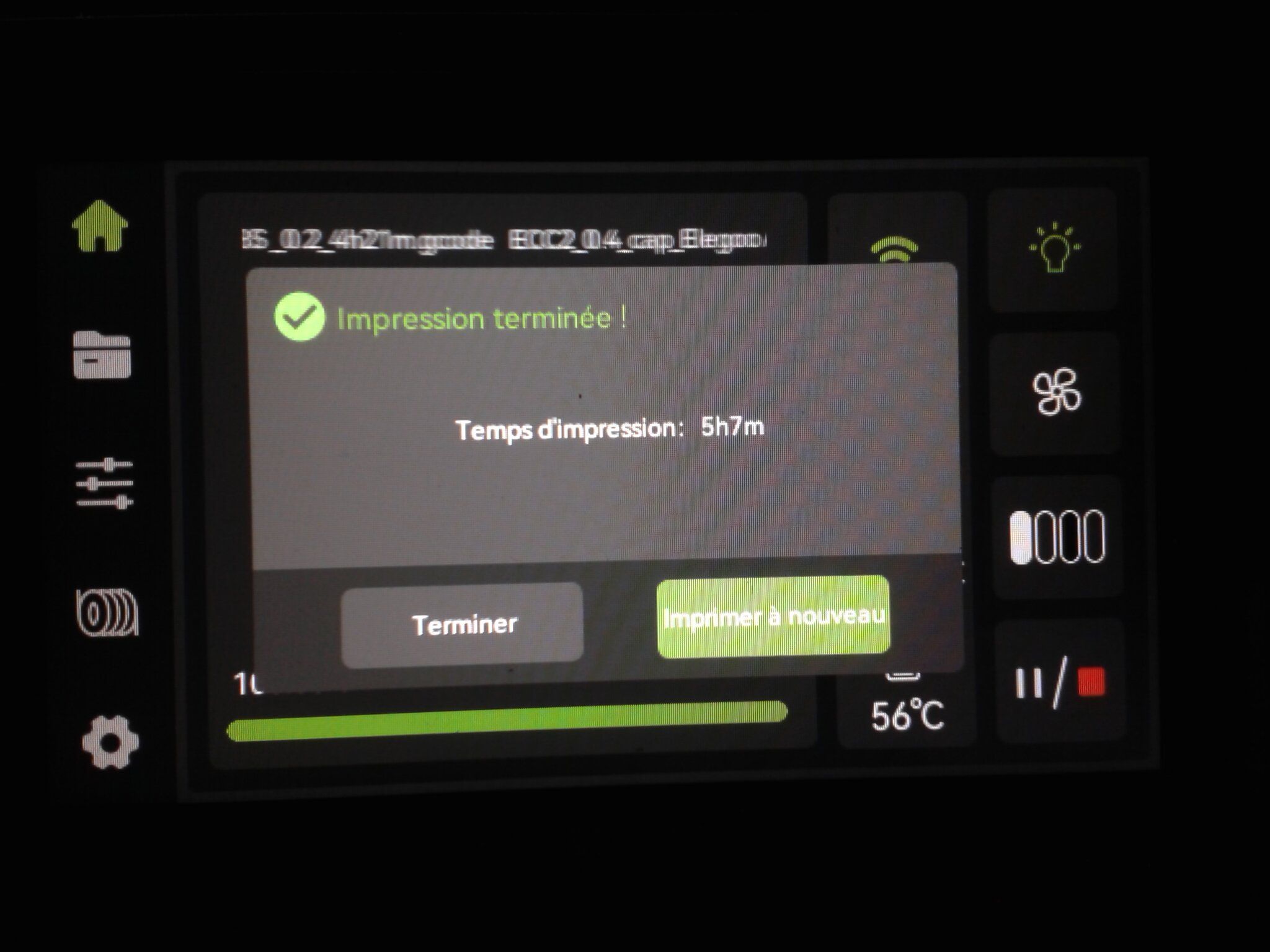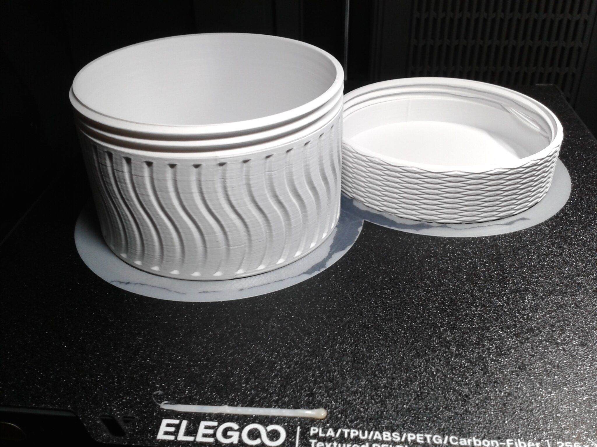 Autres impressions - ABS Je n'ai pas vraiment l'habitude d'imprimer de l'ABS. Mais je sais d'expérience que c'est un matériau bien moins facile à imprimer que le PLA. Il me semble que généralement l'ABS requiert un plateau parfaitement dégraissé car a une forte tendance à se décoller du plateau, Il faut un plateau bien chaud et une large bordure ("brim") d'impression. et préfère une enceinte chauffée pour ne pas gauchir (se déformer) et/ou avoir des délaminations des couches (les couches imprimées se séparent les unes des autres) lors de l'impression ou lors du refroidissement de ce matériau (préférer laisser l'impression refroidir lentement encore sur le plateau de l'imprimante après fin de son impression). Et il dégage une relativement forte odeur quand on l'imprime. (Être dans un espace bien ventilé et/ou avec un système de filtration de l'air et/ou avec un système d'extraction de l'air vers l'extérieur) J'ai donc préféré pour mes essais, me faire une sorte de surcaisson d'isolation thermique pour recouvrir le "capot thermique" plastique d'origine, pour tenter de gagner quelques degrés dans l'enceinte de l'imprimante lors de l'impression car sur la Centauri Carbon 2, l'enceinte n'a pas de système de chauffage dédié et c'est la chaleur diffusée par le plateau et la tête d'impression lors de l'impression qui chauffe indirectement l'enceinte. Si vous prenez le temps de préchauffer l'imprimante (buse et plateau), notez que la température cible de la buse se remet à 0 au bout de ~10 min (si imprimante inactive) avant de faire une impression en ABS. Vérifier de bien avoir sélectionné "maintenir la température" sur l'écran de contrôle de l'imprimante (cela ferme les clapets qui donnent sur le ventilateur d'extraction). Je n'ai pas trouvé comment faire l'équivalent de "maintenir la température" depuis l'onglet "Device" sous Elegoo Slicer v1.3.2.9 ( Firmware 01.03.01.89) Pour l'ensemble des impressions ABS suivantes, j'ai utilisé le profil filament "Elegoo ABS @ECC2" modifié (buse 270°C, plateau 110°C au lieu de 90°C, MVS 18 mm³/s, Flow 0.98 %) Filaments utilisés : ABS White Velleman, ABS Natural Velleman. Happy Octopus Pen Holder - Kumy https://www.nexprint.com/en/models/G2140368 Filament utilisé : ABS White Velleman Même fichier d'impression Filament utilisé : ABS Natural Velleman Zen Turtle Tray - Kumy https://www.nexprint.com/en/models/G8779612 Filament utilisé : ABS White Velleman Même fichier d'impression Filament utilisé : ABS Natural Velleman Ripple Isle – Wave-Textured Desktop Organizer - Yuki&Nan https://www.nexprint.com/en/models/C0328495 avant tranchage, modification de l'échelle, uniforme, pour obtenir un objet ayant une hauteur Z = 250 mm Filament utilisé : ABS Natural Velleman Vidéo du timelapse : sylo • container - h3liØ https://www.nexprint.com/en/models/G2102568 Mais avant de découper, sous le trancheur ElegooSlicer (v1.3..2.9), j'ai mis sur le même plateau le corps de la boite la moins haute avec un couvercle ( chaque élément est seul sur un plateau dans le fichier .3mf fourni par l'auteur) On peut remarquer quelques petits défauts d'impression du filetage du couvercle (avoir imprimé le corps et le couvercle de la boîte en même temps sur le même plateau et donc avoir pour chaque couche des déplacements entre le corps et le couvercle sont probablement la raison de ses petites imperfections d'impression du filetage du couvercle) Ici, j'ai utilisé la fin de ma bobine d'ABS Natural Velleman avec en "auto-refill" ( initialement paramétré avec la même couleur sur l'onglet "CANVAS" de la machine pour que l'"auto-refill" fonctionne sans intervention) une bobine d'ABS White Velleman. La fonction "auto-refill" a bien fonctionné sans avoir besoin de mon intervention. La quantité de filament restant sur la fin de la bobine d'ABS Natural Velleman n'a permis d'imprimer que quelques-unes des premières couches de cette impression. (Comme les couleurs de filaments utilisés sont relativement proches, cela ne se voit pas vraiment sur les photos, sauf quand on regarde à l'œil et avec une lumière adaptée les faces imprimées en contact avec le plateau.) Malgré les petits défauts d'impression du filetage du couvercle, le couvercle se visse et se dévisse bien du corps de la boîte. Pour l'ensemble de ses impressions en ABS On peut noter que grâce au surcaisson d'isolation thermique fait "à l'arrache" avec les mousses de transport, placé sur le "capot thermique" d'origine, dans mon environnement d'impression à ~17°C, buse 270°C, plateau 110°C, l'enceinte arrive à atteindre les ~57°C.1 point