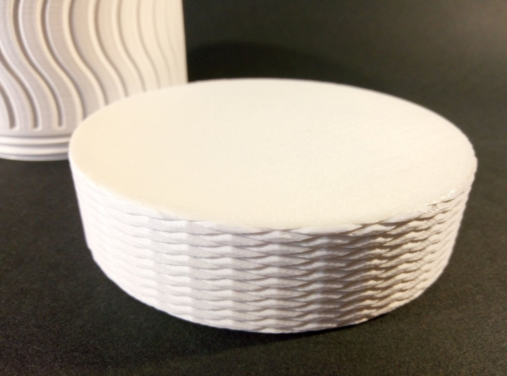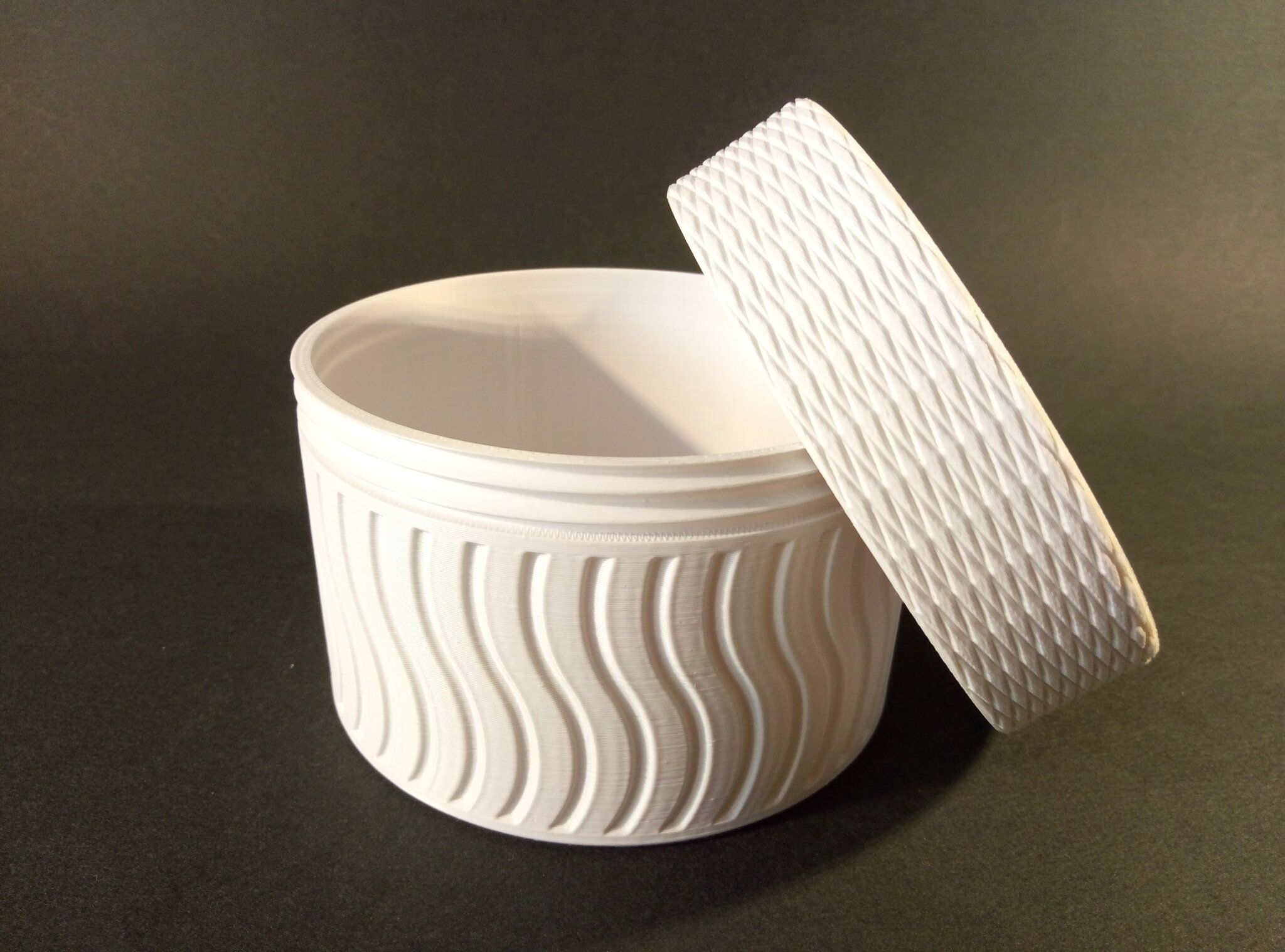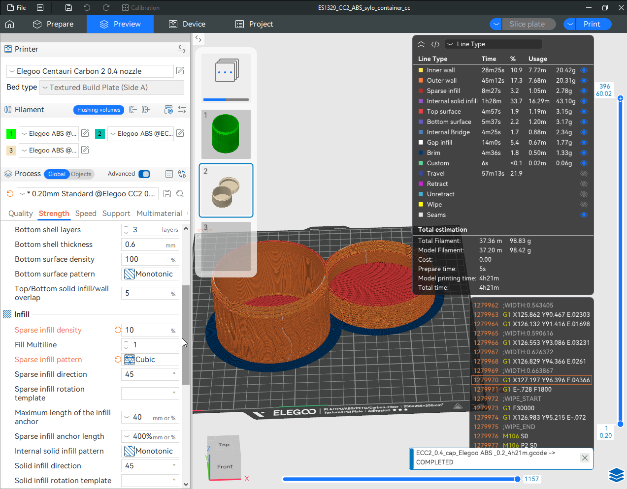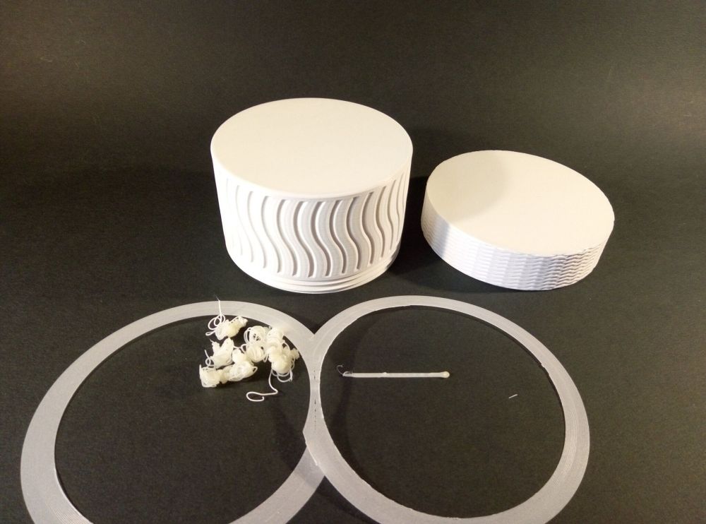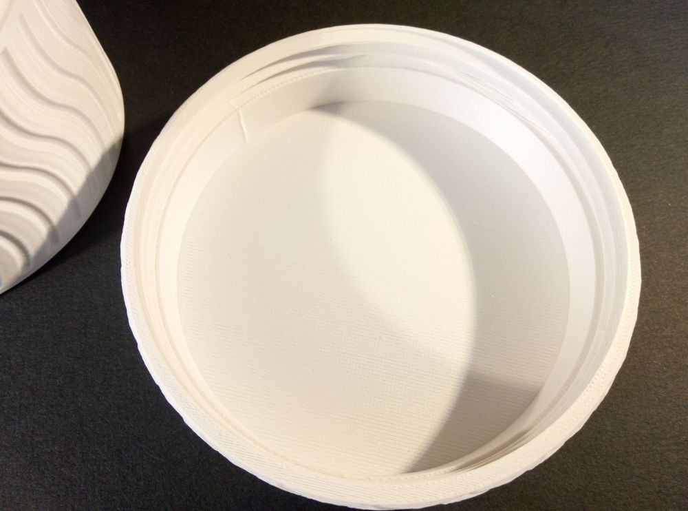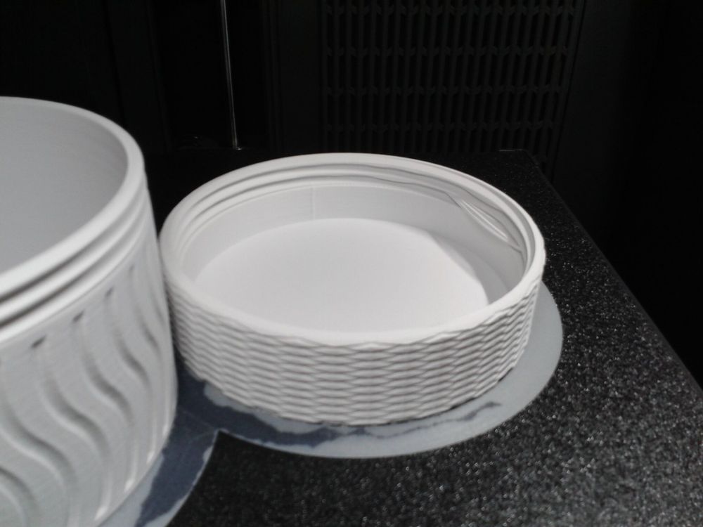 Autres impressions - ABS Je n'ai pas vraiment l'habitude d'imprimer de l'ABS. Mais je sais d'expérience que c'est un matériau bien moins facile à imprimer que le PLA. Il me semble que généralement l'ABS requiert un plateau parfaitement dégraissé car a une forte tendance à se décoller du plateau, Il faut un plateau bien chaud et une large bordure ("brim") d'impression. et préfère une enceinte chauffée pour ne pas gauchir (se déformer) et/ou avoir des délaminations des couches (les couches imprimées se séparent les unes des autres) lors de l'impression ou lors du refroidissement de ce matériau (préférer laisser l'impression refroidir lentement encore sur le plateau de l'imprimante après fin de son impression). Et il dégage une relativement forte odeur quand on l'imprime. (Être dans un espace bien ventilé et/ou avec un système de filtration de l'air et/ou avec un système d'extraction de l'air vers l'extérieur) J'ai donc préféré pour mes essais, me faire une sorte de surcaisson d'isolation thermique pour recouvrir le "capot thermique" plastique d'origine, pour tenter de gagner quelques degrés dans l'enceinte de l'imprimante lors de l'impression car sur la Centauri Carbon 2, l'enceinte n'a pas de système de chauffage dédié et c'est la chaleur diffusée par le plateau et la tête d'impression lors de l'impression qui chauffe indirectement l'enceinte. Si vous prenez le temps de préchauffer l'imprimante (buse et plateau), notez que la température cible de la buse se remet à 0 au bout de ~10 min (si imprimante inactive) avant de faire une impression en ABS. Vérifier de bien avoir sélectionné "maintenir la température" sur l'écran de contrôle de l'imprimante (cela ferme les clapets qui donnent sur le ventilateur d'extraction). Je n'ai pas trouvé comment faire l'équivalent de "maintenir la température" depuis l'onglet "Device" sous Elegoo Slicer v1.3.2.9 ( Firmware 01.03.01.89) Pour l'ensemble des impressions ABS suivantes, j'ai utilisé le profil filament "Elegoo ABS @ECC2" modifié (buse 270°C, plateau 110°C au lieu de 90°C, MVS 18 mm³/s, Flow 0.98 %) Filaments utilisés : ABS White Velleman, ABS Natural Velleman. Happy Octopus Pen Holder - Kumy https://www.nexprint.com/en/models/G2140368 Filament utilisé : ABS White Velleman Même fichier d'impression Filament utilisé : ABS Natural Velleman Zen Turtle Tray - Kumy https://www.nexprint.com/en/models/G8779612 Filament utilisé : ABS White Velleman Même fichier d'impression Filament utilisé : ABS Natural Velleman Ripple Isle – Wave-Textured Desktop Organizer - Yuki&Nan https://www.nexprint.com/en/models/C0328495 avant tranchage, modification de l'échelle, uniforme, pour obtenir un objet ayant une hauteur Z = 250 mm Filament utilisé : ABS Natural Velleman Vidéo du timelapse : sylo • container - h3liØ https://www.nexprint.com/en/models/G2102568 Mais avant de découper, sous le trancheur ElegooSlicer (v1.3..2.9), j'ai mis sur le même plateau le corps de la boite la moins haute avec un couvercle ( chaque élément est seul sur un plateau dans le fichier .3mf fourni par l'auteur) On peut remarquer quelques petits défauts d'impression du filetage du couvercle (avoir imprimé le corps et le couvercle de la boîte en même temps sur le même plateau et donc avoir pour chaque couche des déplacements entre le corps et le couvercle sont probablement la raison de ses petites imperfections d'impression du filetage du couvercle) Ici, j'ai utilisé la fin de ma bobine d'ABS Natural Velleman avec en "auto-refill" ( initialement paramétré avec la même couleur sur l'onglet "CANVAS" de la machine pour que l'"auto-refill" fonctionne sans intervention) une bobine d'ABS White Velleman. La fonction "auto-refill" a bien fonctionné sans avoir besoin de mon intervention. La quantité de filament restant sur la fin de la bobine d'ABS Natural Velleman n'a permis d'imprimer que quelques-unes des premières couches de cette impression. (Comme les couleurs de filaments utilisés sont relativement proches, cela ne se voit pas vraiment sur les photos, sauf quand on regarde à l'œil et avec une lumière adaptée les faces imprimées en contact avec le plateau.) Malgré les petits défauts d'impression du filetage du couvercle, le couvercle se visse et se dévisse bien du corps de la boîte. Pour l'ensemble de ses impressions en ABS On peut noter que grâce au surcaisson d'isolation thermique fait "à l'arrache" avec les mousses de transport, placé sur le "capot thermique" d'origine, dans mon environnement d'impression à ~17°C, buse 270°C, plateau 110°C, l'enceinte arrive à atteindre les ~57°C.1 point