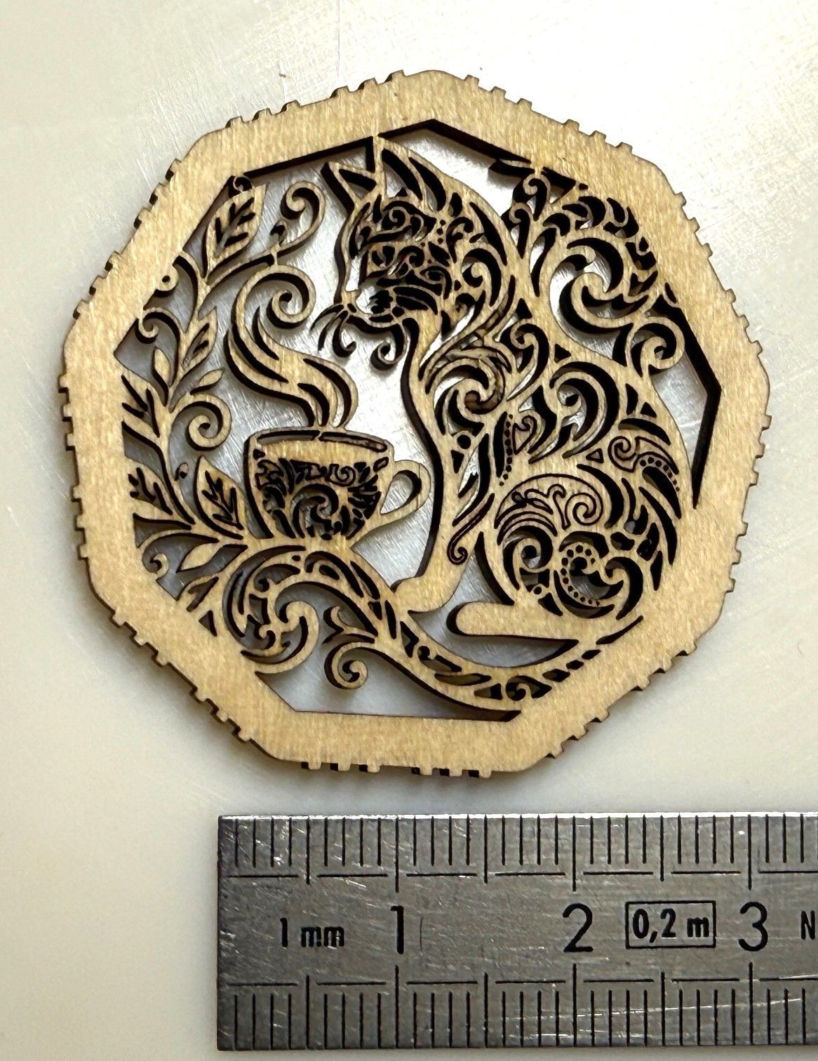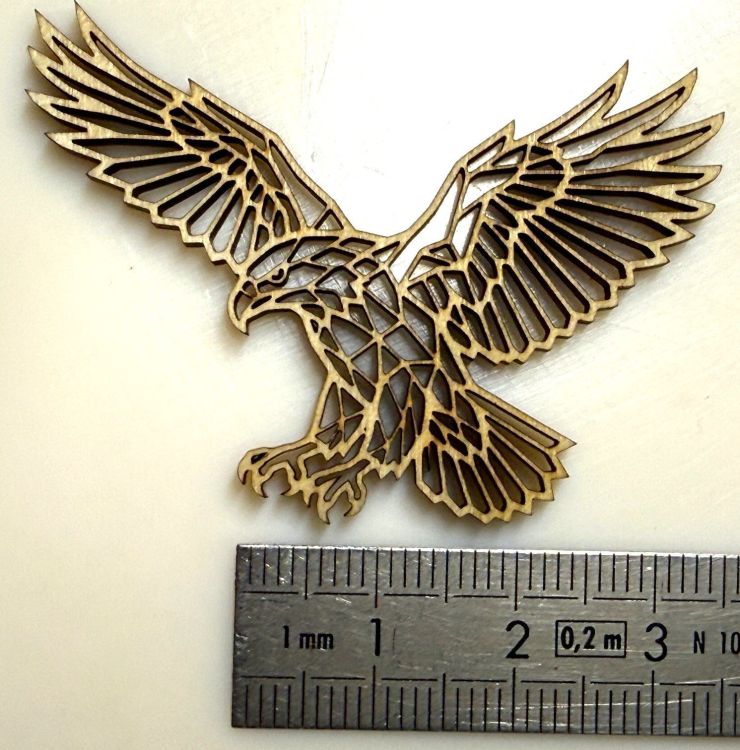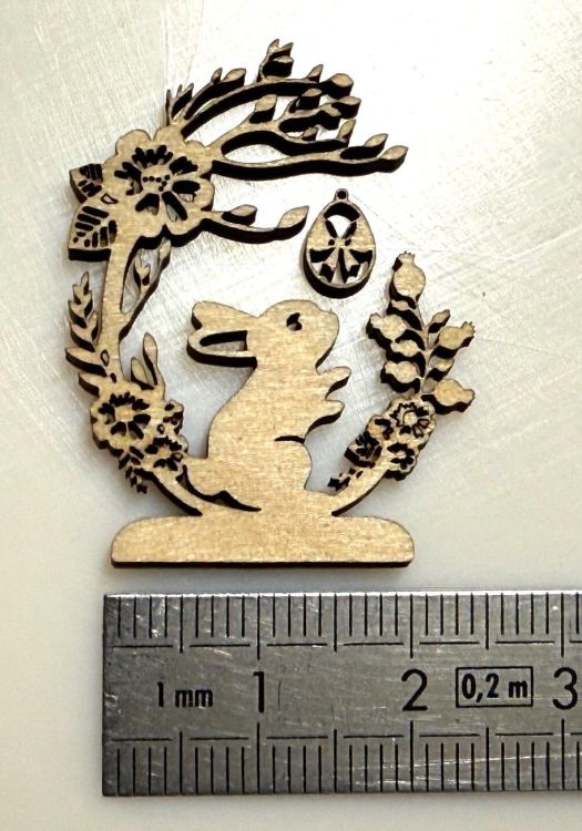 Je suis surpris par la finesse de découpe de ce laser U.V. On arrive à faire de la bijouterie bois avec des parois inférieures à 0,5 mm dans du contre-plaqué de 3 mm, la preuve en images : Le trou de l'œuf est tellement petit que je n'arrive pas à passer un fil. J'enlève les découpes intérieures avec une aiguille qui est parfois trop grosse pour sortir les plus petites découpes5 points