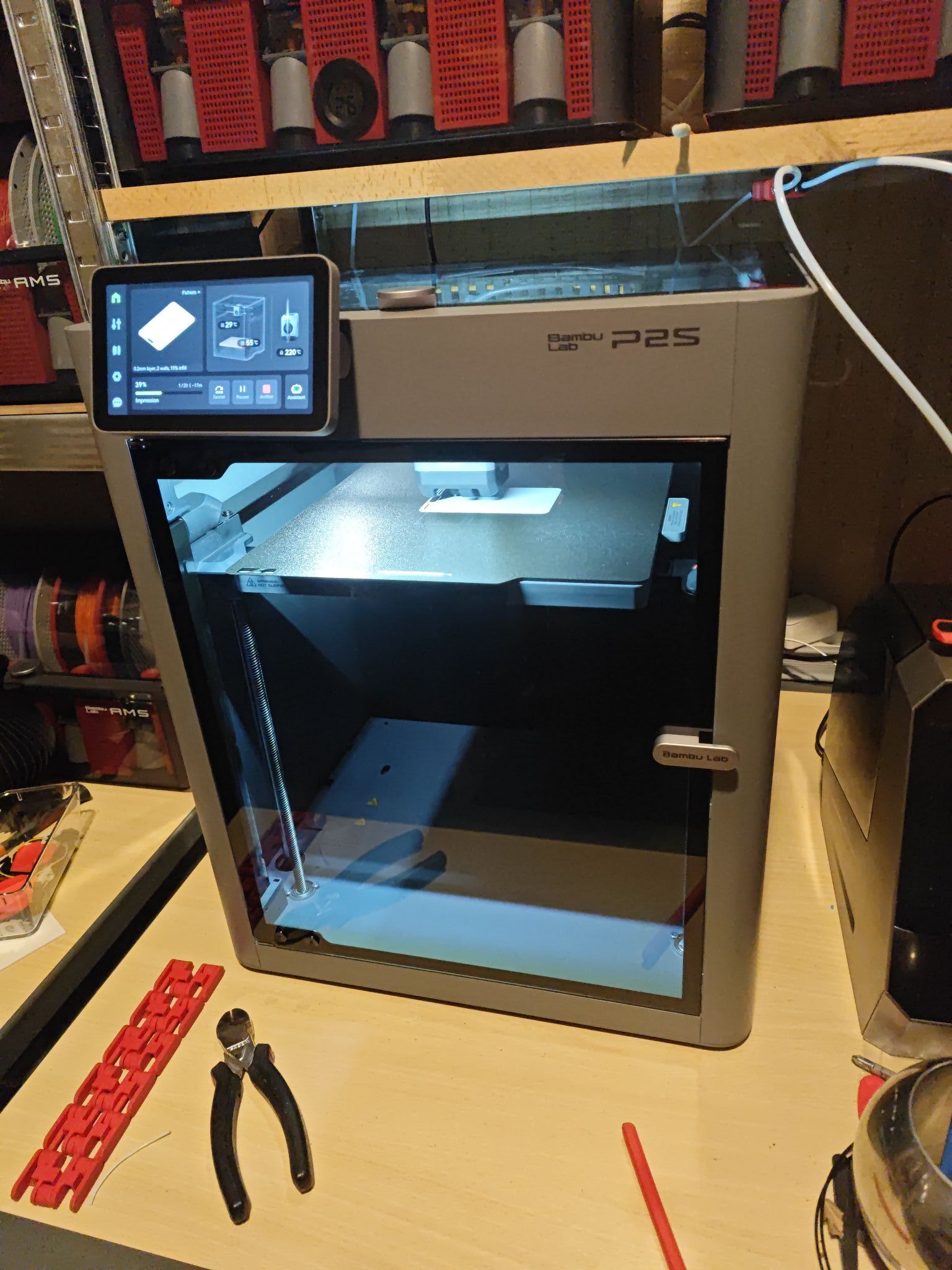 Retour sur l'impression de PETG, et en particulier le transparent de chez Bambu'. Aucun problème rencontré en imprimant les boîtes pour dessicant qui vont dans l'AMS, au contraire je n'ai jamais imprimé cette matière aussi facilement ! Sur la U30 ça faisait des fils de partout, ça se collait sur la buse ... Avec la P2S c'est aussi facile que du PLA, incroyable . J'ai hâte de recevoir les bobines de PETG HF et CF qui sont en route ! Pour le plaisir, petite photo du coin que j'ai aménagé pour la machine, à l'origine c'était une salle de bain avec une douche à cet endroit. Douche et lavabo virés, j'ai mis du lambris et un plan de travail, et on profite toujours de la VMC au dessus pour faire circuler l'air. Le PC est dans la pièce à côté, l'occasion de profiter à fond de la connectivité et la caméra intégrée, l'imprimante étant dans une pièce séparée.3 points