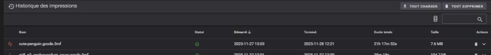 @jcjames_13009 Les temps de prépa sont plus long que sur les anciennes machines a présent car l'on a pas mal de control présent. Dans ton cas 8min reste un temps des plus raisonnables si l'on compare certaines machines . Heureusement sur certaines machine comme BBlab tu peux activé ou non certaines calibrations avant de lancer l'impression . Sur la K2 Plus si j'active la calibration du débit et que j'ai un Bed leveling full plateau je suis bon pour 15min de délais (après le plateau est gros), sur ma nouvelle machine la Snapmaker U1 si tu lance la calibration du débit tu passe de 8-9min a 25min de temps de prépa, logique tu doit calibrer le débit des 4 têtes d'impressions , mais ici Snap indique clairement qu'il est conseillé de le faire principalement que lors de changement de bobine, y a pas de besoin de le faire à tout les print @Rafale01 Tu sais perso je suis pas adepte des système clos, non pas qu'il soit nécessaire de bricoler sur une machine après tous si elle est bien gérer y pas de raison, mais en cas de souci j'aime bien pouvoir chercher et résoudre les souci plutôt que d'attendre 2 mois que la marque ce bouge a corrigé le tire, mais je suis malgré tout passer sur de la Bambulab ne serait ce ma A1 mini (mais j'en ai utilisé d'autres) car a l'époque seule Bambulab avait du multi filament qui je dois l'avoué était utile pour certain de mes besoins, et je dois reconnaitre que Bambulab est très bon pour apporté des correctif soft rapide et efficace j'ai jamais eu a attendre plus de quelques jours un correctif d'un bug (et a chaque fois bug assez mineur), pour autant j'ai eu et est encore pas mal de machine qui ne sont pas des Bambulab et que j'apprécie tout autant et ne sont pas forcement plus compliqué a utilisé (par contre certaines machines sont de vraie merde comme la M1 Pro de Artillery , donc mieux vaut une bonne machine a système fermé qu'un mauvaise ouverte ), je suis pas prêt encore de remplacer ma K2 Plus pour une Bambulab par exemple (les H2 série sont bien mais pas d'intérêt au vue des prix et perte de volume ) ou encore ma nouvelle machine la U1 qui pour le cout m'apporte des impression multi color jusque 6 fois plus rapide et avec 4 fois moins de filament utilisé suivant les pièces bien sûr sur les test que j'ai fait hier . Quoi qu'il en soit la P2S est une bonne machine la calibration auto du flow est juste top tu sera pas déçu de la machine :)2 points