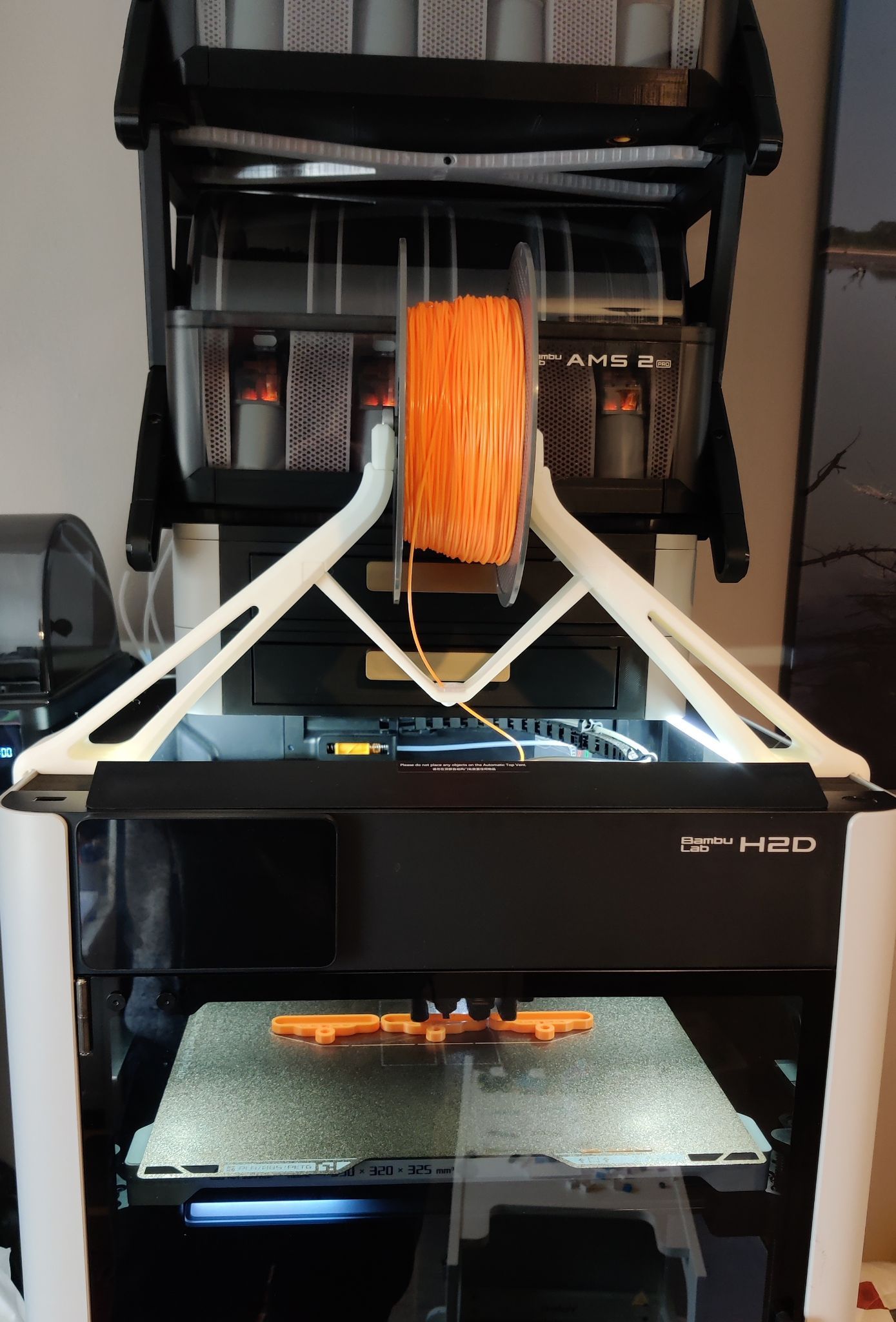 Nouvelle création pour ma part, pour la série H2, un support de bobine ultra bas frottement (intégrant roulements et rotule) pour imprimer du TPU 85A en top qualité (sans aucune sous extrusion...) Voici le lien makerworld : https://makerworld.com/fr/models/2062316-ultra-low-friction-tpu-spool-holder#profileId-2226841 J'ai mis quelques recommandations dans le lien makerwolrd, je ferai un post sur le forum dédié TPU ca pourra surement aider ... J'ai testé pleins d'autres types de montages (notamment en laissant la bobine dans le AMS HT...ce que je souhaitais au départ...) et de paramètres d'impression et je n'arrives pas à reproduire la qualité de ce que j'obtient avec ce montage3 points