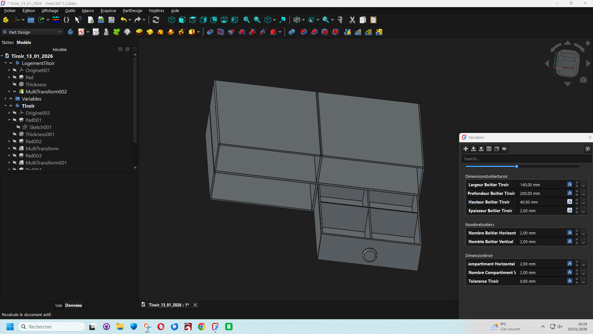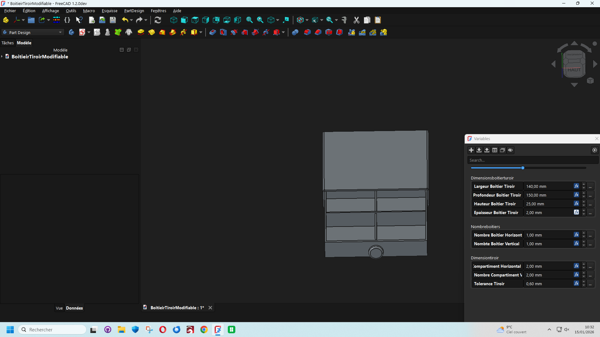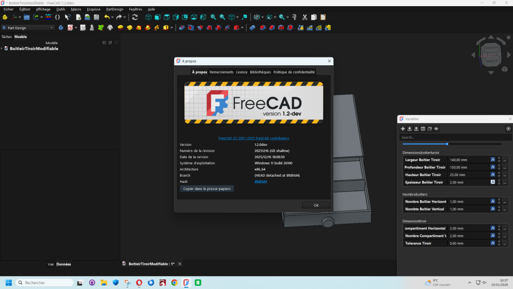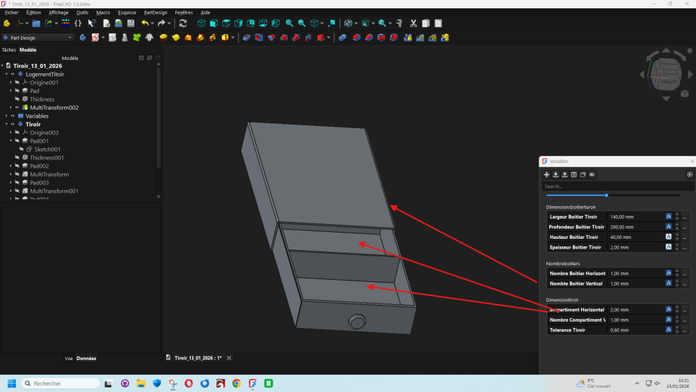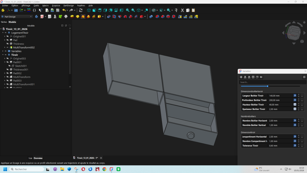 Bonjour les freecadiens, Un boitier avec tiroir modifiable et adaptable suivant les besoins du moment en utilisant l'atelier vars et la version developement de FreeCad 1.2. je joins le fichier en partage et le lien de Freecad 1.2 FreeCAD development weekly-2025.10.01...weekly-2025.10.08 BoitierModifiable.zip https://github.com/FreeCAD/FreeCAD/releases/tag/weekly-2025.10.083 points