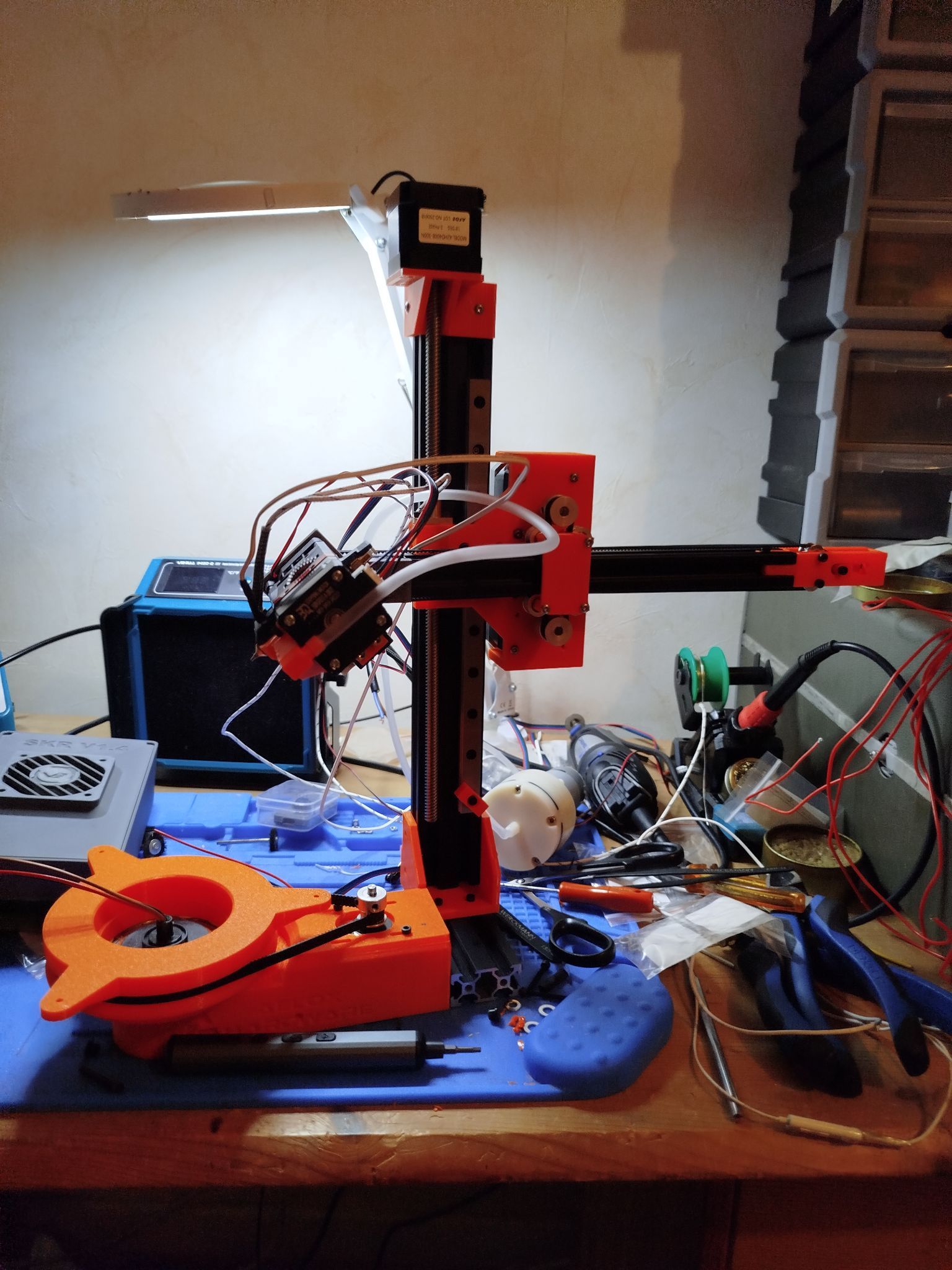 Bonjour à tous ! Après avoir vu la vidéo de Joshua Bird, j'ai décidé de me mettre sur la réalisation de mon nouveau projet "Aetheris-4", qui est une imprimante Core R-θ 4 axes. Je partage donc ici l'avancement de mon projet. Après avoir assemblé l'H2 V2S aux différents comportement de la tête, j'ai monté la base de moteur avec le plateau tournant, avant de fixer les rails MGN aux profilés 2020 en alu. J'ai réalisé que ma SKR E3 V3 Mini n'était pas du tout compatible avec le RRF, et n'ayant pas envie de me faire suer avec le micrologiciel, j'ai échangé ma carte contre une SKR v1.4 qui est en attente. Je vous joins une photo de l'avancement du projet. Bien à vous3 points