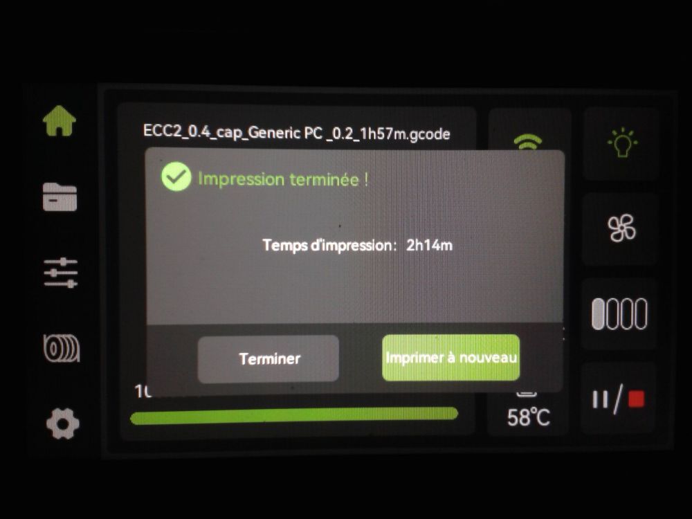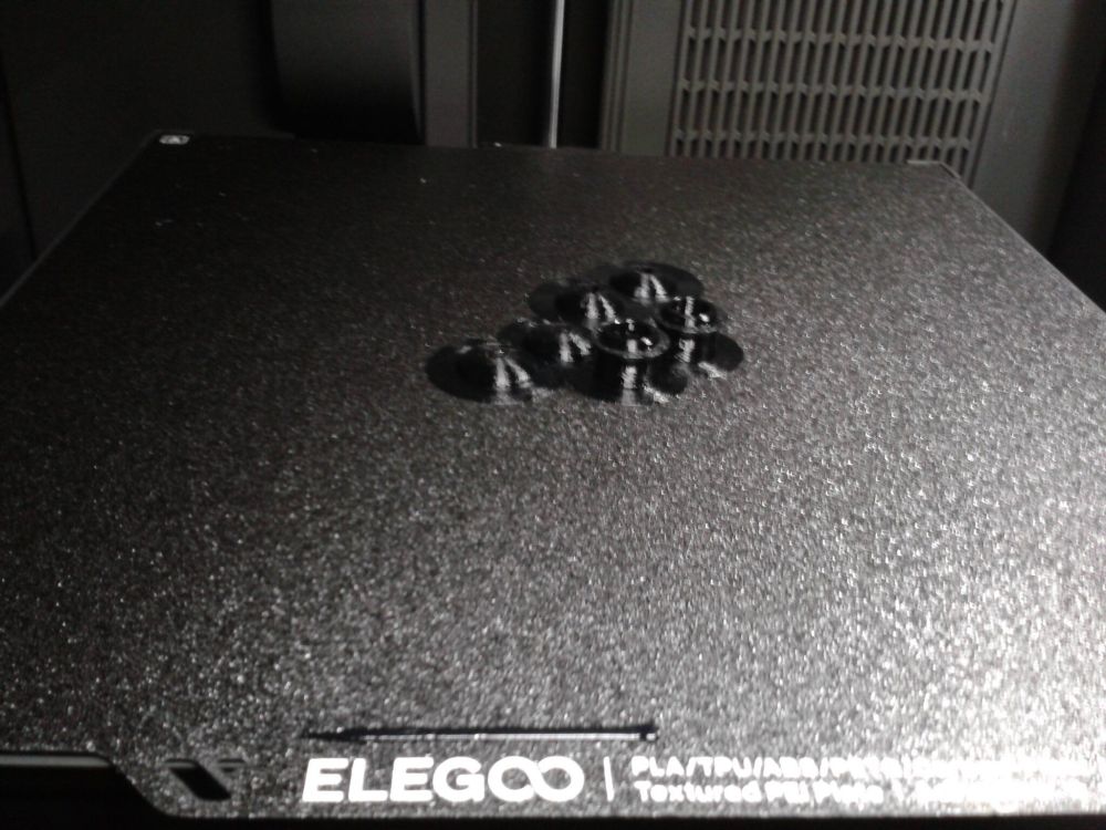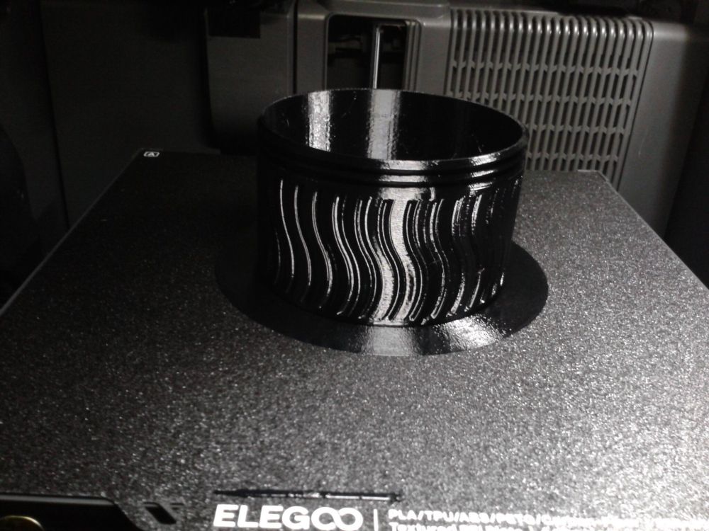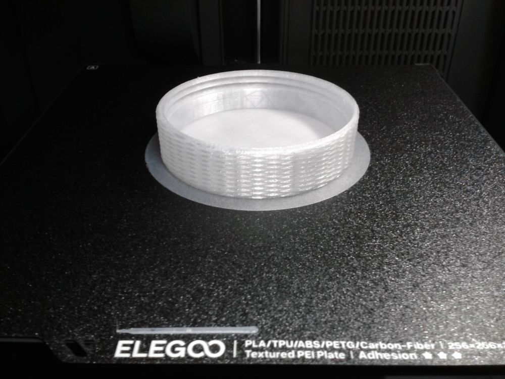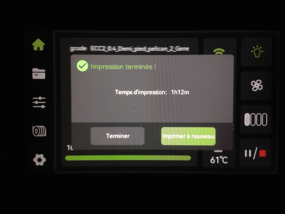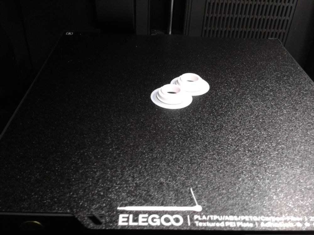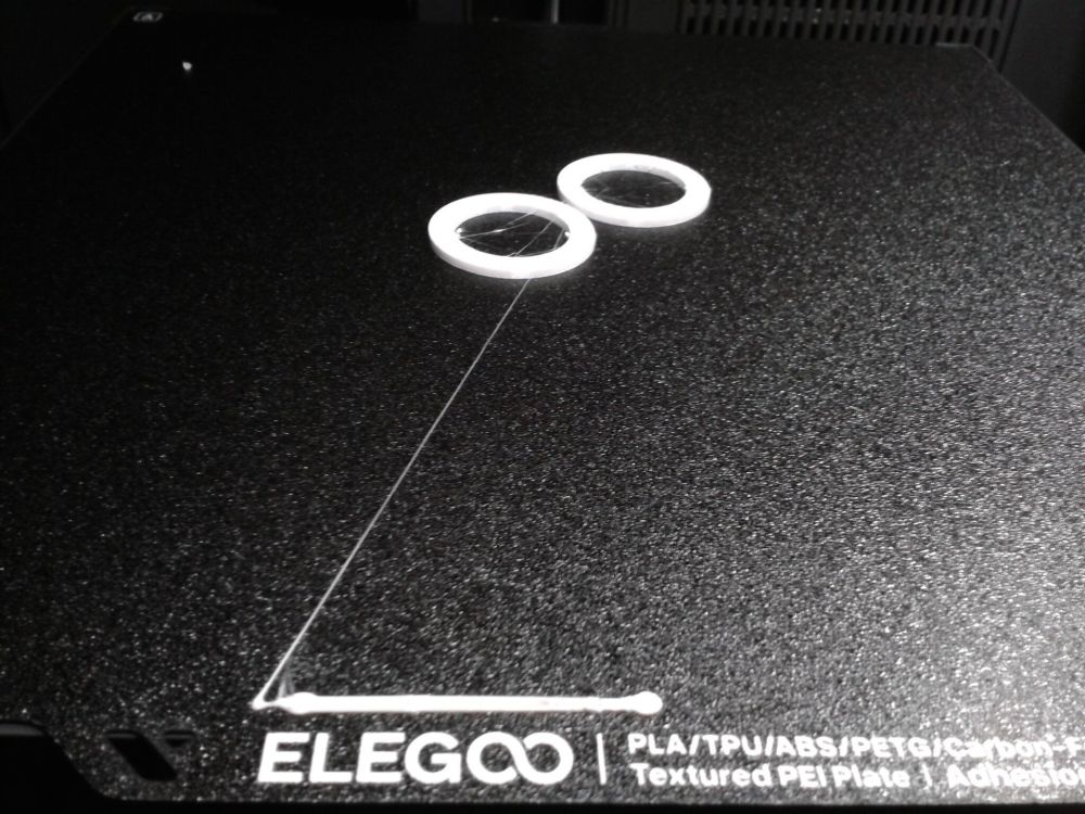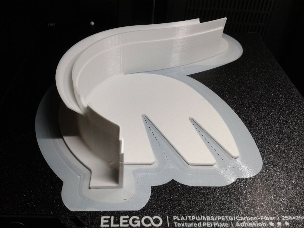 Autres impressions - PC Je n'avais pas vraiment d'expérience d'impressions avec des filaments de PC ( sauf un rapide essai avec du PCTG Vert ArianePlast fait lors de mon test de la Qidi Q1 Pro ) Et donc, je connais encore mal les prérequis et points importants pour correctement imprimer des filaments PC. Filaments utilisés pour ses impressions PC White Anycubic PC Black Anycubic PC Translucent White Anycubic Je me suis basé sur les spécifications du constructeur des filaments PC utilisés ( https://store.anycubic.com/products/pc-filament > buse 270-290°C, plateau 100-120°C, MVS 12 mm³/s, sécher la bobine avant utilisation 8-12 h à 80°C ) Je ne sais pas s'il y a des, ou quelles sont les, températures recommandées pour l'enceinte lors de l'impression de ce filament PC. Je suis partie du principe que pour limiter le gauchissement ou "warping", il fallait chercher à avoir dans l'enceinte la plus haute température que je pouvais obtenir dans la pièce à ~17°C où j'utilisais cette machine. Et j'ai donc grossièrement isolé l'imprimante avec les mousses de transport de l'imprimante et en plaçant à touche-touche de l'imprimante le sécheur de filament Creality Space Pi utilisé pour sécher à 70°C (température maximum sur ce sécheur) la bobine de filament PC en cours d'impression. sylo • container - h3liØ https://www.nexprint.com/en/models/G2102568 Pour mon premier essai d'impression avec un de ces filaments PC, J'ai utilisé le profil filament "Generic PC @Elegoo" (buse 270°C, plateau 110°C, MVS 12 mm³/s, flow 0.98 %) de Elegoo Slicer v1.3.2.9. Comme j'utilisais un filament transparent, j'ai voulu voir si en réimprimant le même modèle avec les mêmes paramètres mais à 290°C au lieu de 270°C j'obtenais ou non une meilleure transparence. Donc là, j'ai utilisé le profil filament "Generic PC @Elegoo" modifié (buse 290°C au lieu de 270°C, plateau 110°C, MVS 12 mm³/s, flow 0.98 %) de Elegoo Slicer v1.3.2.9. Il ne semble pas y avoir de différence visible au niveau de la transparence entre l'impression à 270°C et l'impression à 290°C. Pour la suite j'ai continué d'utiliser le profil filament "Generic PC @Elegoo" modifié (buse 290°C au lieu de 270°C, plateau 110°C, MVS 12 mm³/s, flow 0.98 %) de Elegoo Slicer v1.3.2.9. Les couvercles précédemment imprimés se vissent et se dévissent correctement de ces corps de boîte. Headset Holder extra wide - ArgiCZ https://www.nexprint.com/en/models/G8498722 Pelican - Lampe de chevet _ Pelican - Bedside Lamp - foxib76 https://www.thingiverse.com/thing:7275002 ( Merci à @Den76 pour ce modèle. Cf https://www.lesimprimantes3d.fr/forum/topic/64257-lampe-toucan/#findComment-658969 ) (J'ai plusieurs fois modifié les placements et orientations sur les plateaux et quelques paramètres de tranchage de certain objet du projet Elegoo Slicer que j'ai fait pour faire ses impressions… ce qui explique les possibles différences sur les captures d'écran d'Elegoo Slicer.) // On peut noter un léger gauchissement car la bordure d'impression commence à se détacher du plateau sur certaines zones. // À posteriori j'aurais dû mettre des supports d'impression sur une petite zone de cet objet ... // Et, là encore, on peut noter un léger gauchissement car la bordure d'impression commence à se détacher du plateau sur certaines zones. // À posteriori j'aurais dû mettre des supports d'impression sur une petite zone de cet objet ... // Et, là encore, on peut noter un léger gauchissement car la bordure d'impression commence à se détacher du plateau sur certaines zones. ( // Premier essai d'impression de ce plateau raté car je n'avais pas mis de bordure d'impression et les objets imprimés se sont décollés du plateau en cours d'impression. ) ( Là en TPU, CANVAS déconnecté, hub filament 4-1 démonté, capot thermique plastique enlevé, pour alimenter directement la tête d'impression avec le filament TPU. ) On peut voir que j'ai oublié de mettre des supports d'impression pour certaines zones des pieds. Et que j'ai un léger "pillowing". // J'imprime certainement trop chaud pour ce filament. Les pontages (des yeux noirs, non percés, sans supports) ne sont pas bons // J'imprime certainement trop chaud pour ce filament. Je n'ai pas encore collé, même si certaines impressions semblent avoir légèrement gauchi a l'impression ou au refroidissement, tout semble s'assembler correctement et le collage devrait rattraper les différents gauchissements ...4 points