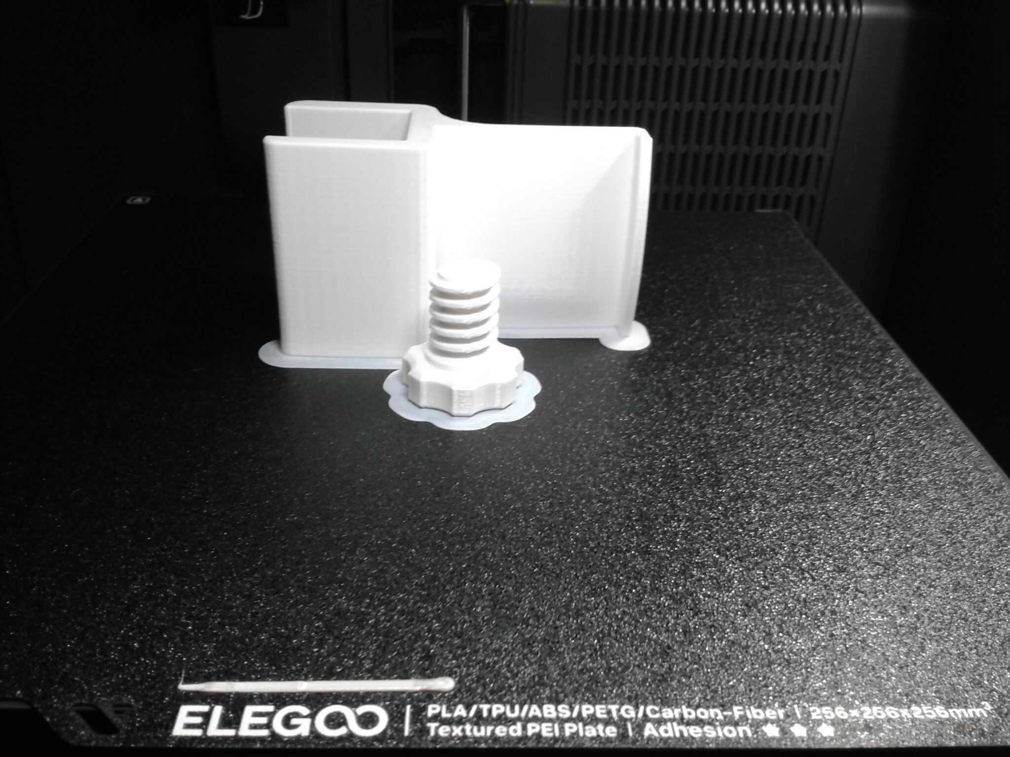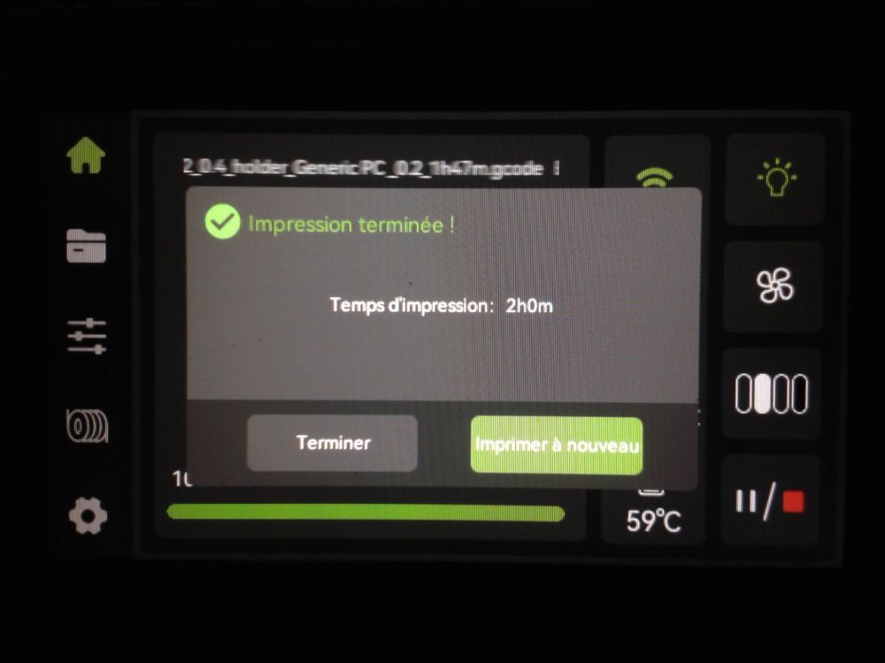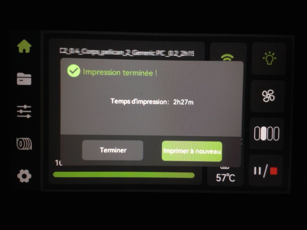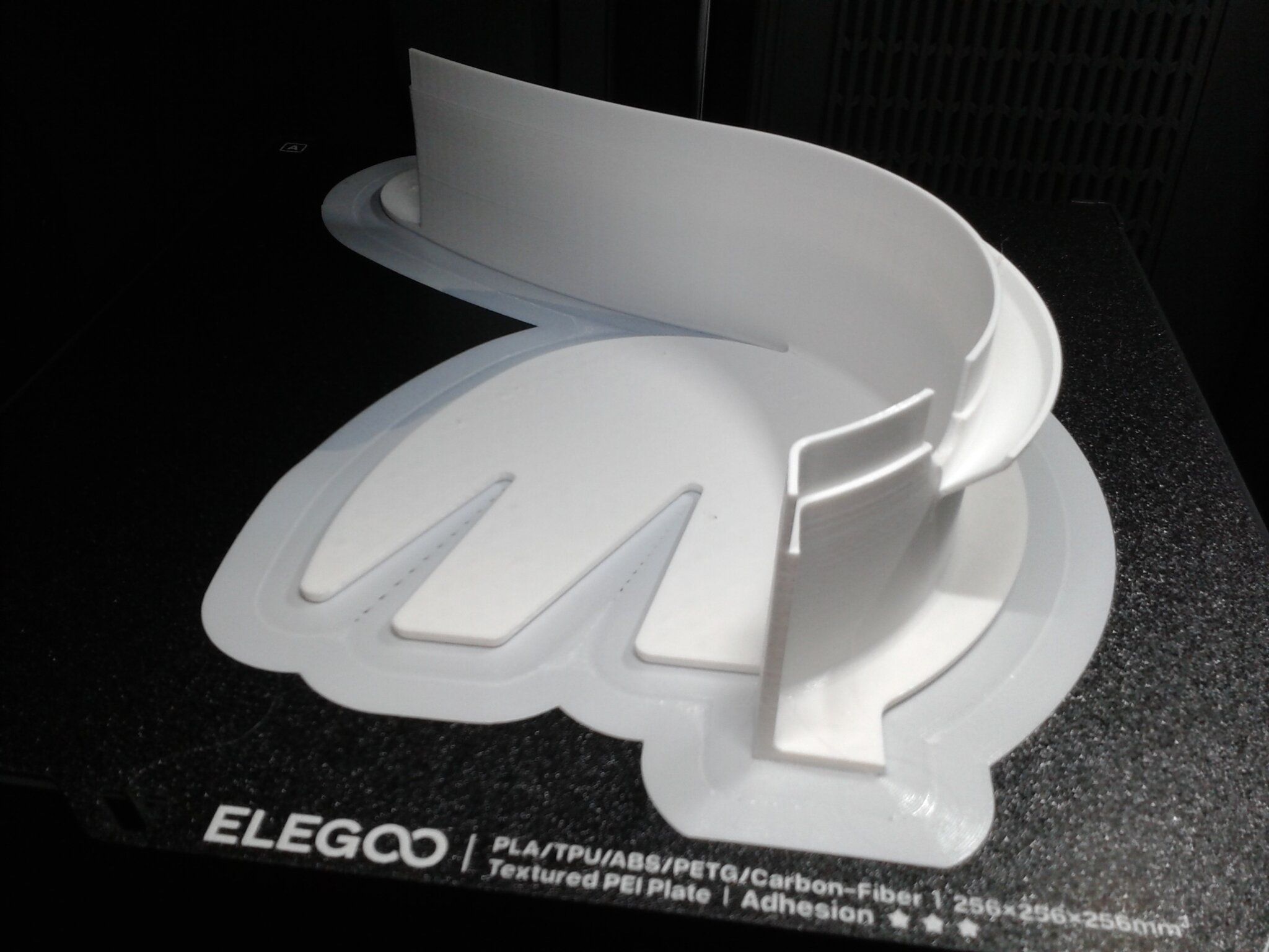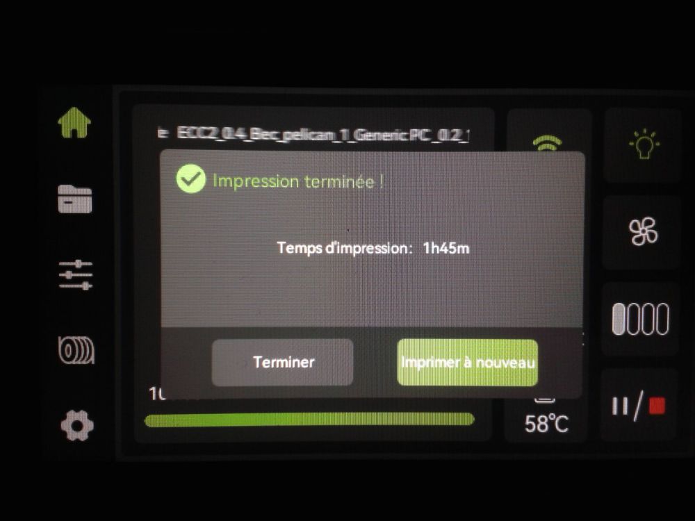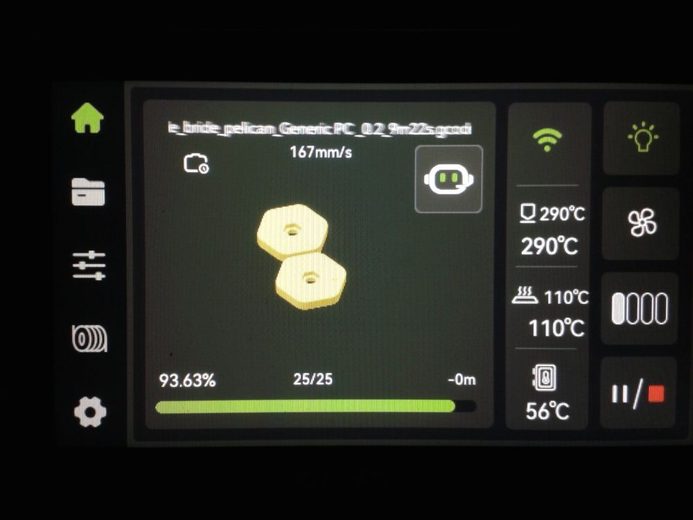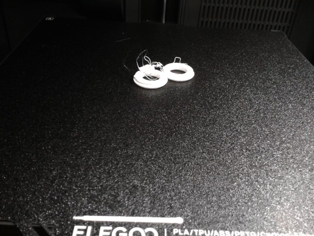 Autres impressions - PC Je n'avais pas vraiment d'expérience d'impressions avec des filaments de PC ( sauf un rapide essai avec du PCTG Vert ArianePlast fait lors de mon test de la Qidi Q1 Pro ) Et donc, je connais encore mal les prérequis et points importants pour correctement imprimer des filaments PC. Filaments utilisés pour ses impressions PC White Anycubic PC Black Anycubic PC Translucent White Anycubic Je me suis basé sur les spécifications du constructeur des filaments PC utilisés ( https://store.anycubic.com/products/pc-filament > buse 270-290°C, plateau 100-120°C, MVS 12 mm³/s, sécher la bobine avant utilisation 8-12 h à 80°C ) Je ne sais pas s'il y a des, ou quelles sont les, températures recommandées pour l'enceinte lors de l'impression de ce filament PC. Je suis partie du principe que pour limiter le gauchissement ou "warping", il fallait chercher à avoir dans l'enceinte la plus haute température que je pouvais obtenir dans la pièce à ~17°C où j'utilisais cette machine. Et j'ai donc grossièrement isolé l'imprimante avec les mousses de transport de l'imprimante et en plaçant à touche-touche de l'imprimante le sécheur de filament Creality Space Pi utilisé pour sécher à 70°C (température maximum sur ce sécheur) la bobine de filament PC en cours d'impression. sylo • container - h3liØ https://www.nexprint.com/en/models/G2102568 Pour mon premier essai d'impression avec un de ces filaments PC, J'ai utilisé le profil filament "Generic PC @Elegoo" (buse 270°C, plateau 110°C, MVS 12 mm³/s, flow 0.98 %) de Elegoo Slicer v1.3.2.9. Comme j'utilisais un filament transparent, j'ai voulu voir si en réimprimant le même modèle avec les mêmes paramètres mais à 290°C au lieu de 270°C j'obtenais ou non une meilleure transparence. Donc là, j'ai utilisé le profil filament "Generic PC @Elegoo" modifié (buse 290°C au lieu de 270°C, plateau 110°C, MVS 12 mm³/s, flow 0.98 %) de Elegoo Slicer v1.3.2.9. Il ne semble pas y avoir de différence visible au niveau de la transparence entre l'impression à 270°C et l'impression à 290°C. Pour la suite j'ai continué d'utiliser le profil filament "Generic PC @Elegoo" modifié (buse 290°C au lieu de 270°C, plateau 110°C, MVS 12 mm³/s, flow 0.98 %) de Elegoo Slicer v1.3.2.9. Les couvercles précédemment imprimés se vissent et se dévissent correctement de ces corps de boîte. Headset Holder extra wide - ArgiCZ https://www.nexprint.com/en/models/G8498722 Pelican - Lampe de chevet _ Pelican - Bedside Lamp - foxib76 https://www.thingiverse.com/thing:7275002 ( Merci à @Den76 pour ce modèle. Cf https://www.lesimprimantes3d.fr/forum/topic/64257-lampe-toucan/#findComment-658969 ) (J'ai plusieurs fois modifié les placements et orientations sur les plateaux et quelques paramètres de tranchage de certain objet du projet Elegoo Slicer que j'ai fait pour faire ses impressions… ce qui explique les possibles différences sur les captures d'écran d'Elegoo Slicer.) // On peut noter un léger gauchissement car la bordure d'impression commence à se détacher du plateau sur certaines zones. // À posteriori j'aurais dû mettre des supports d'impression sur une petite zone de cet objet ... // Et, là encore, on peut noter un léger gauchissement car la bordure d'impression commence à se détacher du plateau sur certaines zones. // À posteriori j'aurais dû mettre des supports d'impression sur une petite zone de cet objet ... // Et, là encore, on peut noter un léger gauchissement car la bordure d'impression commence à se détacher du plateau sur certaines zones. ( // Premier essai d'impression de ce plateau raté car je n'avais pas mis de bordure d'impression et les objets imprimés se sont décollés du plateau en cours d'impression. ) ( Là en TPU, CANVAS déconnecté, hub filament 4-1 démonté, capot thermique plastique enlevé, pour alimenter directement la tête d'impression avec le filament TPU. ) On peut voir que j'ai oublié de mettre des supports d'impression pour certaines zones des pieds. Et que j'ai un léger "pillowing". // J'imprime certainement trop chaud pour ce filament. Les pontages (des yeux noirs, non percés, sans supports) ne sont pas bons // J'imprime certainement trop chaud pour ce filament. Je n'ai pas encore collé, même si certaines impressions semblent avoir légèrement gauchi a l'impression ou au refroidissement, tout semble s'assembler correctement et le collage devrait rattraper les différents gauchissements ...4 points