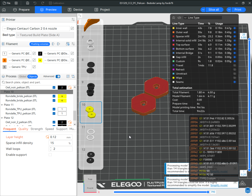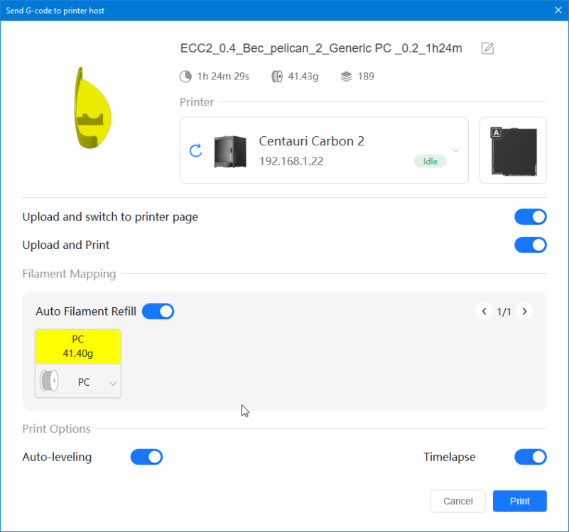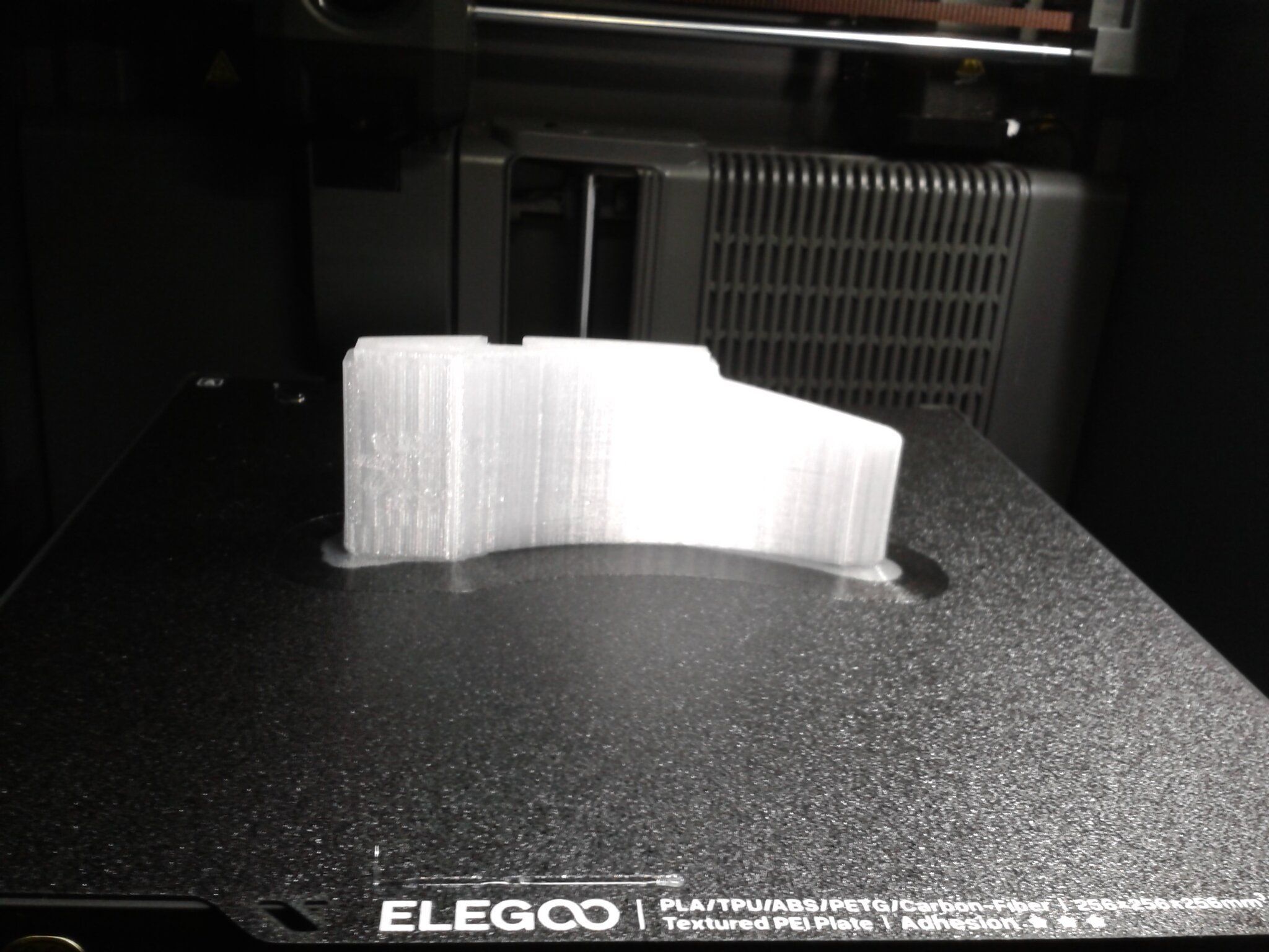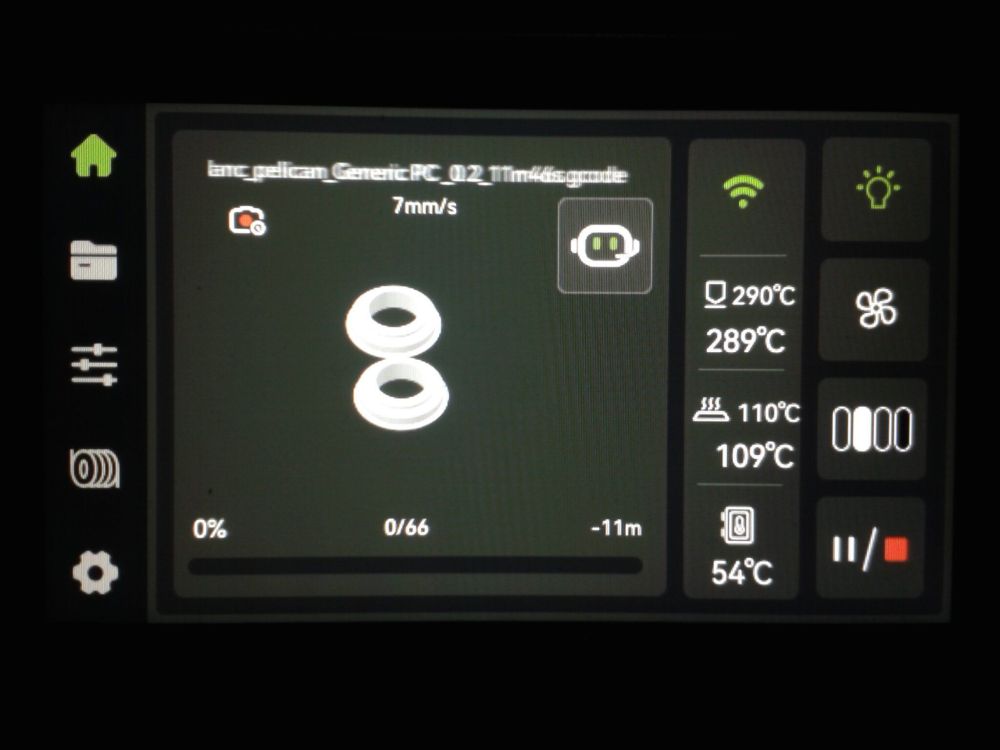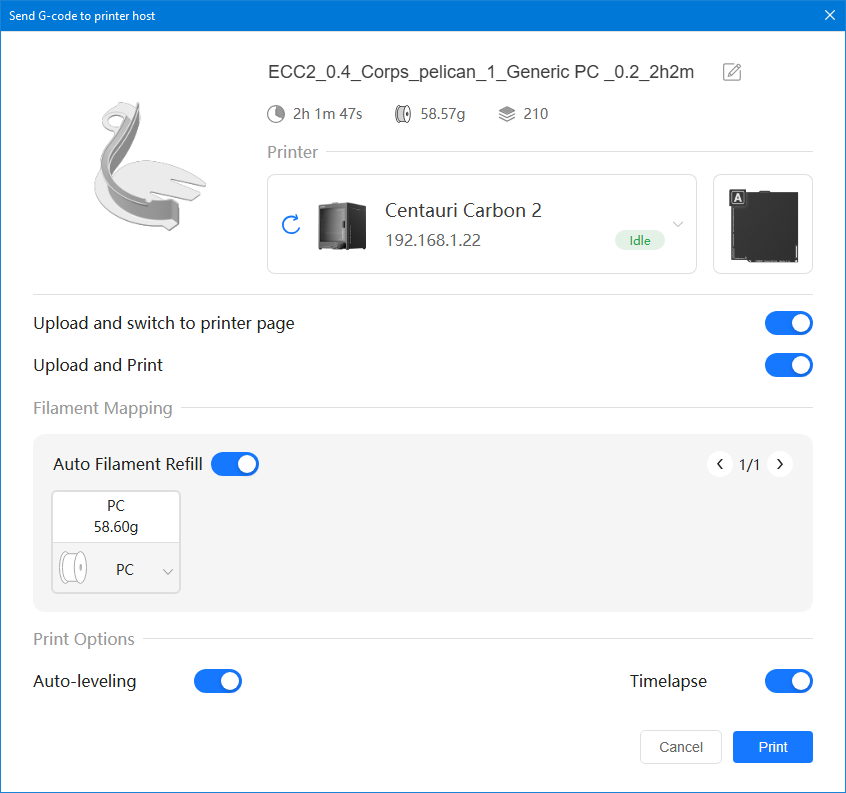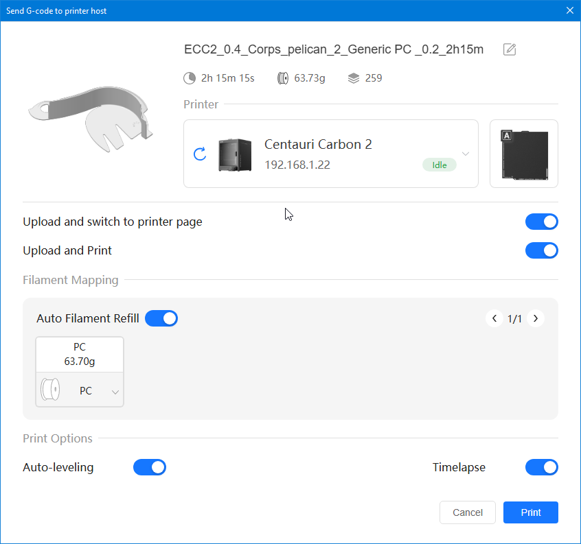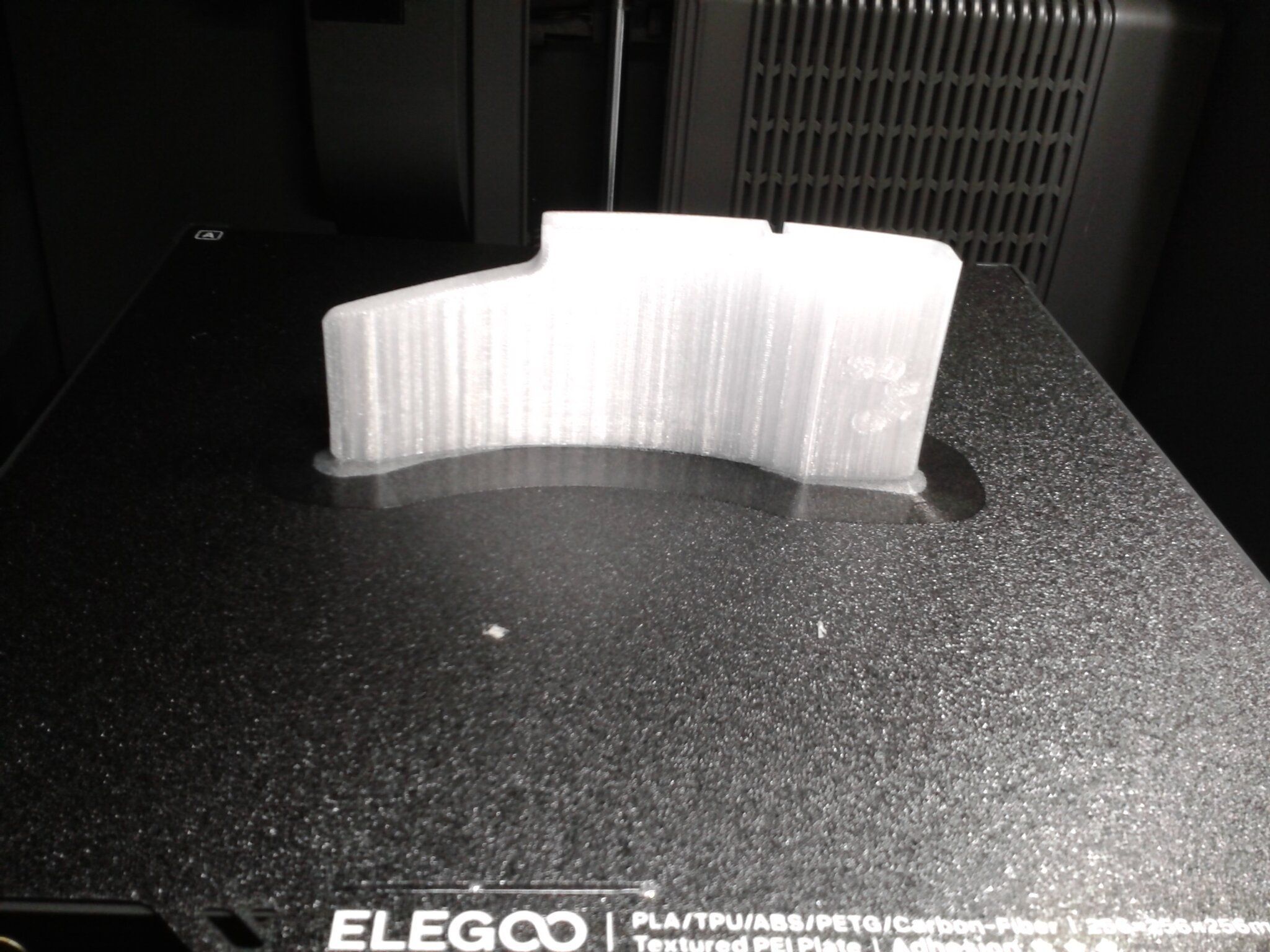 Autres impressions - PC Je n'avais pas vraiment d'expérience d'impressions avec des filaments de PC ( sauf un rapide essai avec du PCTG Vert ArianePlast fait lors de mon test de la Qidi Q1 Pro ) Et donc, je connais encore mal les prérequis et points importants pour correctement imprimer des filaments PC. Filaments utilisés pour ses impressions PC White Anycubic PC Black Anycubic PC Translucent White Anycubic Je me suis basé sur les spécifications du constructeur des filaments PC utilisés ( https://store.anycubic.com/products/pc-filament > buse 270-290°C, plateau 100-120°C, MVS 12 mm³/s, sécher la bobine avant utilisation 8-12 h à 80°C ) Je ne sais pas s'il y a des, ou quelles sont les, températures recommandées pour l'enceinte lors de l'impression de ce filament PC. Je suis partie du principe que pour limiter le gauchissement ou "warping", il fallait chercher à avoir dans l'enceinte la plus haute température que je pouvais obtenir dans la pièce à ~17°C où j'utilisais cette machine. Et j'ai donc grossièrement isolé l'imprimante avec les mousses de transport de l'imprimante et en plaçant à touche-touche de l'imprimante le sécheur de filament Creality Space Pi utilisé pour sécher à 70°C (température maximum sur ce sécheur) la bobine de filament PC en cours d'impression. sylo • container - h3liØ https://www.nexprint.com/en/models/G2102568 Pour mon premier essai d'impression avec un de ces filaments PC, J'ai utilisé le profil filament "Generic PC @Elegoo" (buse 270°C, plateau 110°C, MVS 12 mm³/s, flow 0.98 %) de Elegoo Slicer v1.3.2.9. Comme j'utilisais un filament transparent, j'ai voulu voir si en réimprimant le même modèle avec les mêmes paramètres mais à 290°C au lieu de 270°C j'obtenais ou non une meilleure transparence. Donc là, j'ai utilisé le profil filament "Generic PC @Elegoo" modifié (buse 290°C au lieu de 270°C, plateau 110°C, MVS 12 mm³/s, flow 0.98 %) de Elegoo Slicer v1.3.2.9. Il ne semble pas y avoir de différence visible au niveau de la transparence entre l'impression à 270°C et l'impression à 290°C. Pour la suite j'ai continué d'utiliser le profil filament "Generic PC @Elegoo" modifié (buse 290°C au lieu de 270°C, plateau 110°C, MVS 12 mm³/s, flow 0.98 %) de Elegoo Slicer v1.3.2.9. Les couvercles précédemment imprimés se vissent et se dévissent correctement de ces corps de boîte. Headset Holder extra wide - ArgiCZ https://www.nexprint.com/en/models/G8498722 Pelican - Lampe de chevet _ Pelican - Bedside Lamp - foxib76 https://www.thingiverse.com/thing:7275002 ( Merci à @Den76 pour ce modèle. Cf https://www.lesimprimantes3d.fr/forum/topic/64257-lampe-toucan/#findComment-658969 ) (J'ai plusieurs fois modifié les placements et orientations sur les plateaux et quelques paramètres de tranchage de certain objet du projet Elegoo Slicer que j'ai fait pour faire ses impressions… ce qui explique les possibles différences sur les captures d'écran d'Elegoo Slicer.) // On peut noter un léger gauchissement car la bordure d'impression commence à se détacher du plateau sur certaines zones. // À posteriori j'aurais dû mettre des supports d'impression sur une petite zone de cet objet ... // Et, là encore, on peut noter un léger gauchissement car la bordure d'impression commence à se détacher du plateau sur certaines zones. // À posteriori j'aurais dû mettre des supports d'impression sur une petite zone de cet objet ... // Et, là encore, on peut noter un léger gauchissement car la bordure d'impression commence à se détacher du plateau sur certaines zones. ( // Premier essai d'impression de ce plateau raté car je n'avais pas mis de bordure d'impression et les objets imprimés se sont décollés du plateau en cours d'impression. ) ( Là en TPU, CANVAS déconnecté, hub filament 4-1 démonté, capot thermique plastique enlevé, pour alimenter directement la tête d'impression avec le filament TPU. ) On peut voir que j'ai oublié de mettre des supports d'impression pour certaines zones des pieds. Et que j'ai un léger "pillowing". // J'imprime certainement trop chaud pour ce filament. Les pontages (des yeux noirs, non percés, sans supports) ne sont pas bons // J'imprime certainement trop chaud pour ce filament. Je n'ai pas encore collé, même si certaines impressions semblent avoir légèrement gauchi a l'impression ou au refroidissement, tout semble s'assembler correctement et le collage devrait rattraper les différents gauchissements ...4 points