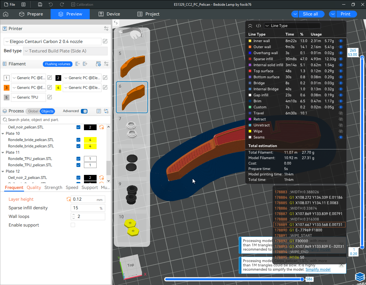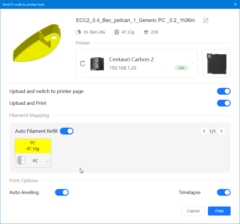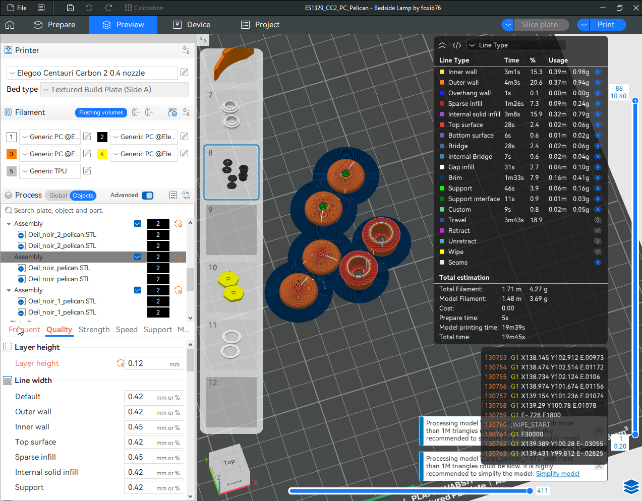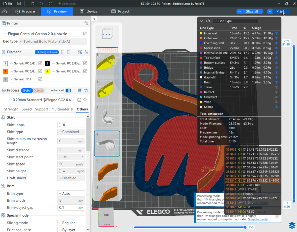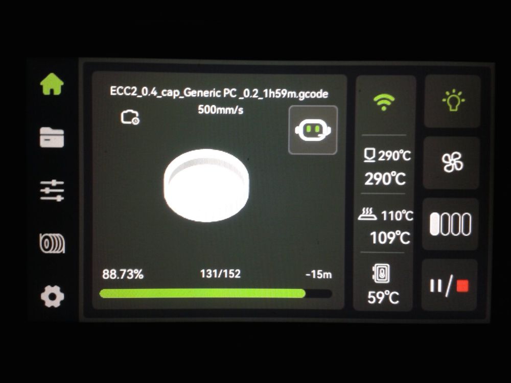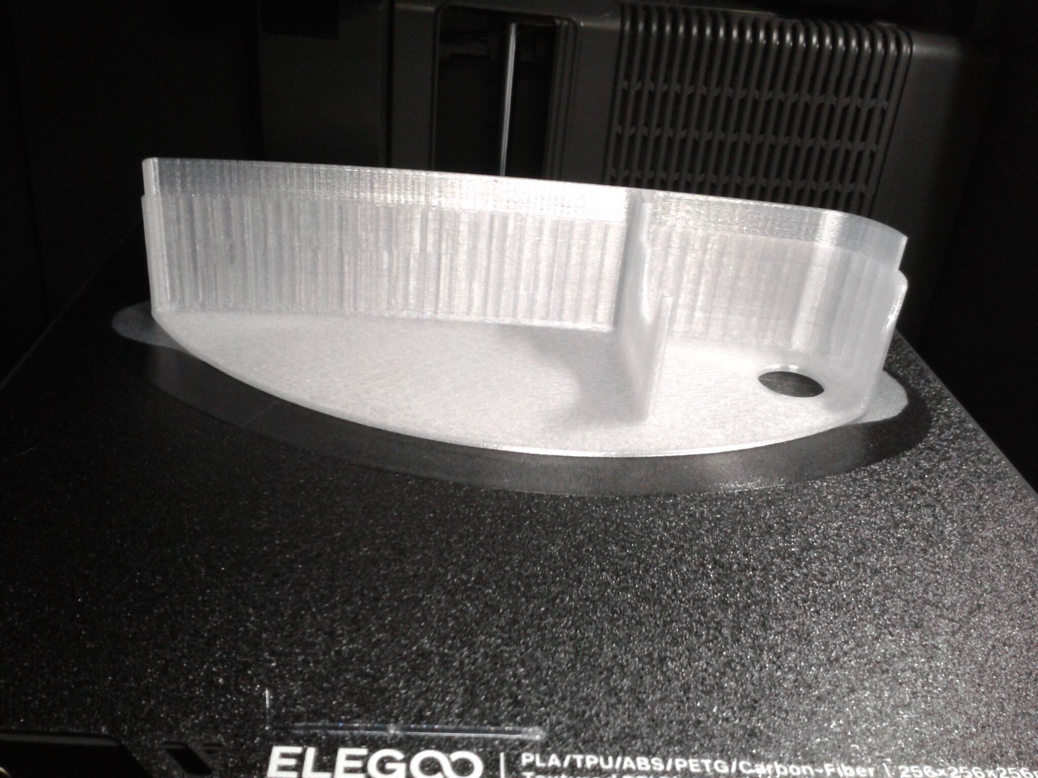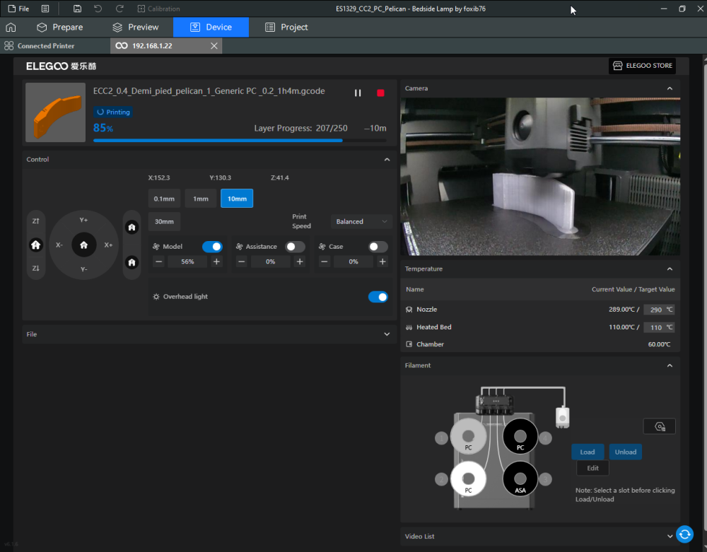 Autres impressions - PC Je n'avais pas vraiment d'expérience d'impressions avec des filaments de PC ( sauf un rapide essai avec du PCTG Vert ArianePlast fait lors de mon test de la Qidi Q1 Pro ) Et donc, je connais encore mal les prérequis et points importants pour correctement imprimer des filaments PC. Filaments utilisés pour ses impressions PC White Anycubic PC Black Anycubic PC Translucent White Anycubic Je me suis basé sur les spécifications du constructeur des filaments PC utilisés ( https://store.anycubic.com/products/pc-filament > buse 270-290°C, plateau 100-120°C, MVS 12 mm³/s, sécher la bobine avant utilisation 8-12 h à 80°C ) Je ne sais pas s'il y a des, ou quelles sont les, températures recommandées pour l'enceinte lors de l'impression de ce filament PC. Je suis partie du principe que pour limiter le gauchissement ou "warping", il fallait chercher à avoir dans l'enceinte la plus haute température que je pouvais obtenir dans la pièce à ~17°C où j'utilisais cette machine. Et j'ai donc grossièrement isolé l'imprimante avec les mousses de transport de l'imprimante et en plaçant à touche-touche de l'imprimante le sécheur de filament Creality Space Pi utilisé pour sécher à 70°C (température maximum sur ce sécheur) la bobine de filament PC en cours d'impression. sylo • container - h3liØ https://www.nexprint.com/en/models/G2102568 Pour mon premier essai d'impression avec un de ces filaments PC, J'ai utilisé le profil filament "Generic PC @Elegoo" (buse 270°C, plateau 110°C, MVS 12 mm³/s, flow 0.98 %) de Elegoo Slicer v1.3.2.9. Comme j'utilisais un filament transparent, j'ai voulu voir si en réimprimant le même modèle avec les mêmes paramètres mais à 290°C au lieu de 270°C j'obtenais ou non une meilleure transparence. Donc là, j'ai utilisé le profil filament "Generic PC @Elegoo" modifié (buse 290°C au lieu de 270°C, plateau 110°C, MVS 12 mm³/s, flow 0.98 %) de Elegoo Slicer v1.3.2.9. Il ne semble pas y avoir de différence visible au niveau de la transparence entre l'impression à 270°C et l'impression à 290°C. Pour la suite j'ai continué d'utiliser le profil filament "Generic PC @Elegoo" modifié (buse 290°C au lieu de 270°C, plateau 110°C, MVS 12 mm³/s, flow 0.98 %) de Elegoo Slicer v1.3.2.9. Les couvercles précédemment imprimés se vissent et se dévissent correctement de ces corps de boîte. Headset Holder extra wide - ArgiCZ https://www.nexprint.com/en/models/G8498722 Pelican - Lampe de chevet _ Pelican - Bedside Lamp - foxib76 https://www.thingiverse.com/thing:7275002 ( Merci à @Den76 pour ce modèle. Cf https://www.lesimprimantes3d.fr/forum/topic/64257-lampe-toucan/#findComment-658969 ) (J'ai plusieurs fois modifié les placements et orientations sur les plateaux et quelques paramètres de tranchage de certain objet du projet Elegoo Slicer que j'ai fait pour faire ses impressions… ce qui explique les possibles différences sur les captures d'écran d'Elegoo Slicer.) // On peut noter un léger gauchissement car la bordure d'impression commence à se détacher du plateau sur certaines zones. // À posteriori j'aurais dû mettre des supports d'impression sur une petite zone de cet objet ... // Et, là encore, on peut noter un léger gauchissement car la bordure d'impression commence à se détacher du plateau sur certaines zones. // À posteriori j'aurais dû mettre des supports d'impression sur une petite zone de cet objet ... // Et, là encore, on peut noter un léger gauchissement car la bordure d'impression commence à se détacher du plateau sur certaines zones. ( // Premier essai d'impression de ce plateau raté car je n'avais pas mis de bordure d'impression et les objets imprimés se sont décollés du plateau en cours d'impression. ) ( Là en TPU, CANVAS déconnecté, hub filament 4-1 démonté, capot thermique plastique enlevé, pour alimenter directement la tête d'impression avec le filament TPU. ) On peut voir que j'ai oublié de mettre des supports d'impression pour certaines zones des pieds. Et que j'ai un léger "pillowing". // J'imprime certainement trop chaud pour ce filament. Les pontages (des yeux noirs, non percés, sans supports) ne sont pas bons // J'imprime certainement trop chaud pour ce filament. Je n'ai pas encore collé, même si certaines impressions semblent avoir légèrement gauchi a l'impression ou au refroidissement, tout semble s'assembler correctement et le collage devrait rattraper les différents gauchissements ...4 points