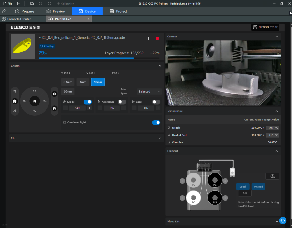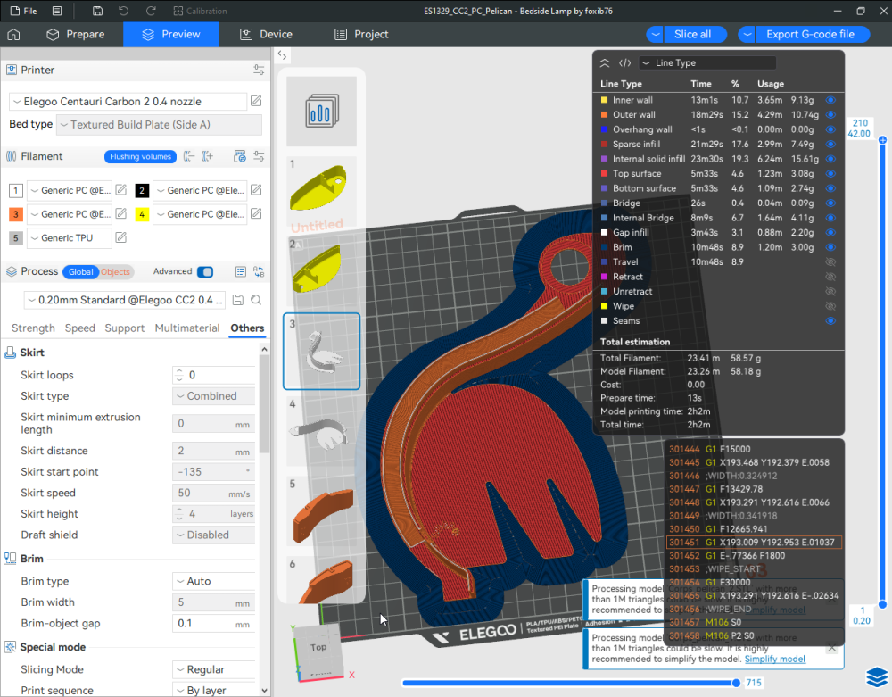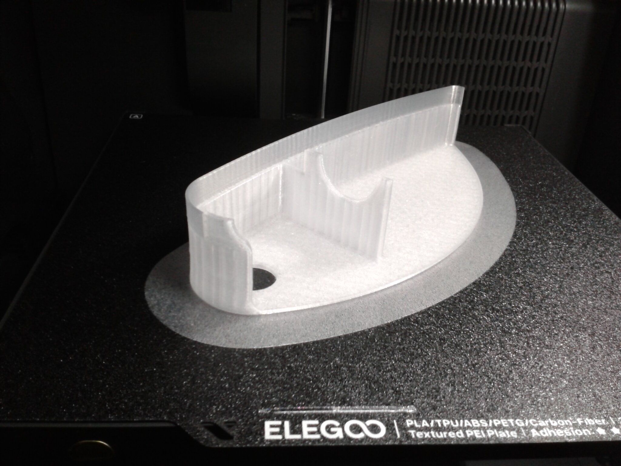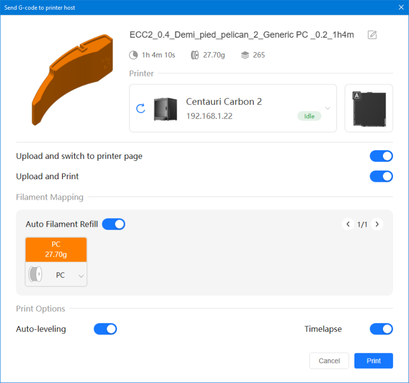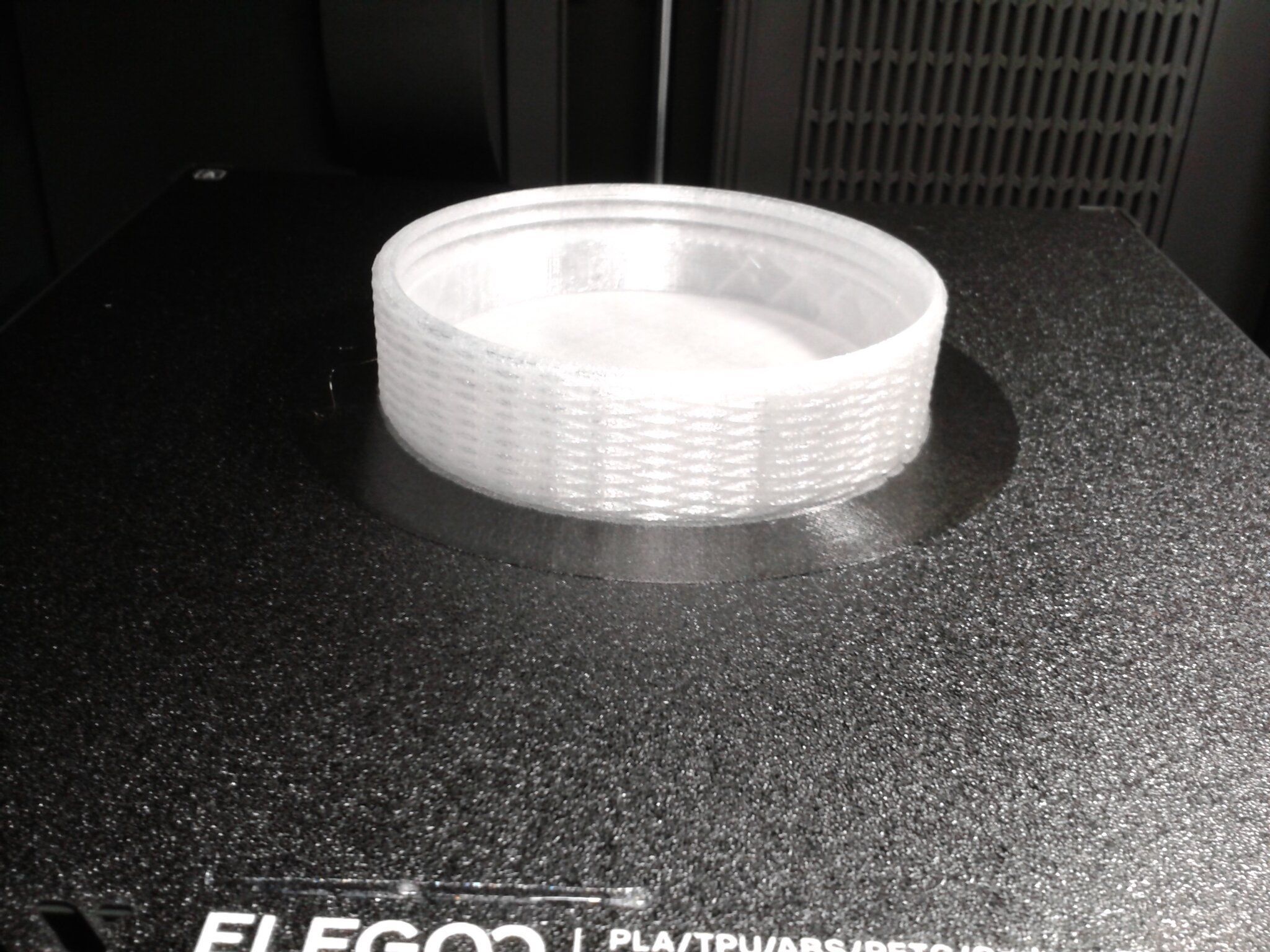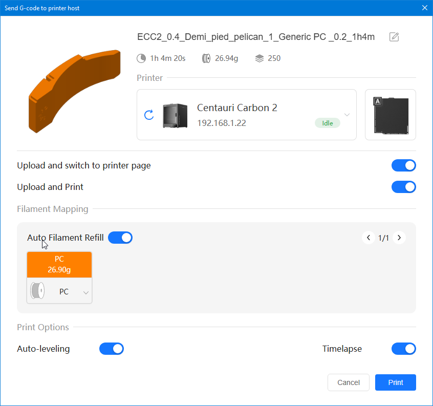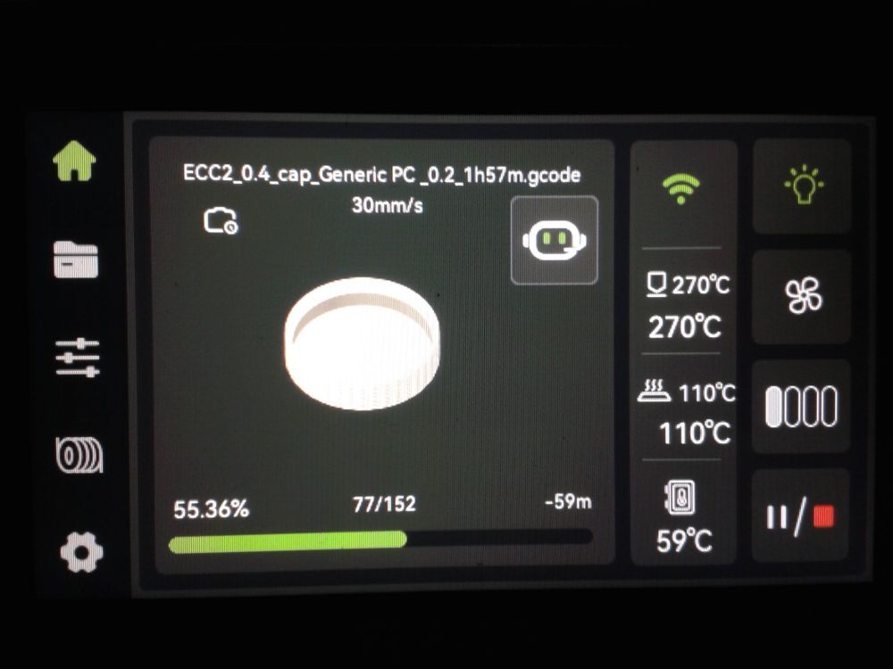 Autres impressions - PC Je n'avais pas vraiment d'expérience d'impressions avec des filaments de PC ( sauf un rapide essai avec du PCTG Vert ArianePlast fait lors de mon test de la Qidi Q1 Pro ) Et donc, je connais encore mal les prérequis et points importants pour correctement imprimer des filaments PC. Filaments utilisés pour ses impressions PC White Anycubic PC Black Anycubic PC Translucent White Anycubic Je me suis basé sur les spécifications du constructeur des filaments PC utilisés ( https://store.anycubic.com/products/pc-filament > buse 270-290°C, plateau 100-120°C, MVS 12 mm³/s, sécher la bobine avant utilisation 8-12 h à 80°C ) Je ne sais pas s'il y a des, ou quelles sont les, températures recommandées pour l'enceinte lors de l'impression de ce filament PC. Je suis partie du principe que pour limiter le gauchissement ou "warping", il fallait chercher à avoir dans l'enceinte la plus haute température que je pouvais obtenir dans la pièce à ~17°C où j'utilisais cette machine. Et j'ai donc grossièrement isolé l'imprimante avec les mousses de transport de l'imprimante et en plaçant à touche-touche de l'imprimante le sécheur de filament Creality Space Pi utilisé pour sécher à 70°C (température maximum sur ce sécheur) la bobine de filament PC en cours d'impression. sylo • container - h3liØ https://www.nexprint.com/en/models/G2102568 Pour mon premier essai d'impression avec un de ces filaments PC, J'ai utilisé le profil filament "Generic PC @Elegoo" (buse 270°C, plateau 110°C, MVS 12 mm³/s, flow 0.98 %) de Elegoo Slicer v1.3.2.9. Comme j'utilisais un filament transparent, j'ai voulu voir si en réimprimant le même modèle avec les mêmes paramètres mais à 290°C au lieu de 270°C j'obtenais ou non une meilleure transparence. Donc là, j'ai utilisé le profil filament "Generic PC @Elegoo" modifié (buse 290°C au lieu de 270°C, plateau 110°C, MVS 12 mm³/s, flow 0.98 %) de Elegoo Slicer v1.3.2.9. Il ne semble pas y avoir de différence visible au niveau de la transparence entre l'impression à 270°C et l'impression à 290°C. Pour la suite j'ai continué d'utiliser le profil filament "Generic PC @Elegoo" modifié (buse 290°C au lieu de 270°C, plateau 110°C, MVS 12 mm³/s, flow 0.98 %) de Elegoo Slicer v1.3.2.9. Les couvercles précédemment imprimés se vissent et se dévissent correctement de ces corps de boîte. Headset Holder extra wide - ArgiCZ https://www.nexprint.com/en/models/G8498722 Pelican - Lampe de chevet _ Pelican - Bedside Lamp - foxib76 https://www.thingiverse.com/thing:7275002 ( Merci à @Den76 pour ce modèle. Cf https://www.lesimprimantes3d.fr/forum/topic/64257-lampe-toucan/#findComment-658969 ) (J'ai plusieurs fois modifié les placements et orientations sur les plateaux et quelques paramètres de tranchage de certain objet du projet Elegoo Slicer que j'ai fait pour faire ses impressions… ce qui explique les possibles différences sur les captures d'écran d'Elegoo Slicer.) // On peut noter un léger gauchissement car la bordure d'impression commence à se détacher du plateau sur certaines zones. // À posteriori j'aurais dû mettre des supports d'impression sur une petite zone de cet objet ... // Et, là encore, on peut noter un léger gauchissement car la bordure d'impression commence à se détacher du plateau sur certaines zones. // À posteriori j'aurais dû mettre des supports d'impression sur une petite zone de cet objet ... // Et, là encore, on peut noter un léger gauchissement car la bordure d'impression commence à se détacher du plateau sur certaines zones. ( // Premier essai d'impression de ce plateau raté car je n'avais pas mis de bordure d'impression et les objets imprimés se sont décollés du plateau en cours d'impression. ) ( Là en TPU, CANVAS déconnecté, hub filament 4-1 démonté, capot thermique plastique enlevé, pour alimenter directement la tête d'impression avec le filament TPU. ) On peut voir que j'ai oublié de mettre des supports d'impression pour certaines zones des pieds. Et que j'ai un léger "pillowing". // J'imprime certainement trop chaud pour ce filament. Les pontages (des yeux noirs, non percés, sans supports) ne sont pas bons // J'imprime certainement trop chaud pour ce filament. Je n'ai pas encore collé, même si certaines impressions semblent avoir légèrement gauchi a l'impression ou au refroidissement, tout semble s'assembler correctement et le collage devrait rattraper les différents gauchissements ...4 points