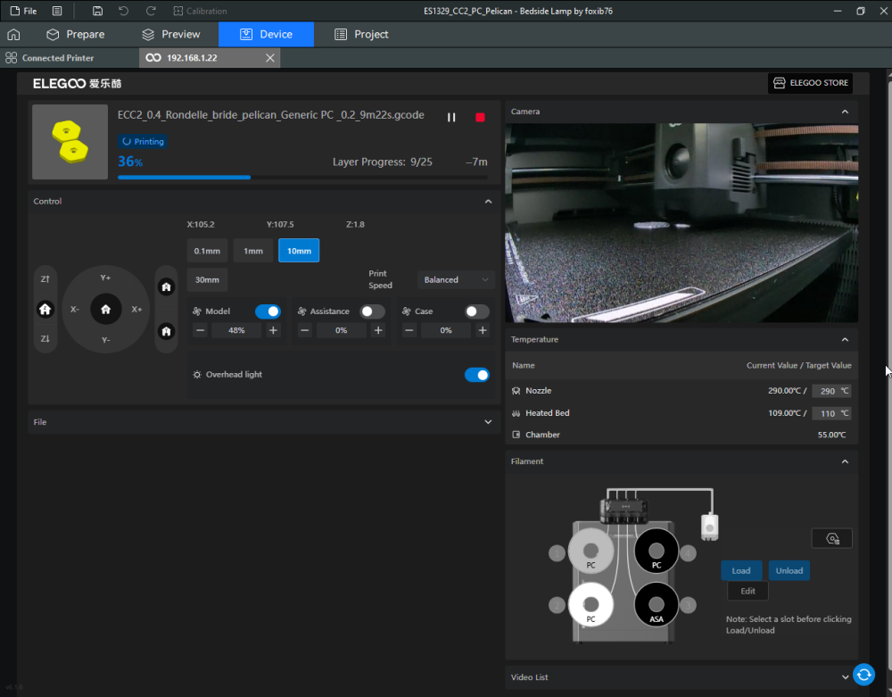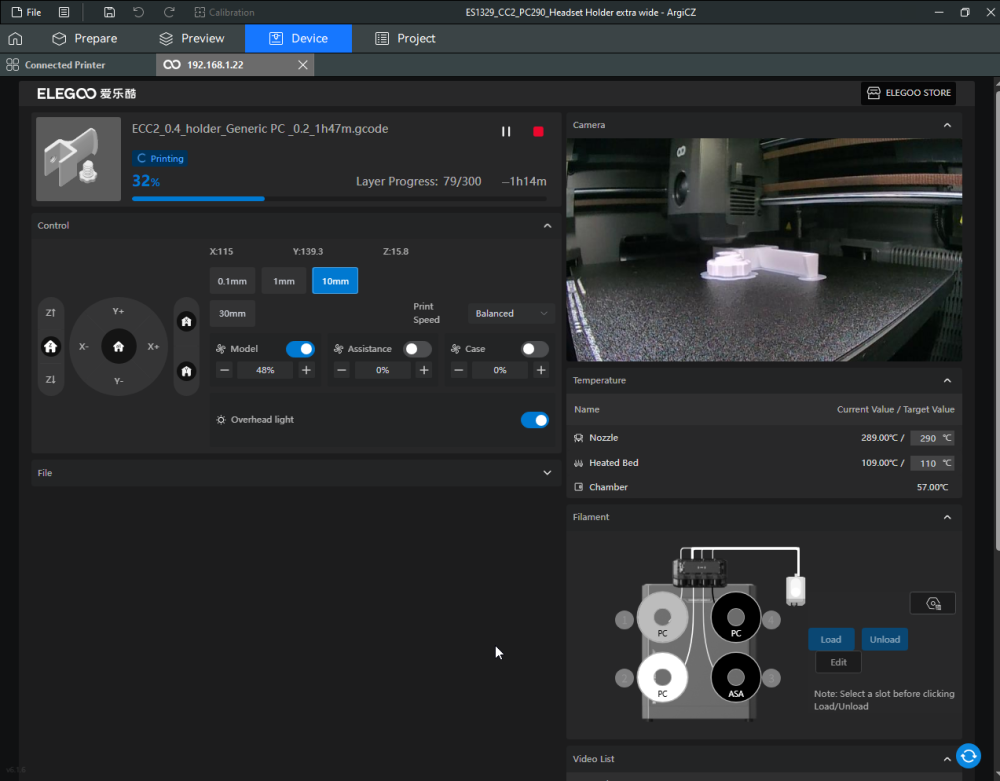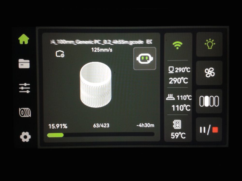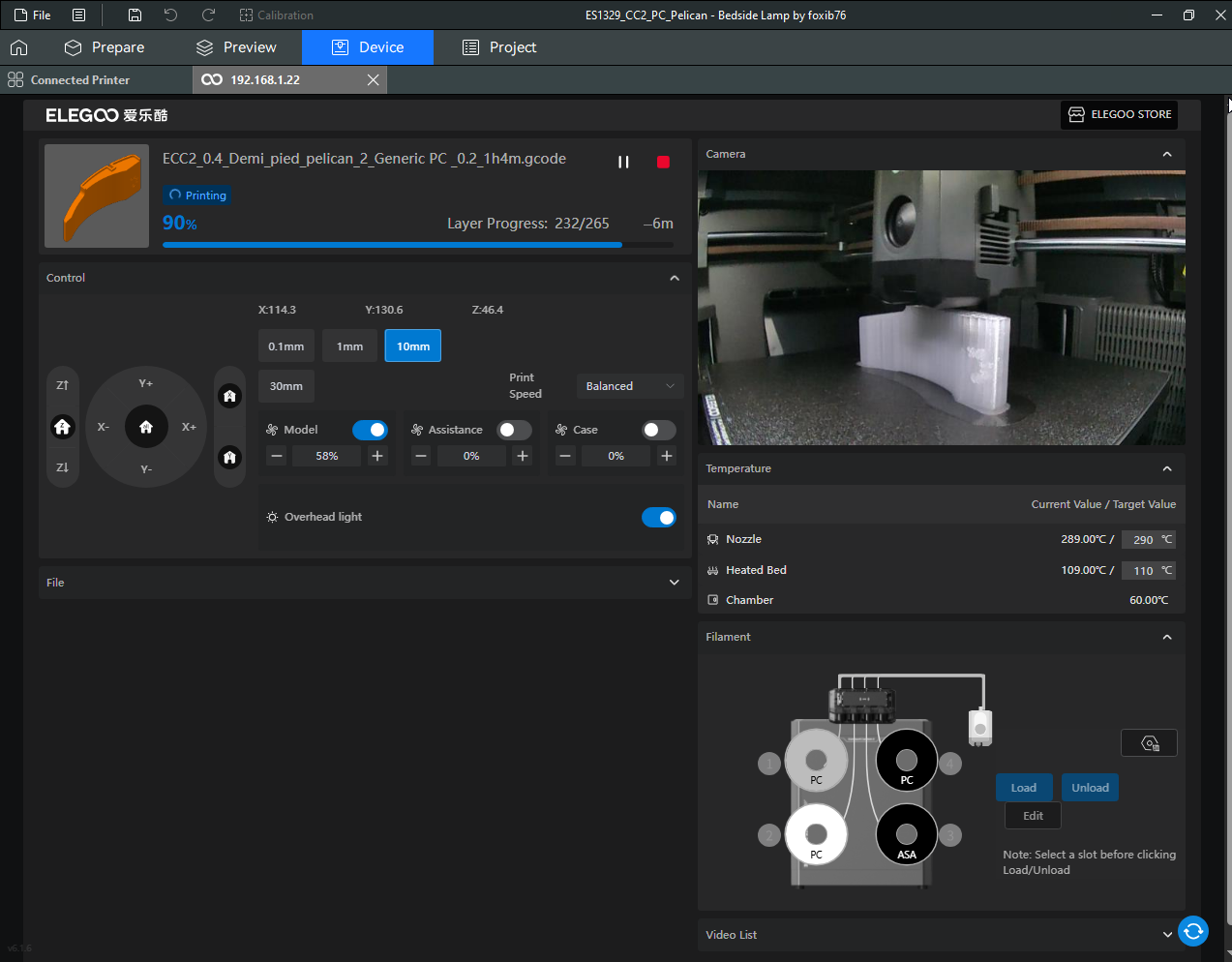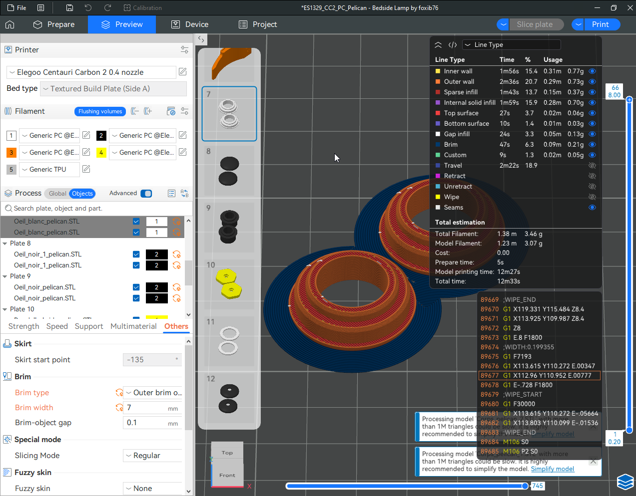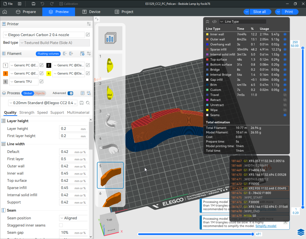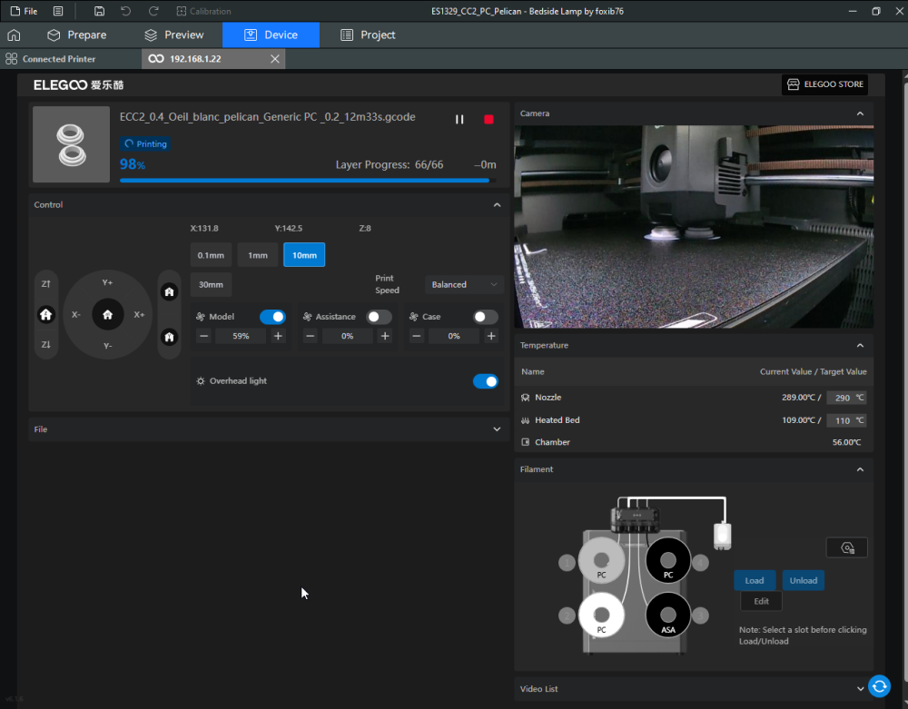 Autres impressions - PC Je n'avais pas vraiment d'expérience d'impressions avec des filaments de PC ( sauf un rapide essai avec du PCTG Vert ArianePlast fait lors de mon test de la Qidi Q1 Pro ) Et donc, je connais encore mal les prérequis et points importants pour correctement imprimer des filaments PC. Filaments utilisés pour ses impressions PC White Anycubic PC Black Anycubic PC Translucent White Anycubic Je me suis basé sur les spécifications du constructeur des filaments PC utilisés ( https://store.anycubic.com/products/pc-filament > buse 270-290°C, plateau 100-120°C, MVS 12 mm³/s, sécher la bobine avant utilisation 8-12 h à 80°C ) Je ne sais pas s'il y a des, ou quelles sont les, températures recommandées pour l'enceinte lors de l'impression de ce filament PC. Je suis partie du principe que pour limiter le gauchissement ou "warping", il fallait chercher à avoir dans l'enceinte la plus haute température que je pouvais obtenir dans la pièce à ~17°C où j'utilisais cette machine. Et j'ai donc grossièrement isolé l'imprimante avec les mousses de transport de l'imprimante et en plaçant à touche-touche de l'imprimante le sécheur de filament Creality Space Pi utilisé pour sécher à 70°C (température maximum sur ce sécheur) la bobine de filament PC en cours d'impression. sylo • container - h3liØ https://www.nexprint.com/en/models/G2102568 Pour mon premier essai d'impression avec un de ces filaments PC, J'ai utilisé le profil filament "Generic PC @Elegoo" (buse 270°C, plateau 110°C, MVS 12 mm³/s, flow 0.98 %) de Elegoo Slicer v1.3.2.9. Comme j'utilisais un filament transparent, j'ai voulu voir si en réimprimant le même modèle avec les mêmes paramètres mais à 290°C au lieu de 270°C j'obtenais ou non une meilleure transparence. Donc là, j'ai utilisé le profil filament "Generic PC @Elegoo" modifié (buse 290°C au lieu de 270°C, plateau 110°C, MVS 12 mm³/s, flow 0.98 %) de Elegoo Slicer v1.3.2.9. Il ne semble pas y avoir de différence visible au niveau de la transparence entre l'impression à 270°C et l'impression à 290°C. Pour la suite j'ai continué d'utiliser le profil filament "Generic PC @Elegoo" modifié (buse 290°C au lieu de 270°C, plateau 110°C, MVS 12 mm³/s, flow 0.98 %) de Elegoo Slicer v1.3.2.9. Les couvercles précédemment imprimés se vissent et se dévissent correctement de ces corps de boîte. Headset Holder extra wide - ArgiCZ https://www.nexprint.com/en/models/G8498722 Pelican - Lampe de chevet _ Pelican - Bedside Lamp - foxib76 https://www.thingiverse.com/thing:7275002 ( Merci à @Den76 pour ce modèle. Cf https://www.lesimprimantes3d.fr/forum/topic/64257-lampe-toucan/#findComment-658969 ) (J'ai plusieurs fois modifié les placements et orientations sur les plateaux et quelques paramètres de tranchage de certain objet du projet Elegoo Slicer que j'ai fait pour faire ses impressions… ce qui explique les possibles différences sur les captures d'écran d'Elegoo Slicer.) // On peut noter un léger gauchissement car la bordure d'impression commence à se détacher du plateau sur certaines zones. // À posteriori j'aurais dû mettre des supports d'impression sur une petite zone de cet objet ... // Et, là encore, on peut noter un léger gauchissement car la bordure d'impression commence à se détacher du plateau sur certaines zones. // À posteriori j'aurais dû mettre des supports d'impression sur une petite zone de cet objet ... // Et, là encore, on peut noter un léger gauchissement car la bordure d'impression commence à se détacher du plateau sur certaines zones. ( // Premier essai d'impression de ce plateau raté car je n'avais pas mis de bordure d'impression et les objets imprimés se sont décollés du plateau en cours d'impression. ) ( Là en TPU, CANVAS déconnecté, hub filament 4-1 démonté, capot thermique plastique enlevé, pour alimenter directement la tête d'impression avec le filament TPU. ) On peut voir que j'ai oublié de mettre des supports d'impression pour certaines zones des pieds. Et que j'ai un léger "pillowing". // J'imprime certainement trop chaud pour ce filament. Les pontages (des yeux noirs, non percés, sans supports) ne sont pas bons // J'imprime certainement trop chaud pour ce filament. Je n'ai pas encore collé, même si certaines impressions semblent avoir légèrement gauchi a l'impression ou au refroidissement, tout semble s'assembler correctement et le collage devrait rattraper les différents gauchissements ...4 points
