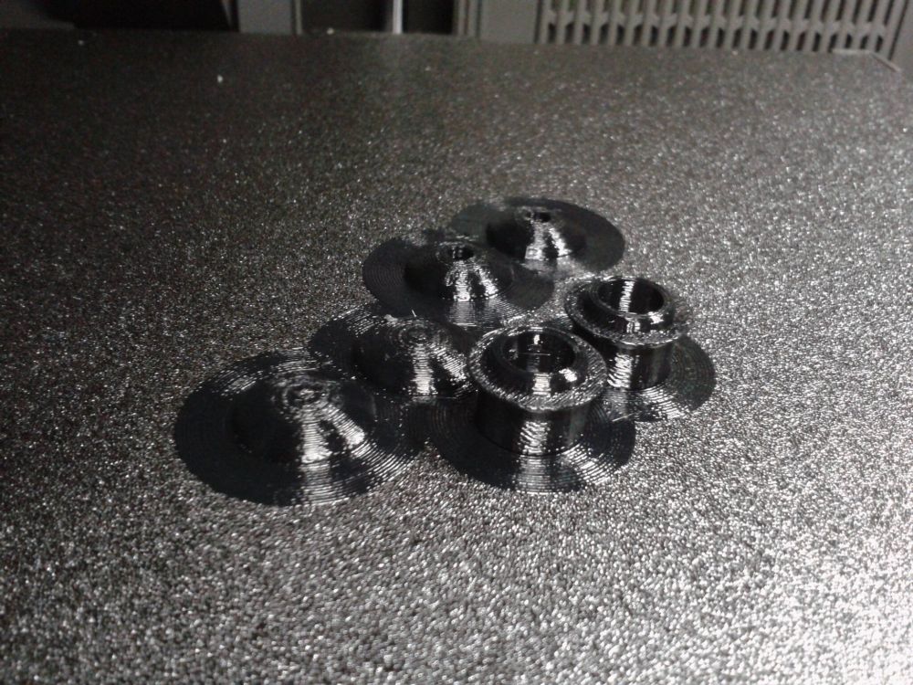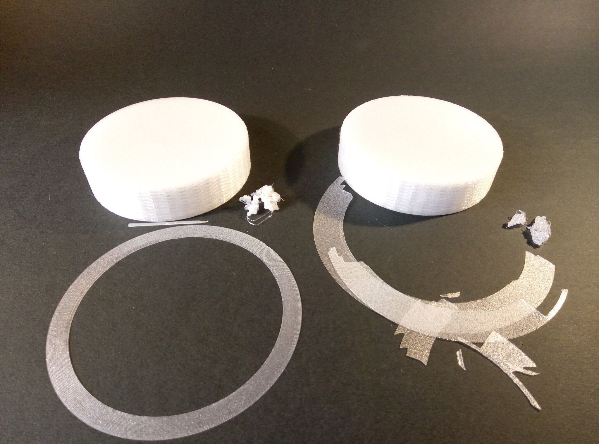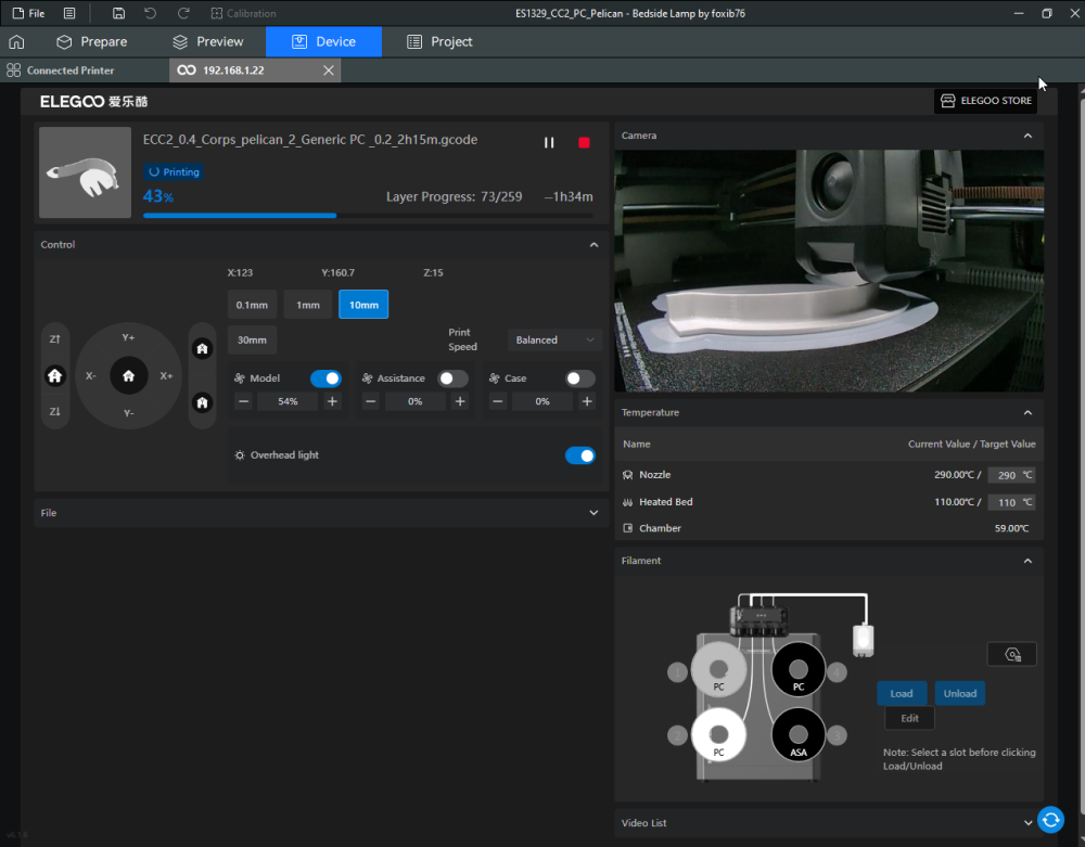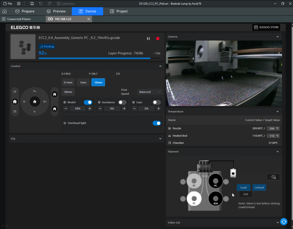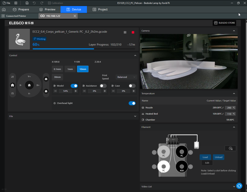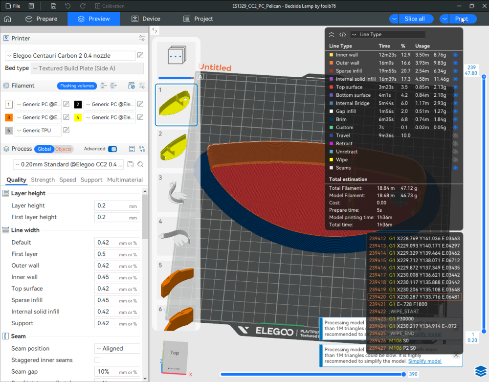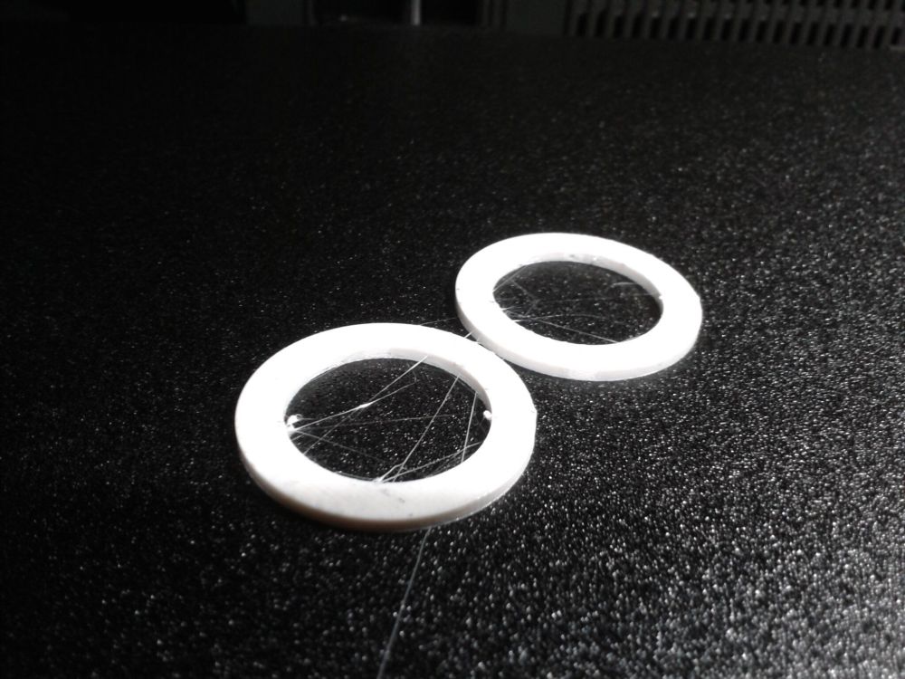 Autres impressions - PC Je n'avais pas vraiment d'expérience d'impressions avec des filaments de PC ( sauf un rapide essai avec du PCTG Vert ArianePlast fait lors de mon test de la Qidi Q1 Pro ) Et donc, je connais encore mal les prérequis et points importants pour correctement imprimer des filaments PC. Filaments utilisés pour ses impressions PC White Anycubic PC Black Anycubic PC Translucent White Anycubic Je me suis basé sur les spécifications du constructeur des filaments PC utilisés ( https://store.anycubic.com/products/pc-filament > buse 270-290°C, plateau 100-120°C, MVS 12 mm³/s, sécher la bobine avant utilisation 8-12 h à 80°C ) Je ne sais pas s'il y a des, ou quelles sont les, températures recommandées pour l'enceinte lors de l'impression de ce filament PC. Je suis partie du principe que pour limiter le gauchissement ou "warping", il fallait chercher à avoir dans l'enceinte la plus haute température que je pouvais obtenir dans la pièce à ~17°C où j'utilisais cette machine. Et j'ai donc grossièrement isolé l'imprimante avec les mousses de transport de l'imprimante et en plaçant à touche-touche de l'imprimante le sécheur de filament Creality Space Pi utilisé pour sécher à 70°C (température maximum sur ce sécheur) la bobine de filament PC en cours d'impression. sylo • container - h3liØ https://www.nexprint.com/en/models/G2102568 Pour mon premier essai d'impression avec un de ces filaments PC, J'ai utilisé le profil filament "Generic PC @Elegoo" (buse 270°C, plateau 110°C, MVS 12 mm³/s, flow 0.98 %) de Elegoo Slicer v1.3.2.9. Comme j'utilisais un filament transparent, j'ai voulu voir si en réimprimant le même modèle avec les mêmes paramètres mais à 290°C au lieu de 270°C j'obtenais ou non une meilleure transparence. Donc là, j'ai utilisé le profil filament "Generic PC @Elegoo" modifié (buse 290°C au lieu de 270°C, plateau 110°C, MVS 12 mm³/s, flow 0.98 %) de Elegoo Slicer v1.3.2.9. Il ne semble pas y avoir de différence visible au niveau de la transparence entre l'impression à 270°C et l'impression à 290°C. Pour la suite j'ai continué d'utiliser le profil filament "Generic PC @Elegoo" modifié (buse 290°C au lieu de 270°C, plateau 110°C, MVS 12 mm³/s, flow 0.98 %) de Elegoo Slicer v1.3.2.9. Les couvercles précédemment imprimés se vissent et se dévissent correctement de ces corps de boîte. Headset Holder extra wide - ArgiCZ https://www.nexprint.com/en/models/G8498722 Pelican - Lampe de chevet _ Pelican - Bedside Lamp - foxib76 https://www.thingiverse.com/thing:7275002 ( Merci à @Den76 pour ce modèle. Cf https://www.lesimprimantes3d.fr/forum/topic/64257-lampe-toucan/#findComment-658969 ) (J'ai plusieurs fois modifié les placements et orientations sur les plateaux et quelques paramètres de tranchage de certain objet du projet Elegoo Slicer que j'ai fait pour faire ses impressions… ce qui explique les possibles différences sur les captures d'écran d'Elegoo Slicer.) // On peut noter un léger gauchissement car la bordure d'impression commence à se détacher du plateau sur certaines zones. // À posteriori j'aurais dû mettre des supports d'impression sur une petite zone de cet objet ... // Et, là encore, on peut noter un léger gauchissement car la bordure d'impression commence à se détacher du plateau sur certaines zones. // À posteriori j'aurais dû mettre des supports d'impression sur une petite zone de cet objet ... // Et, là encore, on peut noter un léger gauchissement car la bordure d'impression commence à se détacher du plateau sur certaines zones. ( // Premier essai d'impression de ce plateau raté car je n'avais pas mis de bordure d'impression et les objets imprimés se sont décollés du plateau en cours d'impression. ) ( Là en TPU, CANVAS déconnecté, hub filament 4-1 démonté, capot thermique plastique enlevé, pour alimenter directement la tête d'impression avec le filament TPU. ) On peut voir que j'ai oublié de mettre des supports d'impression pour certaines zones des pieds. Et que j'ai un léger "pillowing". // J'imprime certainement trop chaud pour ce filament. Les pontages (des yeux noirs, non percés, sans supports) ne sont pas bons // J'imprime certainement trop chaud pour ce filament. Je n'ai pas encore collé, même si certaines impressions semblent avoir légèrement gauchi a l'impression ou au refroidissement, tout semble s'assembler correctement et le collage devrait rattraper les différents gauchissements ...4 points
