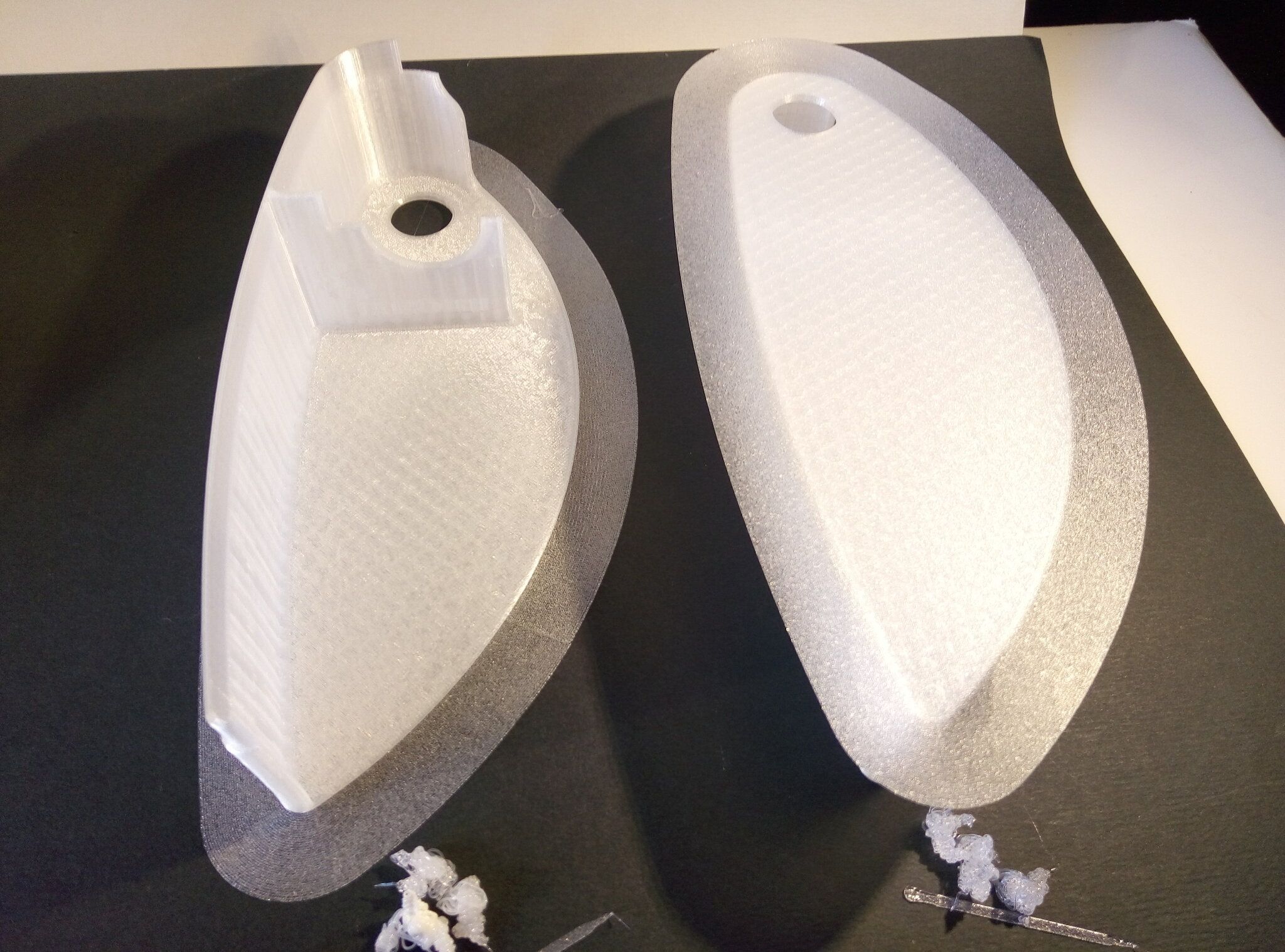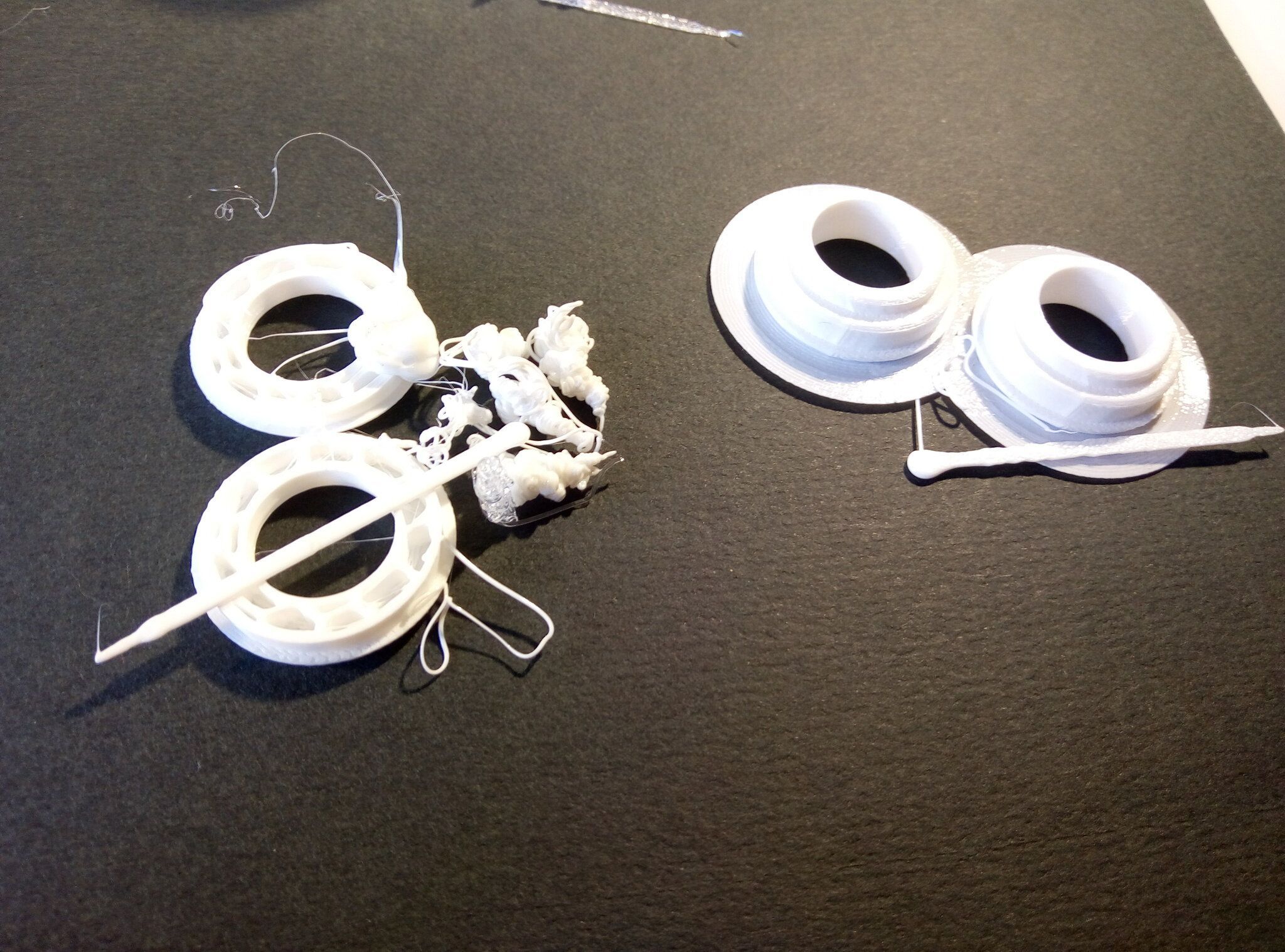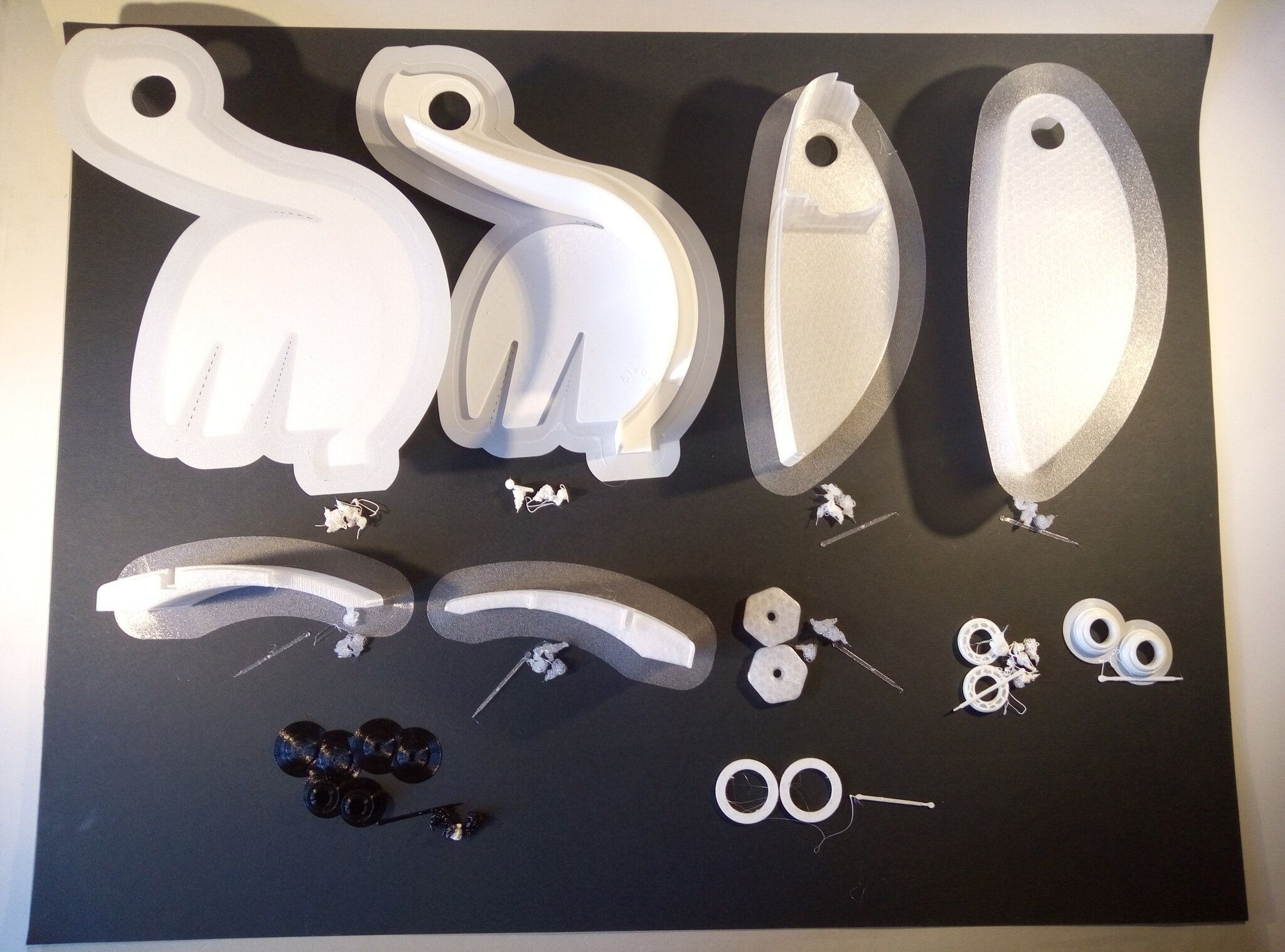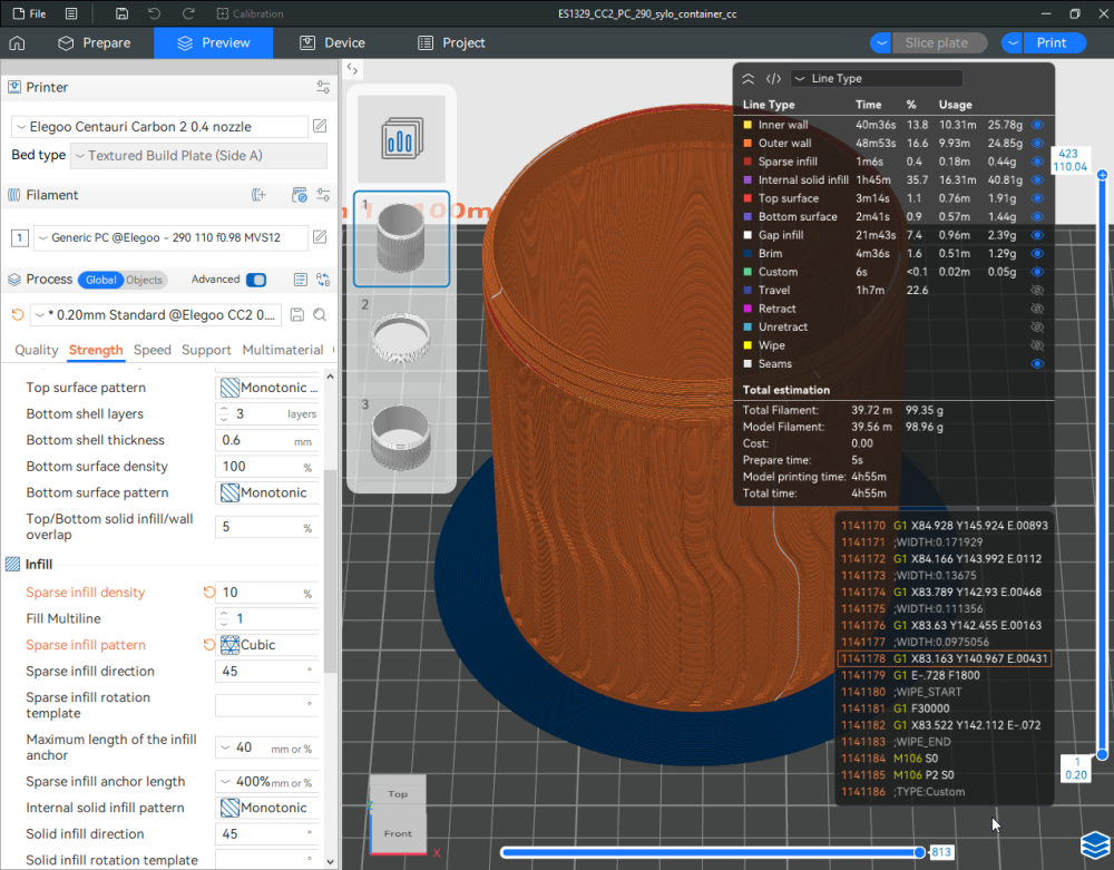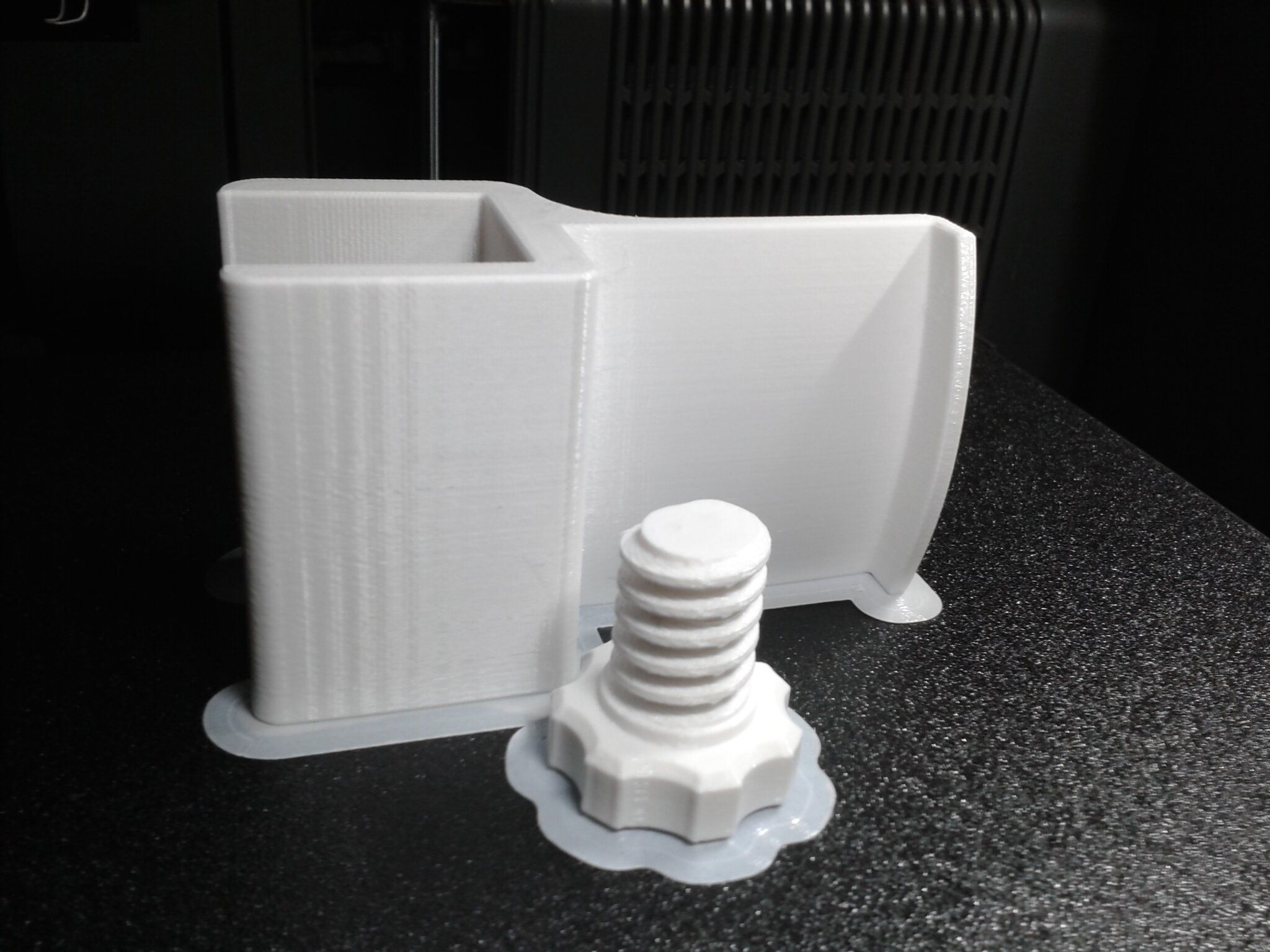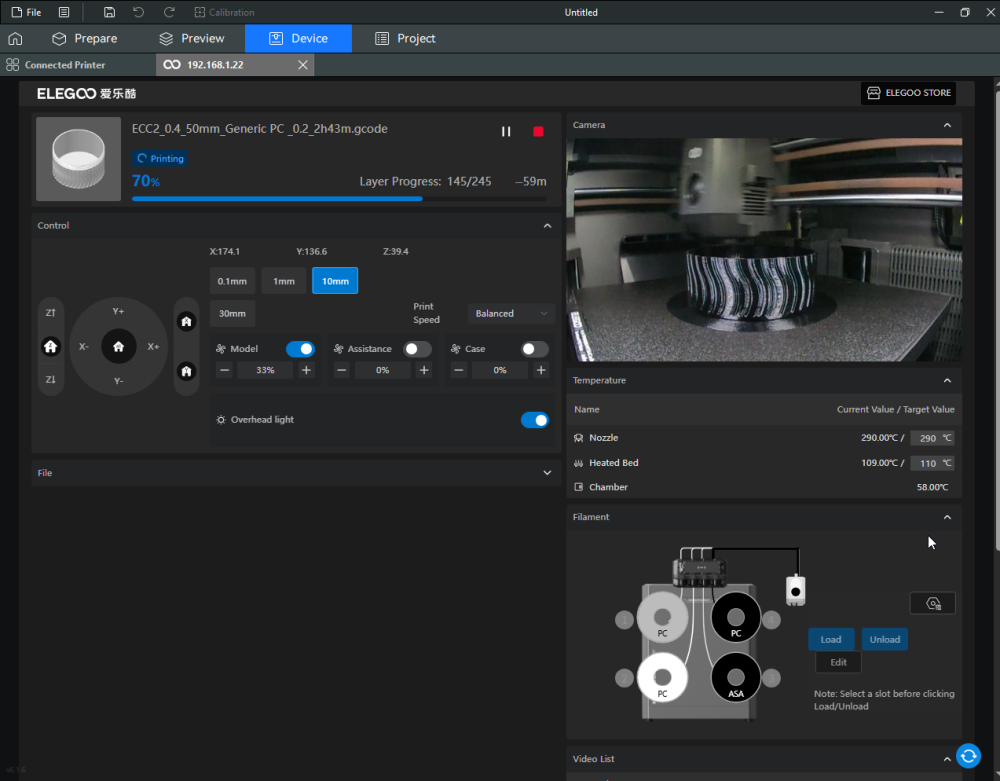 Autres impressions - PC Je n'avais pas vraiment d'expérience d'impressions avec des filaments de PC ( sauf un rapide essai avec du PCTG Vert ArianePlast fait lors de mon test de la Qidi Q1 Pro ) Et donc, je connais encore mal les prérequis et points importants pour correctement imprimer des filaments PC. Filaments utilisés pour ses impressions PC White Anycubic PC Black Anycubic PC Translucent White Anycubic Je me suis basé sur les spécifications du constructeur des filaments PC utilisés ( https://store.anycubic.com/products/pc-filament > buse 270-290°C, plateau 100-120°C, MVS 12 mm³/s, sécher la bobine avant utilisation 8-12 h à 80°C ) Je ne sais pas s'il y a des, ou quelles sont les, températures recommandées pour l'enceinte lors de l'impression de ce filament PC. Je suis partie du principe que pour limiter le gauchissement ou "warping", il fallait chercher à avoir dans l'enceinte la plus haute température que je pouvais obtenir dans la pièce à ~17°C où j'utilisais cette machine. Et j'ai donc grossièrement isolé l'imprimante avec les mousses de transport de l'imprimante et en plaçant à touche-touche de l'imprimante le sécheur de filament Creality Space Pi utilisé pour sécher à 70°C (température maximum sur ce sécheur) la bobine de filament PC en cours d'impression. sylo • container - h3liØ https://www.nexprint.com/en/models/G2102568 Pour mon premier essai d'impression avec un de ces filaments PC, J'ai utilisé le profil filament "Generic PC @Elegoo" (buse 270°C, plateau 110°C, MVS 12 mm³/s, flow 0.98 %) de Elegoo Slicer v1.3.2.9. Comme j'utilisais un filament transparent, j'ai voulu voir si en réimprimant le même modèle avec les mêmes paramètres mais à 290°C au lieu de 270°C j'obtenais ou non une meilleure transparence. Donc là, j'ai utilisé le profil filament "Generic PC @Elegoo" modifié (buse 290°C au lieu de 270°C, plateau 110°C, MVS 12 mm³/s, flow 0.98 %) de Elegoo Slicer v1.3.2.9. Il ne semble pas y avoir de différence visible au niveau de la transparence entre l'impression à 270°C et l'impression à 290°C. Pour la suite j'ai continué d'utiliser le profil filament "Generic PC @Elegoo" modifié (buse 290°C au lieu de 270°C, plateau 110°C, MVS 12 mm³/s, flow 0.98 %) de Elegoo Slicer v1.3.2.9. Les couvercles précédemment imprimés se vissent et se dévissent correctement de ces corps de boîte. Headset Holder extra wide - ArgiCZ https://www.nexprint.com/en/models/G8498722 Pelican - Lampe de chevet _ Pelican - Bedside Lamp - foxib76 https://www.thingiverse.com/thing:7275002 ( Merci à @Den76 pour ce modèle. Cf https://www.lesimprimantes3d.fr/forum/topic/64257-lampe-toucan/#findComment-658969 ) (J'ai plusieurs fois modifié les placements et orientations sur les plateaux et quelques paramètres de tranchage de certain objet du projet Elegoo Slicer que j'ai fait pour faire ses impressions… ce qui explique les possibles différences sur les captures d'écran d'Elegoo Slicer.) // On peut noter un léger gauchissement car la bordure d'impression commence à se détacher du plateau sur certaines zones. // À posteriori j'aurais dû mettre des supports d'impression sur une petite zone de cet objet ... // Et, là encore, on peut noter un léger gauchissement car la bordure d'impression commence à se détacher du plateau sur certaines zones. // À posteriori j'aurais dû mettre des supports d'impression sur une petite zone de cet objet ... // Et, là encore, on peut noter un léger gauchissement car la bordure d'impression commence à se détacher du plateau sur certaines zones. ( // Premier essai d'impression de ce plateau raté car je n'avais pas mis de bordure d'impression et les objets imprimés se sont décollés du plateau en cours d'impression. ) ( Là en TPU, CANVAS déconnecté, hub filament 4-1 démonté, capot thermique plastique enlevé, pour alimenter directement la tête d'impression avec le filament TPU. ) On peut voir que j'ai oublié de mettre des supports d'impression pour certaines zones des pieds. Et que j'ai un léger "pillowing". // J'imprime certainement trop chaud pour ce filament. Les pontages (des yeux noirs, non percés, sans supports) ne sont pas bons // J'imprime certainement trop chaud pour ce filament. Je n'ai pas encore collé, même si certaines impressions semblent avoir légèrement gauchi a l'impression ou au refroidissement, tout semble s'assembler correctement et le collage devrait rattraper les différents gauchissements ...4 points