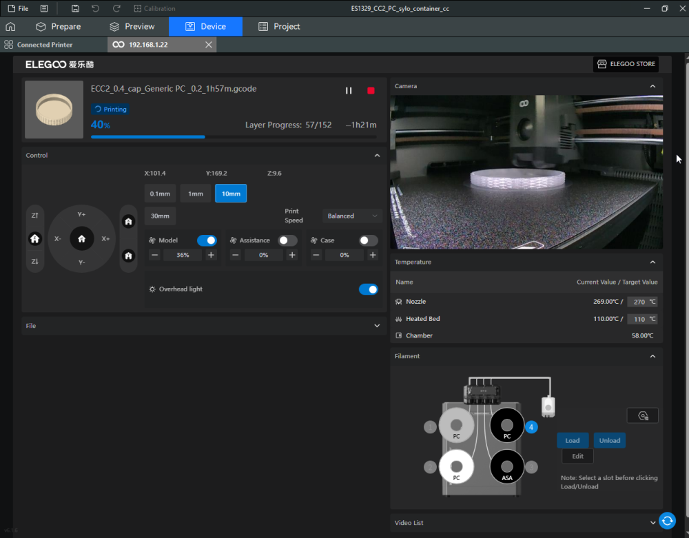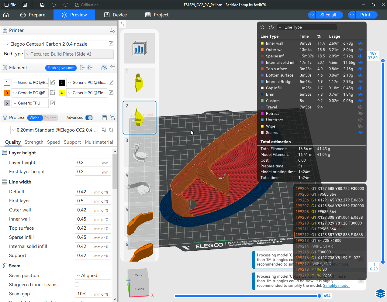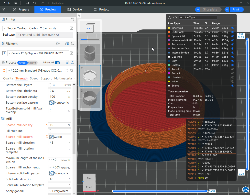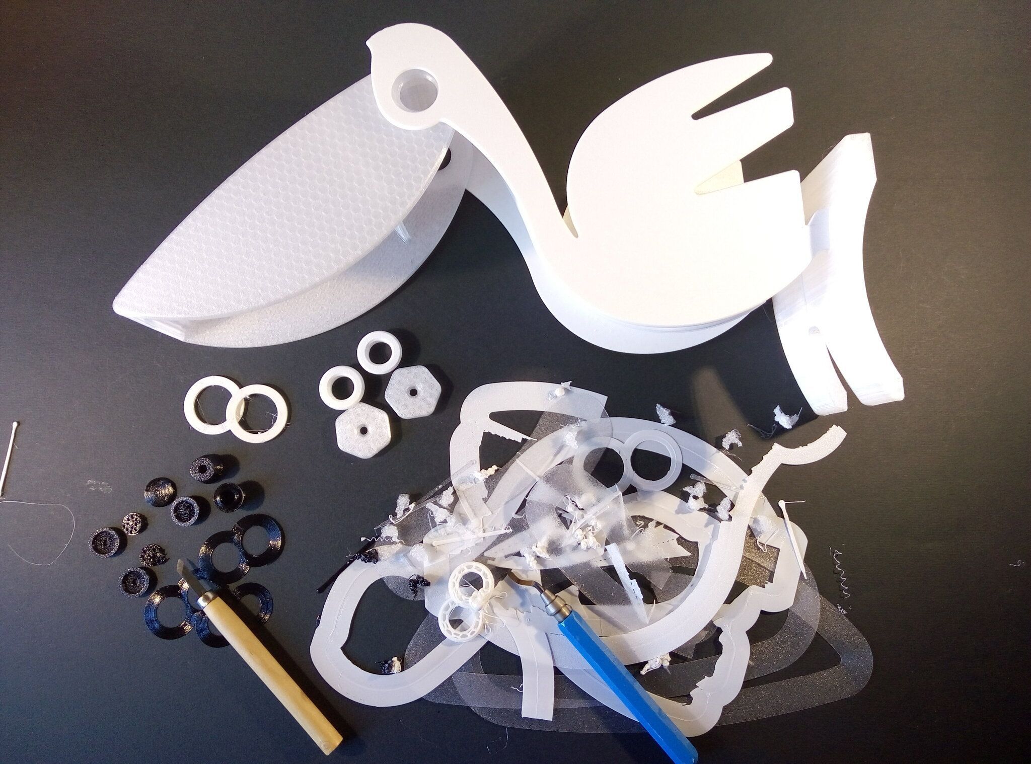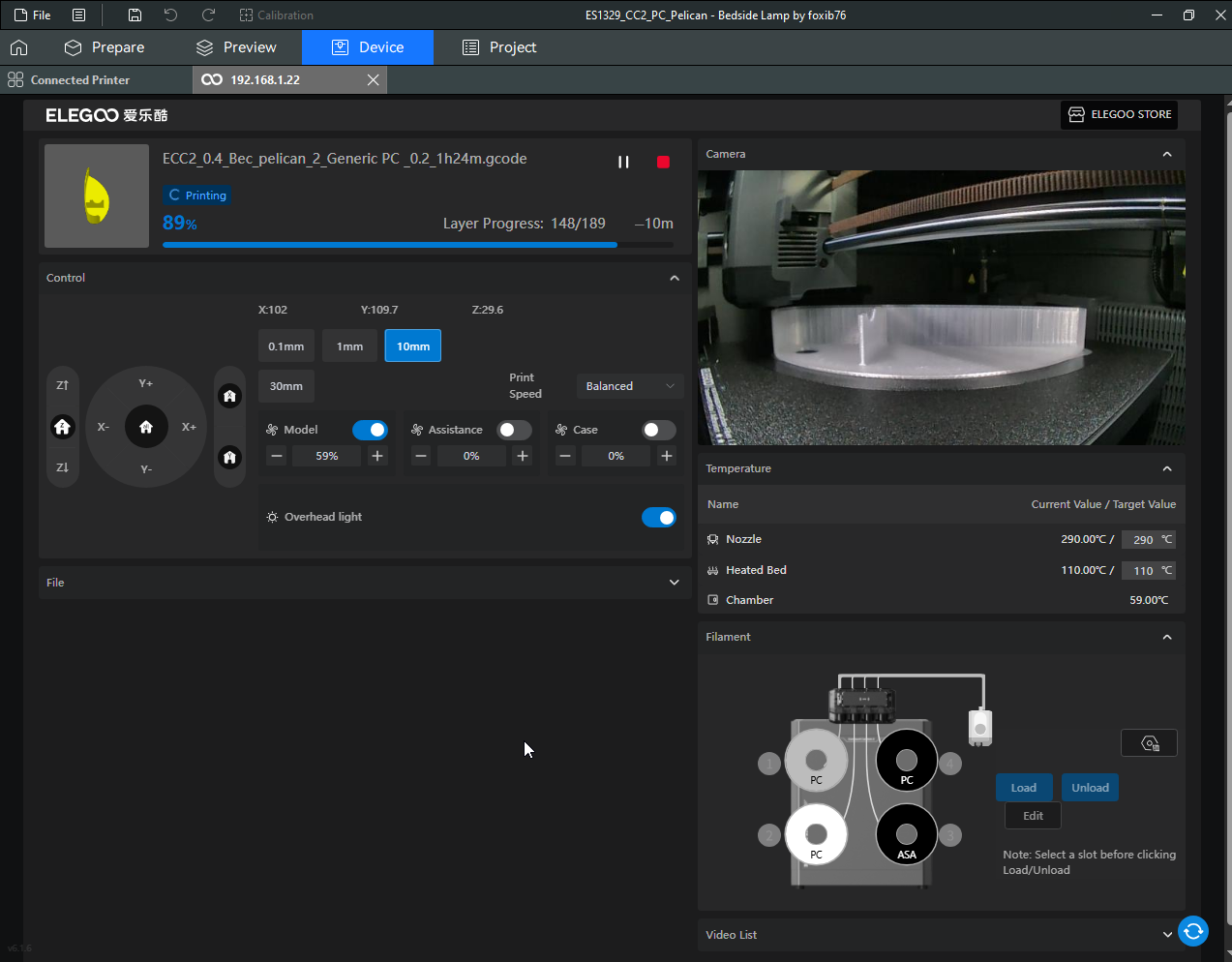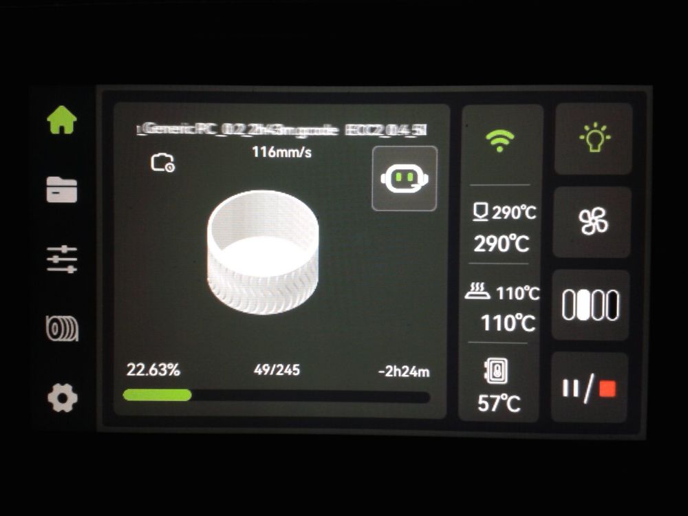 Autres impressions - PC Je n'avais pas vraiment d'expérience d'impressions avec des filaments de PC ( sauf un rapide essai avec du PCTG Vert ArianePlast fait lors de mon test de la Qidi Q1 Pro ) Et donc, je connais encore mal les prérequis et points importants pour correctement imprimer des filaments PC. Filaments utilisés pour ses impressions PC White Anycubic PC Black Anycubic PC Translucent White Anycubic Je me suis basé sur les spécifications du constructeur des filaments PC utilisés ( https://store.anycubic.com/products/pc-filament > buse 270-290°C, plateau 100-120°C, MVS 12 mm³/s, sécher la bobine avant utilisation 8-12 h à 80°C ) Je ne sais pas s'il y a des, ou quelles sont les, températures recommandées pour l'enceinte lors de l'impression de ce filament PC. Je suis partie du principe que pour limiter le gauchissement ou "warping", il fallait chercher à avoir dans l'enceinte la plus haute température que je pouvais obtenir dans la pièce à ~17°C où j'utilisais cette machine. Et j'ai donc grossièrement isolé l'imprimante avec les mousses de transport de l'imprimante et en plaçant à touche-touche de l'imprimante le sécheur de filament Creality Space Pi utilisé pour sécher à 70°C (température maximum sur ce sécheur) la bobine de filament PC en cours d'impression. sylo • container - h3liØ https://www.nexprint.com/en/models/G2102568 Pour mon premier essai d'impression avec un de ces filaments PC, J'ai utilisé le profil filament "Generic PC @Elegoo" (buse 270°C, plateau 110°C, MVS 12 mm³/s, flow 0.98 %) de Elegoo Slicer v1.3.2.9. Comme j'utilisais un filament transparent, j'ai voulu voir si en réimprimant le même modèle avec les mêmes paramètres mais à 290°C au lieu de 270°C j'obtenais ou non une meilleure transparence. Donc là, j'ai utilisé le profil filament "Generic PC @Elegoo" modifié (buse 290°C au lieu de 270°C, plateau 110°C, MVS 12 mm³/s, flow 0.98 %) de Elegoo Slicer v1.3.2.9. Il ne semble pas y avoir de différence visible au niveau de la transparence entre l'impression à 270°C et l'impression à 290°C. Pour la suite j'ai continué d'utiliser le profil filament "Generic PC @Elegoo" modifié (buse 290°C au lieu de 270°C, plateau 110°C, MVS 12 mm³/s, flow 0.98 %) de Elegoo Slicer v1.3.2.9. Les couvercles précédemment imprimés se vissent et se dévissent correctement de ces corps de boîte. Headset Holder extra wide - ArgiCZ https://www.nexprint.com/en/models/G8498722 Pelican - Lampe de chevet _ Pelican - Bedside Lamp - foxib76 https://www.thingiverse.com/thing:7275002 ( Merci à @Den76 pour ce modèle. Cf https://www.lesimprimantes3d.fr/forum/topic/64257-lampe-toucan/#findComment-658969 ) (J'ai plusieurs fois modifié les placements et orientations sur les plateaux et quelques paramètres de tranchage de certain objet du projet Elegoo Slicer que j'ai fait pour faire ses impressions… ce qui explique les possibles différences sur les captures d'écran d'Elegoo Slicer.) // On peut noter un léger gauchissement car la bordure d'impression commence à se détacher du plateau sur certaines zones. // À posteriori j'aurais dû mettre des supports d'impression sur une petite zone de cet objet ... // Et, là encore, on peut noter un léger gauchissement car la bordure d'impression commence à se détacher du plateau sur certaines zones. // À posteriori j'aurais dû mettre des supports d'impression sur une petite zone de cet objet ... // Et, là encore, on peut noter un léger gauchissement car la bordure d'impression commence à se détacher du plateau sur certaines zones. ( // Premier essai d'impression de ce plateau raté car je n'avais pas mis de bordure d'impression et les objets imprimés se sont décollés du plateau en cours d'impression. ) ( Là en TPU, CANVAS déconnecté, hub filament 4-1 démonté, capot thermique plastique enlevé, pour alimenter directement la tête d'impression avec le filament TPU. ) On peut voir que j'ai oublié de mettre des supports d'impression pour certaines zones des pieds. Et que j'ai un léger "pillowing". // J'imprime certainement trop chaud pour ce filament. Les pontages (des yeux noirs, non percés, sans supports) ne sont pas bons // J'imprime certainement trop chaud pour ce filament. Je n'ai pas encore collé, même si certaines impressions semblent avoir légèrement gauchi a l'impression ou au refroidissement, tout semble s'assembler correctement et le collage devrait rattraper les différents gauchissements ...4 points