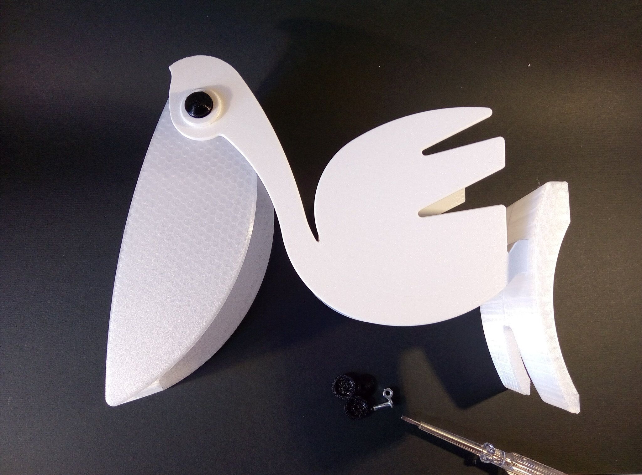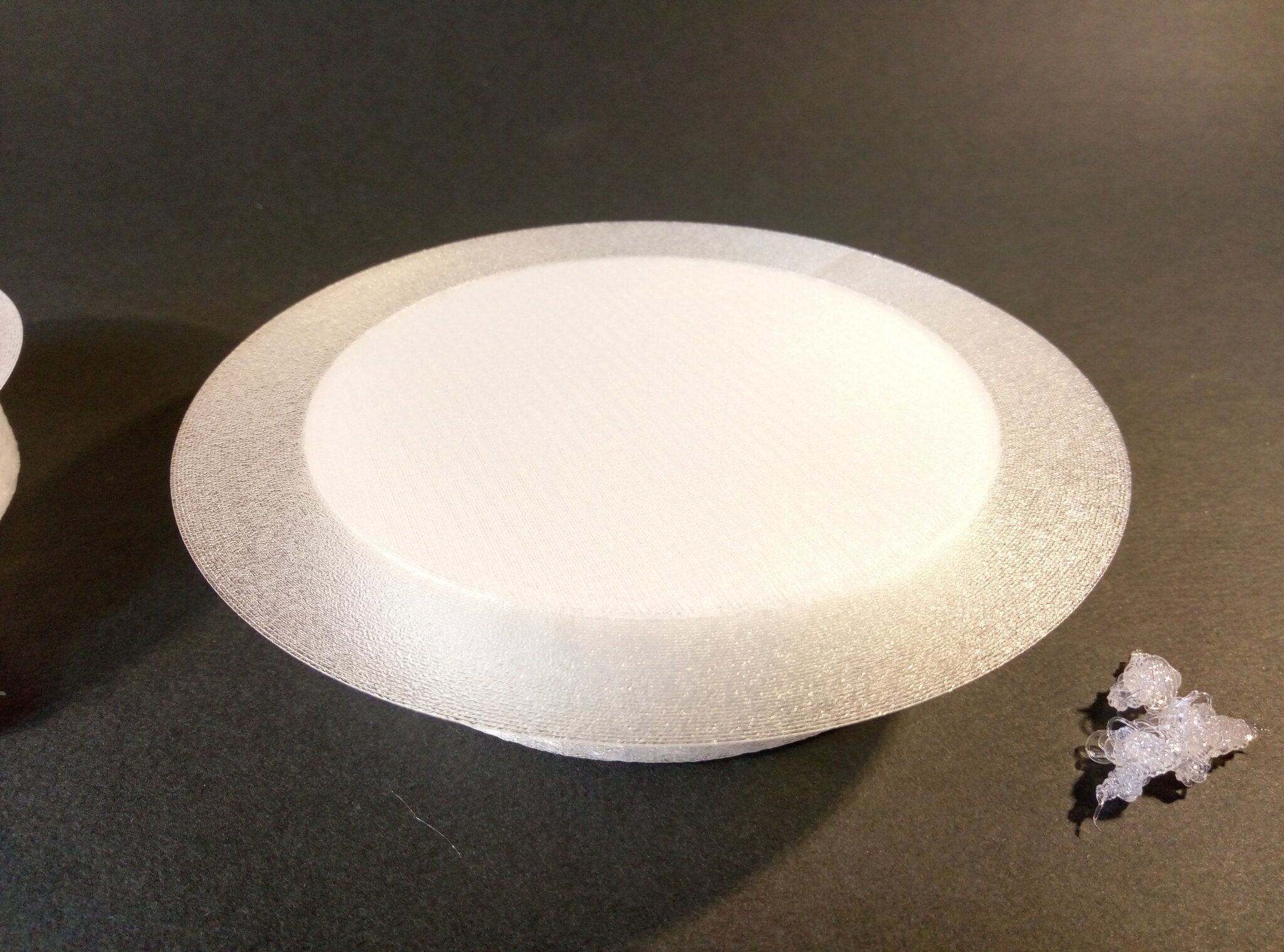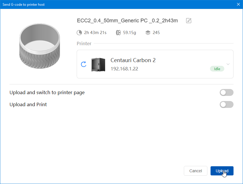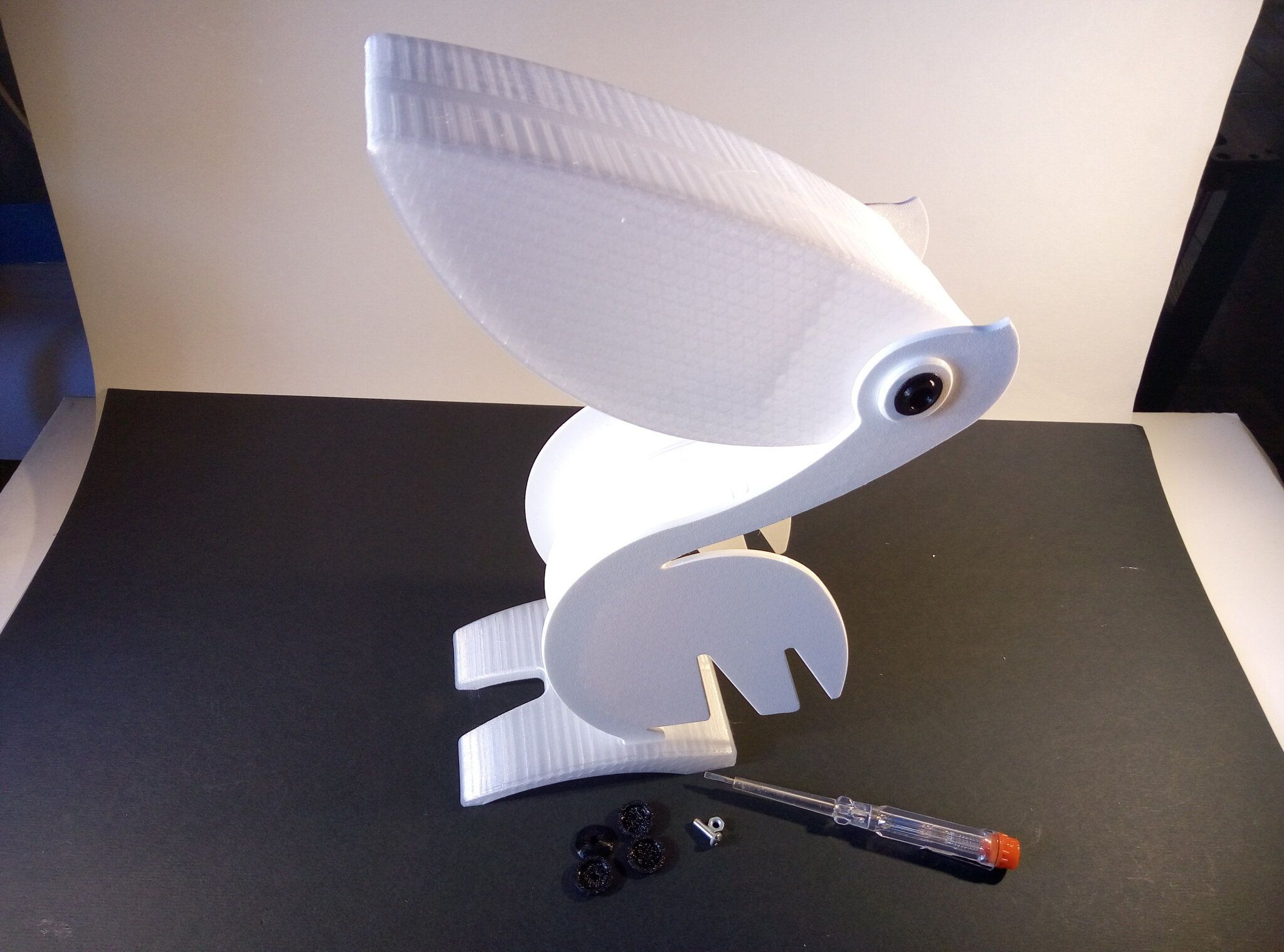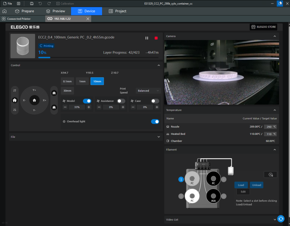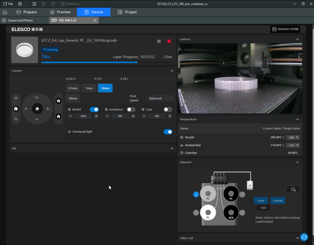 Autres impressions - PC Je n'avais pas vraiment d'expérience d'impressions avec des filaments de PC ( sauf un rapide essai avec du PCTG Vert ArianePlast fait lors de mon test de la Qidi Q1 Pro ) Et donc, je connais encore mal les prérequis et points importants pour correctement imprimer des filaments PC. Filaments utilisés pour ses impressions PC White Anycubic PC Black Anycubic PC Translucent White Anycubic Je me suis basé sur les spécifications du constructeur des filaments PC utilisés ( https://store.anycubic.com/products/pc-filament > buse 270-290°C, plateau 100-120°C, MVS 12 mm³/s, sécher la bobine avant utilisation 8-12 h à 80°C ) Je ne sais pas s'il y a des, ou quelles sont les, températures recommandées pour l'enceinte lors de l'impression de ce filament PC. Je suis partie du principe que pour limiter le gauchissement ou "warping", il fallait chercher à avoir dans l'enceinte la plus haute température que je pouvais obtenir dans la pièce à ~17°C où j'utilisais cette machine. Et j'ai donc grossièrement isolé l'imprimante avec les mousses de transport de l'imprimante et en plaçant à touche-touche de l'imprimante le sécheur de filament Creality Space Pi utilisé pour sécher à 70°C (température maximum sur ce sécheur) la bobine de filament PC en cours d'impression. sylo • container - h3liØ https://www.nexprint.com/en/models/G2102568 Pour mon premier essai d'impression avec un de ces filaments PC, J'ai utilisé le profil filament "Generic PC @Elegoo" (buse 270°C, plateau 110°C, MVS 12 mm³/s, flow 0.98 %) de Elegoo Slicer v1.3.2.9. Comme j'utilisais un filament transparent, j'ai voulu voir si en réimprimant le même modèle avec les mêmes paramètres mais à 290°C au lieu de 270°C j'obtenais ou non une meilleure transparence. Donc là, j'ai utilisé le profil filament "Generic PC @Elegoo" modifié (buse 290°C au lieu de 270°C, plateau 110°C, MVS 12 mm³/s, flow 0.98 %) de Elegoo Slicer v1.3.2.9. Il ne semble pas y avoir de différence visible au niveau de la transparence entre l'impression à 270°C et l'impression à 290°C. Pour la suite j'ai continué d'utiliser le profil filament "Generic PC @Elegoo" modifié (buse 290°C au lieu de 270°C, plateau 110°C, MVS 12 mm³/s, flow 0.98 %) de Elegoo Slicer v1.3.2.9. Les couvercles précédemment imprimés se vissent et se dévissent correctement de ces corps de boîte. Headset Holder extra wide - ArgiCZ https://www.nexprint.com/en/models/G8498722 Pelican - Lampe de chevet _ Pelican - Bedside Lamp - foxib76 https://www.thingiverse.com/thing:7275002 ( Merci à @Den76 pour ce modèle. Cf https://www.lesimprimantes3d.fr/forum/topic/64257-lampe-toucan/#findComment-658969 ) (J'ai plusieurs fois modifié les placements et orientations sur les plateaux et quelques paramètres de tranchage de certain objet du projet Elegoo Slicer que j'ai fait pour faire ses impressions… ce qui explique les possibles différences sur les captures d'écran d'Elegoo Slicer.) // On peut noter un léger gauchissement car la bordure d'impression commence à se détacher du plateau sur certaines zones. // À posteriori j'aurais dû mettre des supports d'impression sur une petite zone de cet objet ... // Et, là encore, on peut noter un léger gauchissement car la bordure d'impression commence à se détacher du plateau sur certaines zones. // À posteriori j'aurais dû mettre des supports d'impression sur une petite zone de cet objet ... // Et, là encore, on peut noter un léger gauchissement car la bordure d'impression commence à se détacher du plateau sur certaines zones. ( // Premier essai d'impression de ce plateau raté car je n'avais pas mis de bordure d'impression et les objets imprimés se sont décollés du plateau en cours d'impression. ) ( Là en TPU, CANVAS déconnecté, hub filament 4-1 démonté, capot thermique plastique enlevé, pour alimenter directement la tête d'impression avec le filament TPU. ) On peut voir que j'ai oublié de mettre des supports d'impression pour certaines zones des pieds. Et que j'ai un léger "pillowing". // J'imprime certainement trop chaud pour ce filament. Les pontages (des yeux noirs, non percés, sans supports) ne sont pas bons // J'imprime certainement trop chaud pour ce filament. Je n'ai pas encore collé, même si certaines impressions semblent avoir légèrement gauchi a l'impression ou au refroidissement, tout semble s'assembler correctement et le collage devrait rattraper les différents gauchissements ...4 points