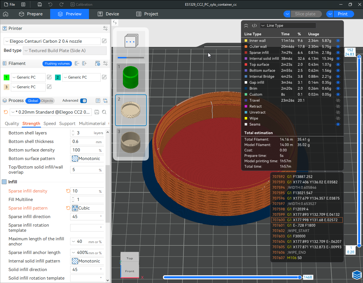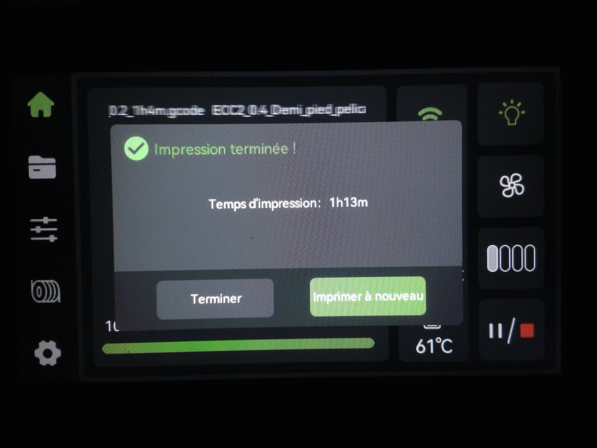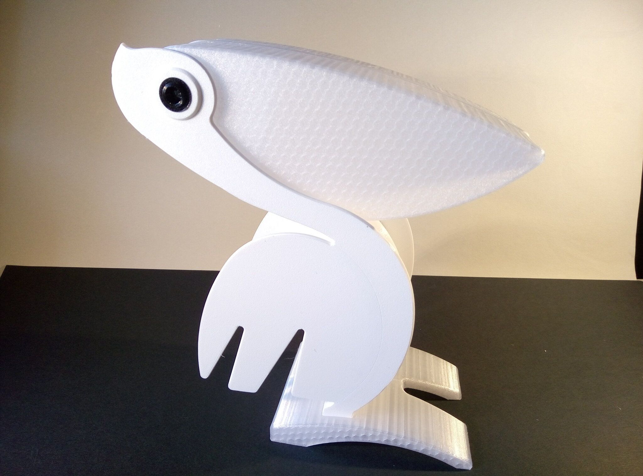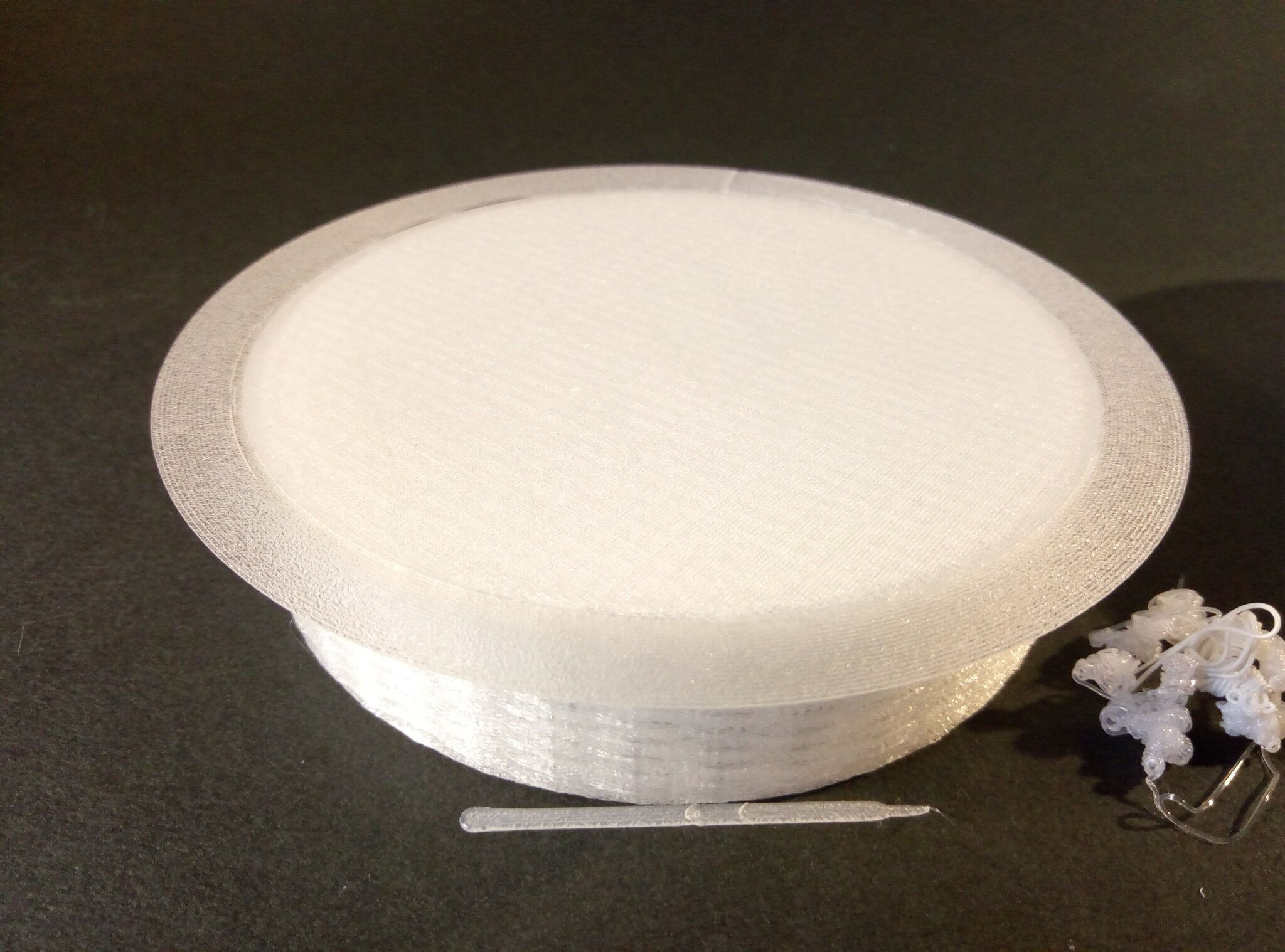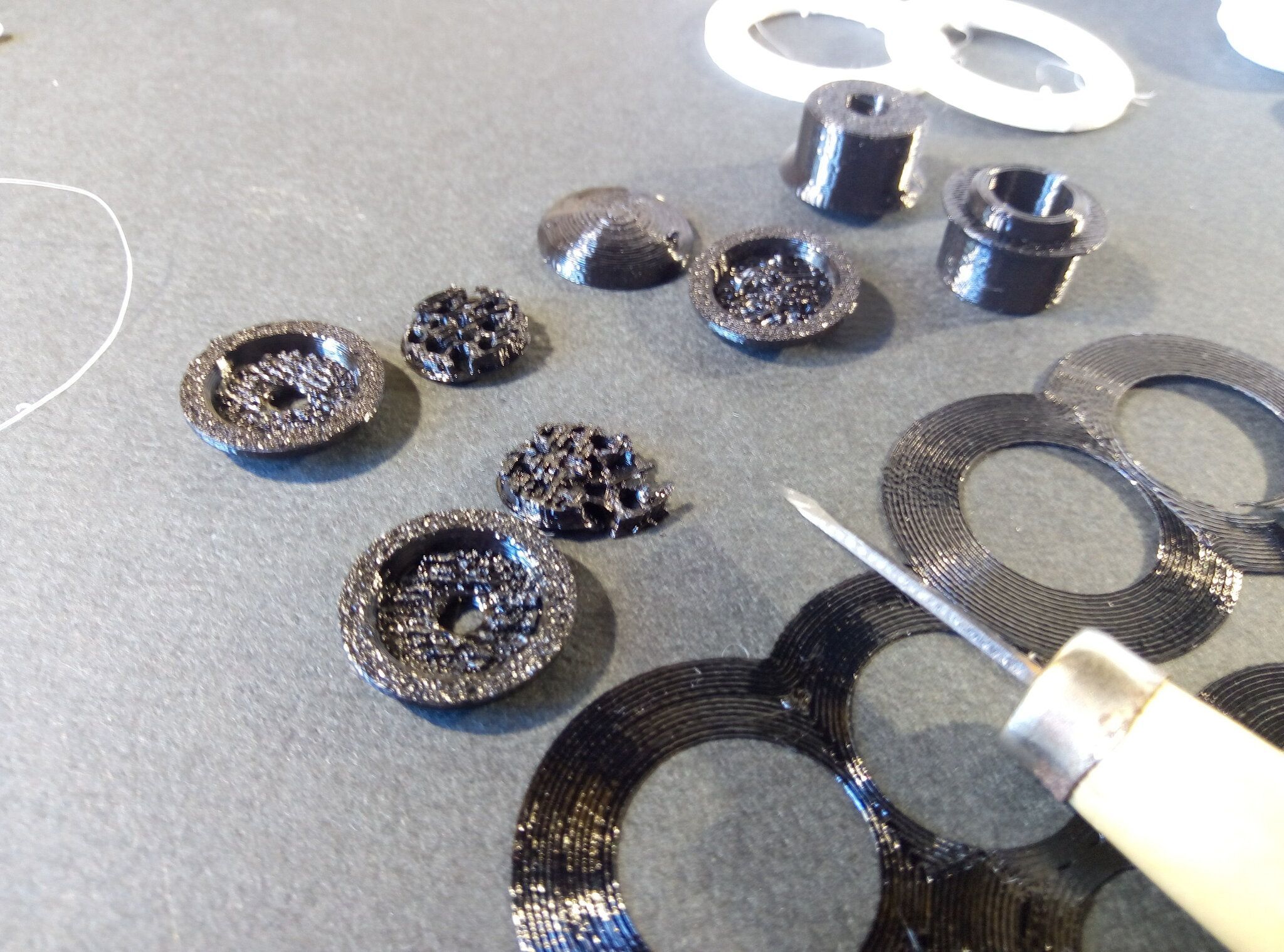 Autres impressions - PC Je n'avais pas vraiment d'expérience d'impressions avec des filaments de PC ( sauf un rapide essai avec du PCTG Vert ArianePlast fait lors de mon test de la Qidi Q1 Pro ) Et donc, je connais encore mal les prérequis et points importants pour correctement imprimer des filaments PC. Filaments utilisés pour ses impressions PC White Anycubic PC Black Anycubic PC Translucent White Anycubic Je me suis basé sur les spécifications du constructeur des filaments PC utilisés ( https://store.anycubic.com/products/pc-filament > buse 270-290°C, plateau 100-120°C, MVS 12 mm³/s, sécher la bobine avant utilisation 8-12 h à 80°C ) Je ne sais pas s'il y a des, ou quelles sont les, températures recommandées pour l'enceinte lors de l'impression de ce filament PC. Je suis partie du principe que pour limiter le gauchissement ou "warping", il fallait chercher à avoir dans l'enceinte la plus haute température que je pouvais obtenir dans la pièce à ~17°C où j'utilisais cette machine. Et j'ai donc grossièrement isolé l'imprimante avec les mousses de transport de l'imprimante et en plaçant à touche-touche de l'imprimante le sécheur de filament Creality Space Pi utilisé pour sécher à 70°C (température maximum sur ce sécheur) la bobine de filament PC en cours d'impression. sylo • container - h3liØ https://www.nexprint.com/en/models/G2102568 Pour mon premier essai d'impression avec un de ces filaments PC, J'ai utilisé le profil filament "Generic PC @Elegoo" (buse 270°C, plateau 110°C, MVS 12 mm³/s, flow 0.98 %) de Elegoo Slicer v1.3.2.9. Comme j'utilisais un filament transparent, j'ai voulu voir si en réimprimant le même modèle avec les mêmes paramètres mais à 290°C au lieu de 270°C j'obtenais ou non une meilleure transparence. Donc là, j'ai utilisé le profil filament "Generic PC @Elegoo" modifié (buse 290°C au lieu de 270°C, plateau 110°C, MVS 12 mm³/s, flow 0.98 %) de Elegoo Slicer v1.3.2.9. Il ne semble pas y avoir de différence visible au niveau de la transparence entre l'impression à 270°C et l'impression à 290°C. Pour la suite j'ai continué d'utiliser le profil filament "Generic PC @Elegoo" modifié (buse 290°C au lieu de 270°C, plateau 110°C, MVS 12 mm³/s, flow 0.98 %) de Elegoo Slicer v1.3.2.9. Les couvercles précédemment imprimés se vissent et se dévissent correctement de ces corps de boîte. Headset Holder extra wide - ArgiCZ https://www.nexprint.com/en/models/G8498722 Pelican - Lampe de chevet _ Pelican - Bedside Lamp - foxib76 https://www.thingiverse.com/thing:7275002 ( Merci à @Den76 pour ce modèle. Cf https://www.lesimprimantes3d.fr/forum/topic/64257-lampe-toucan/#findComment-658969 ) (J'ai plusieurs fois modifié les placements et orientations sur les plateaux et quelques paramètres de tranchage de certain objet du projet Elegoo Slicer que j'ai fait pour faire ses impressions… ce qui explique les possibles différences sur les captures d'écran d'Elegoo Slicer.) // On peut noter un léger gauchissement car la bordure d'impression commence à se détacher du plateau sur certaines zones. // À posteriori j'aurais dû mettre des supports d'impression sur une petite zone de cet objet ... // Et, là encore, on peut noter un léger gauchissement car la bordure d'impression commence à se détacher du plateau sur certaines zones. // À posteriori j'aurais dû mettre des supports d'impression sur une petite zone de cet objet ... // Et, là encore, on peut noter un léger gauchissement car la bordure d'impression commence à se détacher du plateau sur certaines zones. ( // Premier essai d'impression de ce plateau raté car je n'avais pas mis de bordure d'impression et les objets imprimés se sont décollés du plateau en cours d'impression. ) ( Là en TPU, CANVAS déconnecté, hub filament 4-1 démonté, capot thermique plastique enlevé, pour alimenter directement la tête d'impression avec le filament TPU. ) On peut voir que j'ai oublié de mettre des supports d'impression pour certaines zones des pieds. Et que j'ai un léger "pillowing". // J'imprime certainement trop chaud pour ce filament. Les pontages (des yeux noirs, non percés, sans supports) ne sont pas bons // J'imprime certainement trop chaud pour ce filament. Je n'ai pas encore collé, même si certaines impressions semblent avoir légèrement gauchi a l'impression ou au refroidissement, tout semble s'assembler correctement et le collage devrait rattraper les différents gauchissements ...4 points