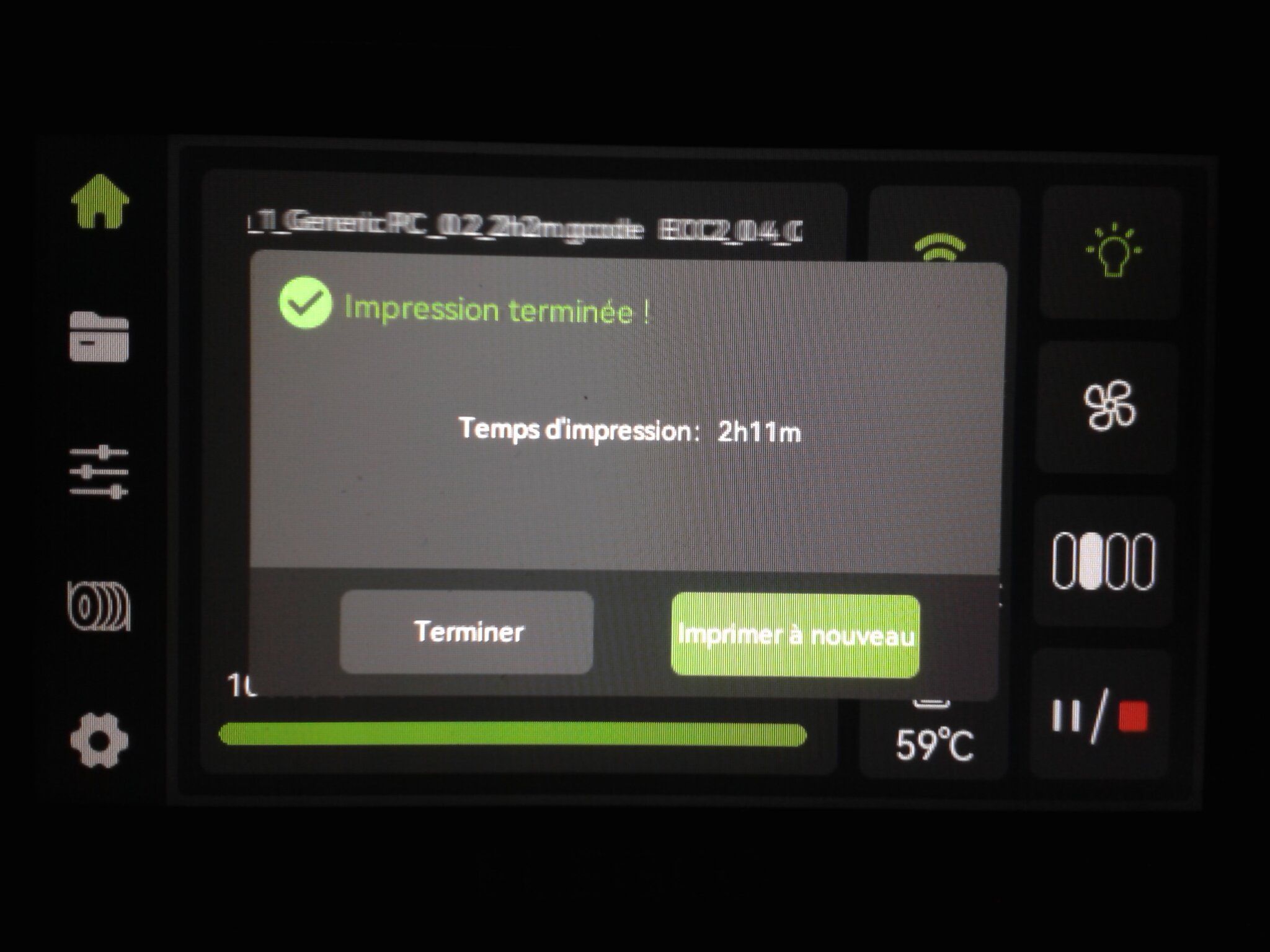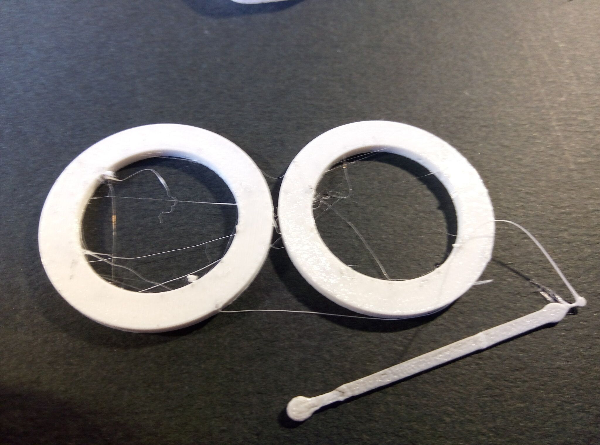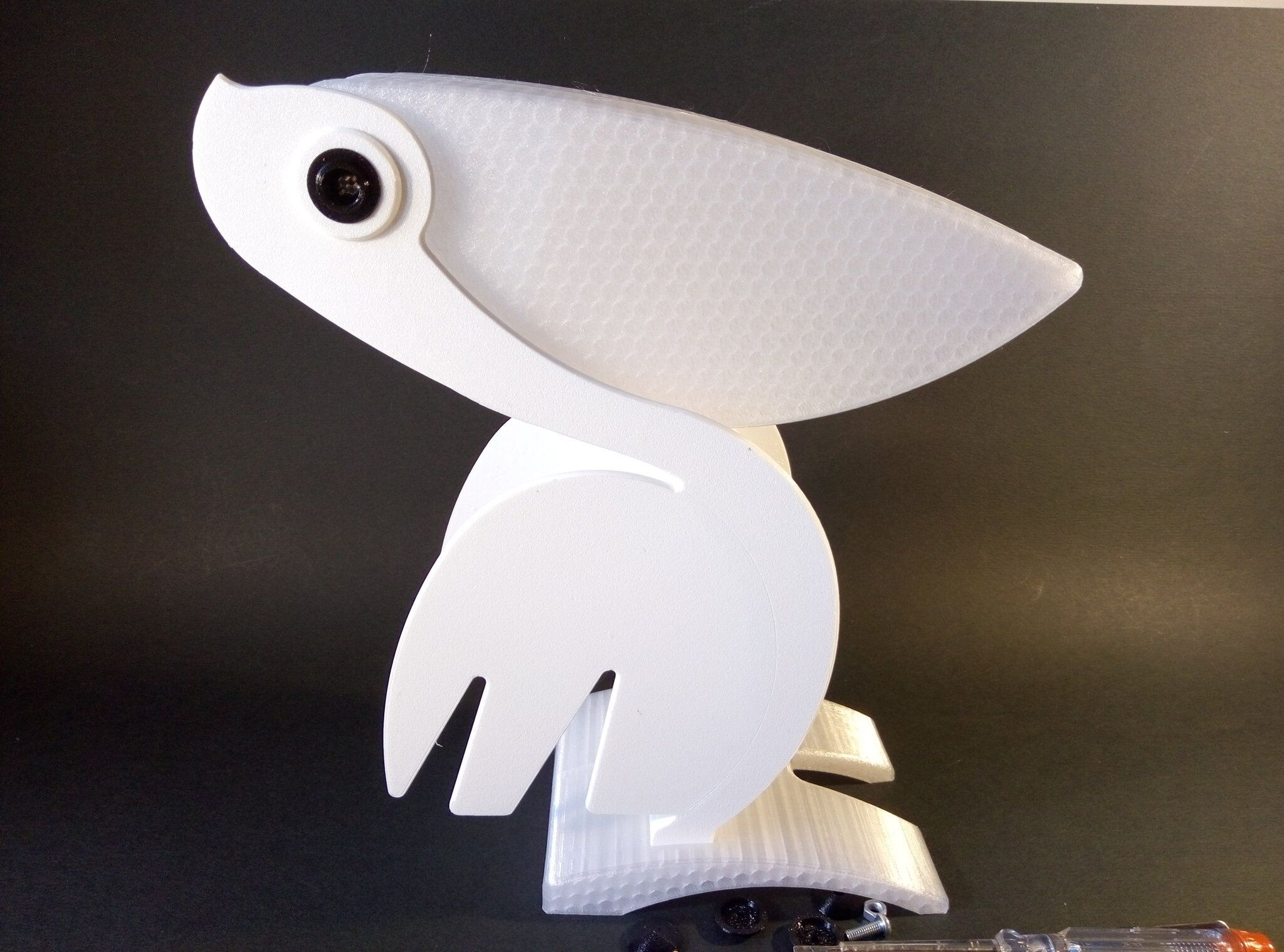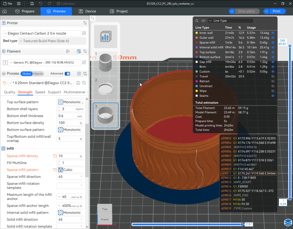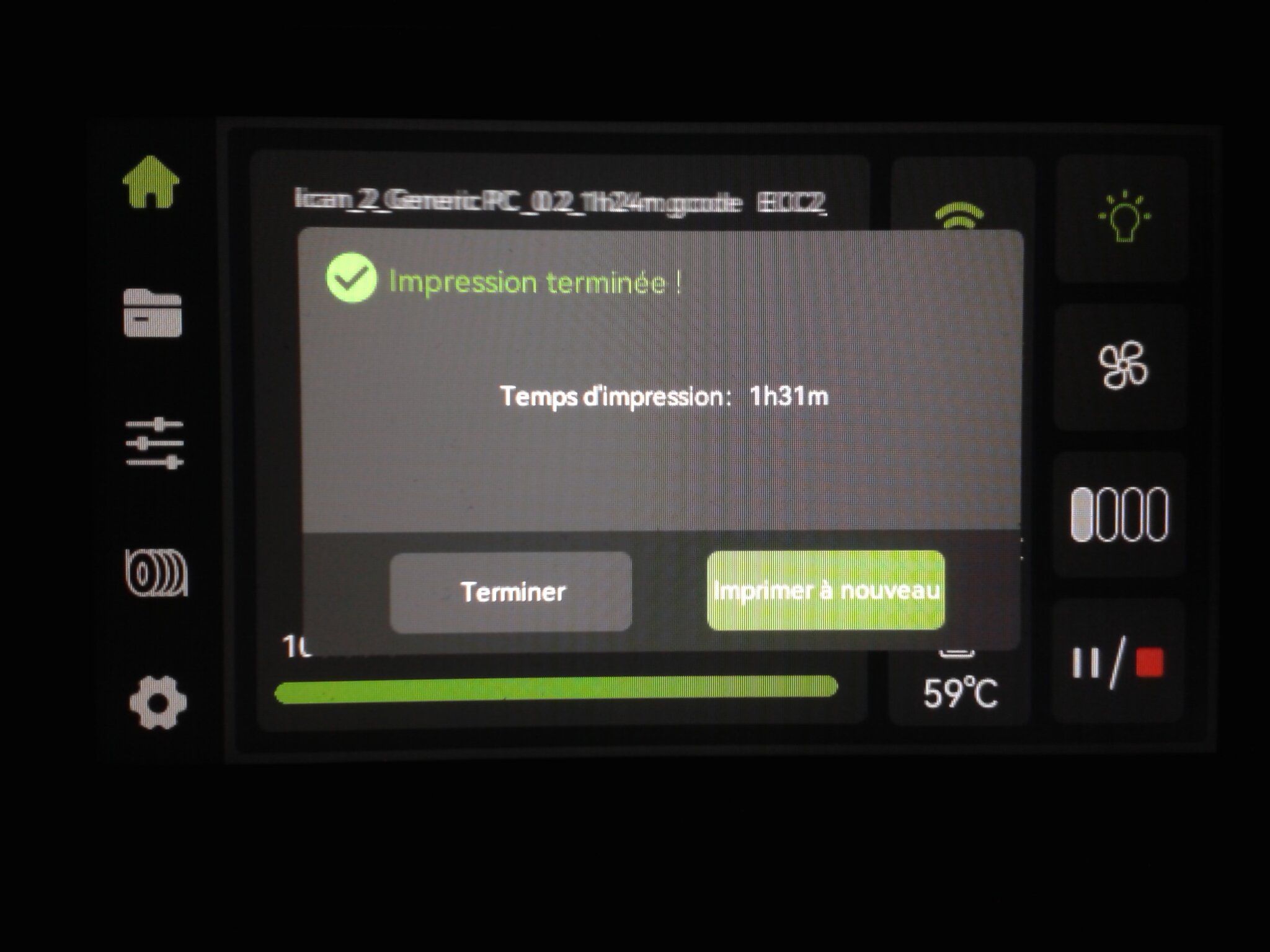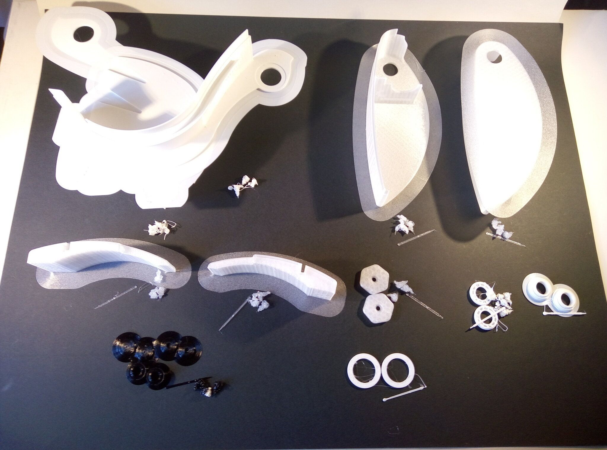 Autres impressions - PC Je n'avais pas vraiment d'expérience d'impressions avec des filaments de PC ( sauf un rapide essai avec du PCTG Vert ArianePlast fait lors de mon test de la Qidi Q1 Pro ) Et donc, je connais encore mal les prérequis et points importants pour correctement imprimer des filaments PC. Filaments utilisés pour ses impressions PC White Anycubic PC Black Anycubic PC Translucent White Anycubic Je me suis basé sur les spécifications du constructeur des filaments PC utilisés ( https://store.anycubic.com/products/pc-filament > buse 270-290°C, plateau 100-120°C, MVS 12 mm³/s, sécher la bobine avant utilisation 8-12 h à 80°C ) Je ne sais pas s'il y a des, ou quelles sont les, températures recommandées pour l'enceinte lors de l'impression de ce filament PC. Je suis partie du principe que pour limiter le gauchissement ou "warping", il fallait chercher à avoir dans l'enceinte la plus haute température que je pouvais obtenir dans la pièce à ~17°C où j'utilisais cette machine. Et j'ai donc grossièrement isolé l'imprimante avec les mousses de transport de l'imprimante et en plaçant à touche-touche de l'imprimante le sécheur de filament Creality Space Pi utilisé pour sécher à 70°C (température maximum sur ce sécheur) la bobine de filament PC en cours d'impression. sylo • container - h3liØ https://www.nexprint.com/en/models/G2102568 Pour mon premier essai d'impression avec un de ces filaments PC, J'ai utilisé le profil filament "Generic PC @Elegoo" (buse 270°C, plateau 110°C, MVS 12 mm³/s, flow 0.98 %) de Elegoo Slicer v1.3.2.9. Comme j'utilisais un filament transparent, j'ai voulu voir si en réimprimant le même modèle avec les mêmes paramètres mais à 290°C au lieu de 270°C j'obtenais ou non une meilleure transparence. Donc là, j'ai utilisé le profil filament "Generic PC @Elegoo" modifié (buse 290°C au lieu de 270°C, plateau 110°C, MVS 12 mm³/s, flow 0.98 %) de Elegoo Slicer v1.3.2.9. Il ne semble pas y avoir de différence visible au niveau de la transparence entre l'impression à 270°C et l'impression à 290°C. Pour la suite j'ai continué d'utiliser le profil filament "Generic PC @Elegoo" modifié (buse 290°C au lieu de 270°C, plateau 110°C, MVS 12 mm³/s, flow 0.98 %) de Elegoo Slicer v1.3.2.9. Les couvercles précédemment imprimés se vissent et se dévissent correctement de ces corps de boîte. Headset Holder extra wide - ArgiCZ https://www.nexprint.com/en/models/G8498722 Pelican - Lampe de chevet _ Pelican - Bedside Lamp - foxib76 https://www.thingiverse.com/thing:7275002 ( Merci à @Den76 pour ce modèle. Cf https://www.lesimprimantes3d.fr/forum/topic/64257-lampe-toucan/#findComment-658969 ) (J'ai plusieurs fois modifié les placements et orientations sur les plateaux et quelques paramètres de tranchage de certain objet du projet Elegoo Slicer que j'ai fait pour faire ses impressions… ce qui explique les possibles différences sur les captures d'écran d'Elegoo Slicer.) // On peut noter un léger gauchissement car la bordure d'impression commence à se détacher du plateau sur certaines zones. // À posteriori j'aurais dû mettre des supports d'impression sur une petite zone de cet objet ... // Et, là encore, on peut noter un léger gauchissement car la bordure d'impression commence à se détacher du plateau sur certaines zones. // À posteriori j'aurais dû mettre des supports d'impression sur une petite zone de cet objet ... // Et, là encore, on peut noter un léger gauchissement car la bordure d'impression commence à se détacher du plateau sur certaines zones. ( // Premier essai d'impression de ce plateau raté car je n'avais pas mis de bordure d'impression et les objets imprimés se sont décollés du plateau en cours d'impression. ) ( Là en TPU, CANVAS déconnecté, hub filament 4-1 démonté, capot thermique plastique enlevé, pour alimenter directement la tête d'impression avec le filament TPU. ) On peut voir que j'ai oublié de mettre des supports d'impression pour certaines zones des pieds. Et que j'ai un léger "pillowing". // J'imprime certainement trop chaud pour ce filament. Les pontages (des yeux noirs, non percés, sans supports) ne sont pas bons // J'imprime certainement trop chaud pour ce filament. Je n'ai pas encore collé, même si certaines impressions semblent avoir légèrement gauchi a l'impression ou au refroidissement, tout semble s'assembler correctement et le collage devrait rattraper les différents gauchissements ...4 points