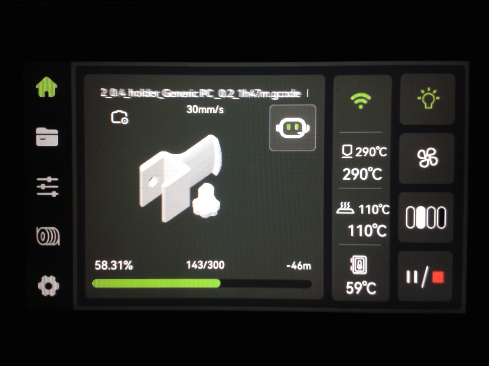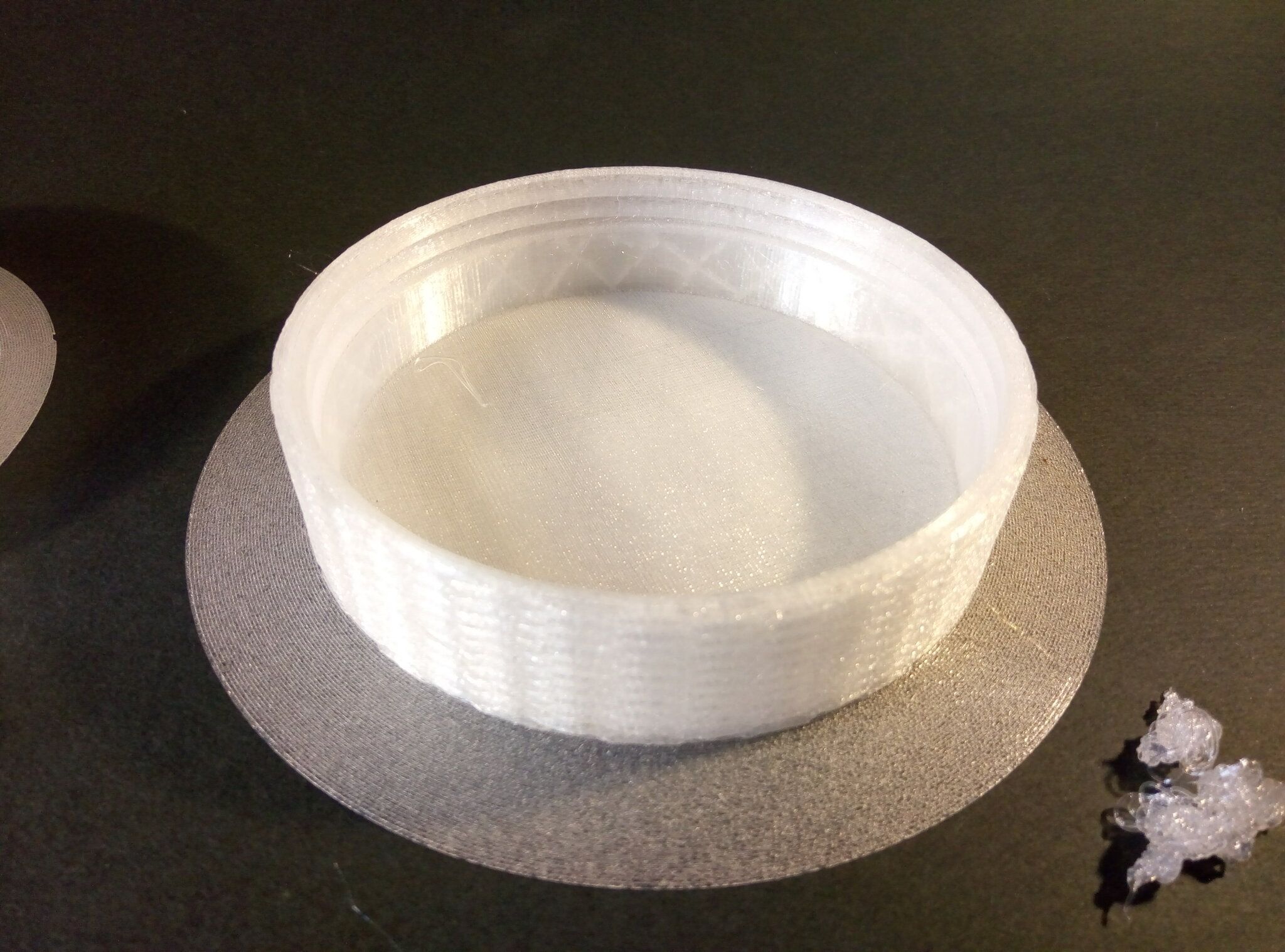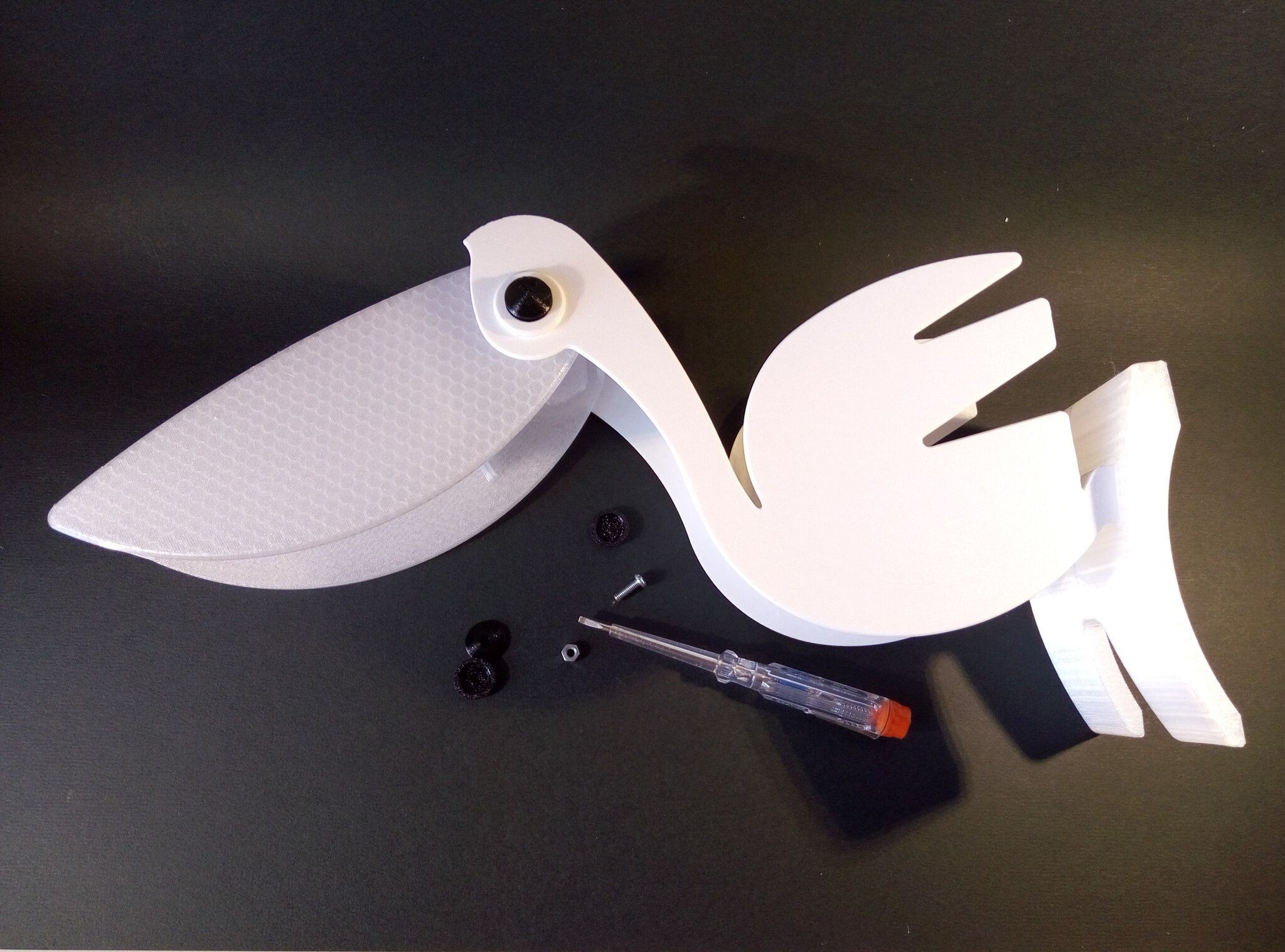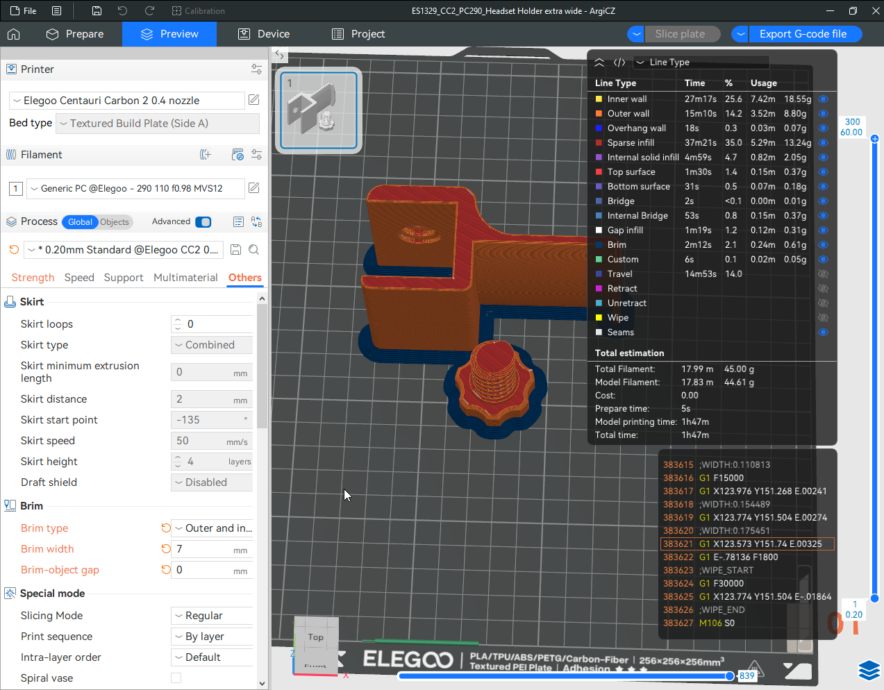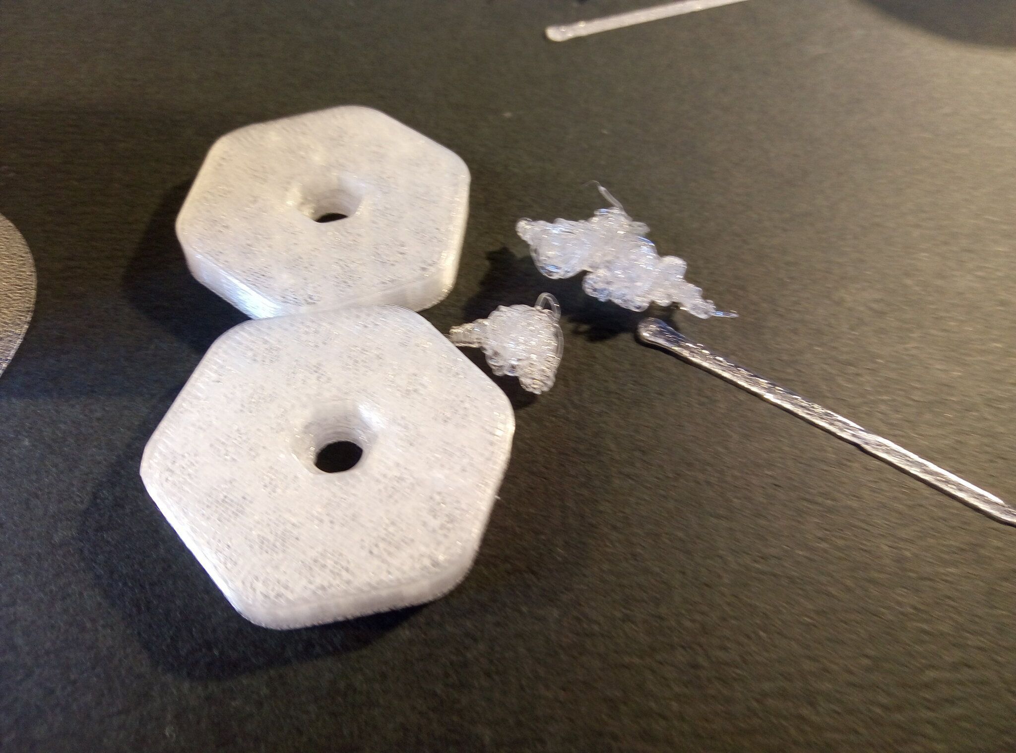 Autres impressions - PC Je n'avais pas vraiment d'expérience d'impressions avec des filaments de PC ( sauf un rapide essai avec du PCTG Vert ArianePlast fait lors de mon test de la Qidi Q1 Pro ) Et donc, je connais encore mal les prérequis et points importants pour correctement imprimer des filaments PC. Filaments utilisés pour ses impressions PC White Anycubic PC Black Anycubic PC Translucent White Anycubic Je me suis basé sur les spécifications du constructeur des filaments PC utilisés ( https://store.anycubic.com/products/pc-filament > buse 270-290°C, plateau 100-120°C, MVS 12 mm³/s, sécher la bobine avant utilisation 8-12 h à 80°C ) Je ne sais pas s'il y a des, ou quelles sont les, températures recommandées pour l'enceinte lors de l'impression de ce filament PC. Je suis partie du principe que pour limiter le gauchissement ou "warping", il fallait chercher à avoir dans l'enceinte la plus haute température que je pouvais obtenir dans la pièce à ~17°C où j'utilisais cette machine. Et j'ai donc grossièrement isolé l'imprimante avec les mousses de transport de l'imprimante et en plaçant à touche-touche de l'imprimante le sécheur de filament Creality Space Pi utilisé pour sécher à 70°C (température maximum sur ce sécheur) la bobine de filament PC en cours d'impression. sylo • container - h3liØ https://www.nexprint.com/en/models/G2102568 Pour mon premier essai d'impression avec un de ces filaments PC, J'ai utilisé le profil filament "Generic PC @Elegoo" (buse 270°C, plateau 110°C, MVS 12 mm³/s, flow 0.98 %) de Elegoo Slicer v1.3.2.9. Comme j'utilisais un filament transparent, j'ai voulu voir si en réimprimant le même modèle avec les mêmes paramètres mais à 290°C au lieu de 270°C j'obtenais ou non une meilleure transparence. Donc là, j'ai utilisé le profil filament "Generic PC @Elegoo" modifié (buse 290°C au lieu de 270°C, plateau 110°C, MVS 12 mm³/s, flow 0.98 %) de Elegoo Slicer v1.3.2.9. Il ne semble pas y avoir de différence visible au niveau de la transparence entre l'impression à 270°C et l'impression à 290°C. Pour la suite j'ai continué d'utiliser le profil filament "Generic PC @Elegoo" modifié (buse 290°C au lieu de 270°C, plateau 110°C, MVS 12 mm³/s, flow 0.98 %) de Elegoo Slicer v1.3.2.9. Les couvercles précédemment imprimés se vissent et se dévissent correctement de ces corps de boîte. Headset Holder extra wide - ArgiCZ https://www.nexprint.com/en/models/G8498722 Pelican - Lampe de chevet _ Pelican - Bedside Lamp - foxib76 https://www.thingiverse.com/thing:7275002 ( Merci à @Den76 pour ce modèle. Cf https://www.lesimprimantes3d.fr/forum/topic/64257-lampe-toucan/#findComment-658969 ) (J'ai plusieurs fois modifié les placements et orientations sur les plateaux et quelques paramètres de tranchage de certain objet du projet Elegoo Slicer que j'ai fait pour faire ses impressions… ce qui explique les possibles différences sur les captures d'écran d'Elegoo Slicer.) // On peut noter un léger gauchissement car la bordure d'impression commence à se détacher du plateau sur certaines zones. // À posteriori j'aurais dû mettre des supports d'impression sur une petite zone de cet objet ... // Et, là encore, on peut noter un léger gauchissement car la bordure d'impression commence à se détacher du plateau sur certaines zones. // À posteriori j'aurais dû mettre des supports d'impression sur une petite zone de cet objet ... // Et, là encore, on peut noter un léger gauchissement car la bordure d'impression commence à se détacher du plateau sur certaines zones. ( // Premier essai d'impression de ce plateau raté car je n'avais pas mis de bordure d'impression et les objets imprimés se sont décollés du plateau en cours d'impression. ) ( Là en TPU, CANVAS déconnecté, hub filament 4-1 démonté, capot thermique plastique enlevé, pour alimenter directement la tête d'impression avec le filament TPU. ) On peut voir que j'ai oublié de mettre des supports d'impression pour certaines zones des pieds. Et que j'ai un léger "pillowing". // J'imprime certainement trop chaud pour ce filament. Les pontages (des yeux noirs, non percés, sans supports) ne sont pas bons // J'imprime certainement trop chaud pour ce filament. Je n'ai pas encore collé, même si certaines impressions semblent avoir légèrement gauchi a l'impression ou au refroidissement, tout semble s'assembler correctement et le collage devrait rattraper les différents gauchissements ...4 points