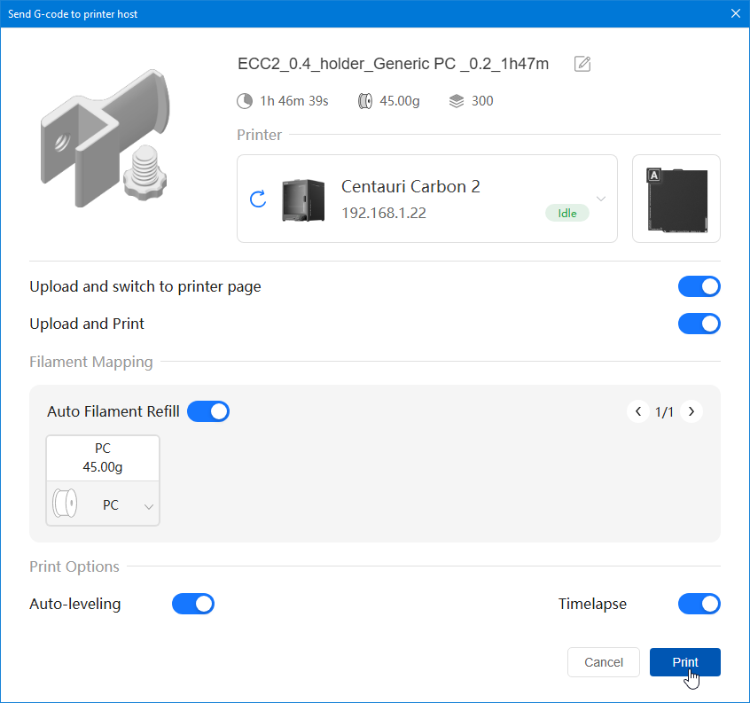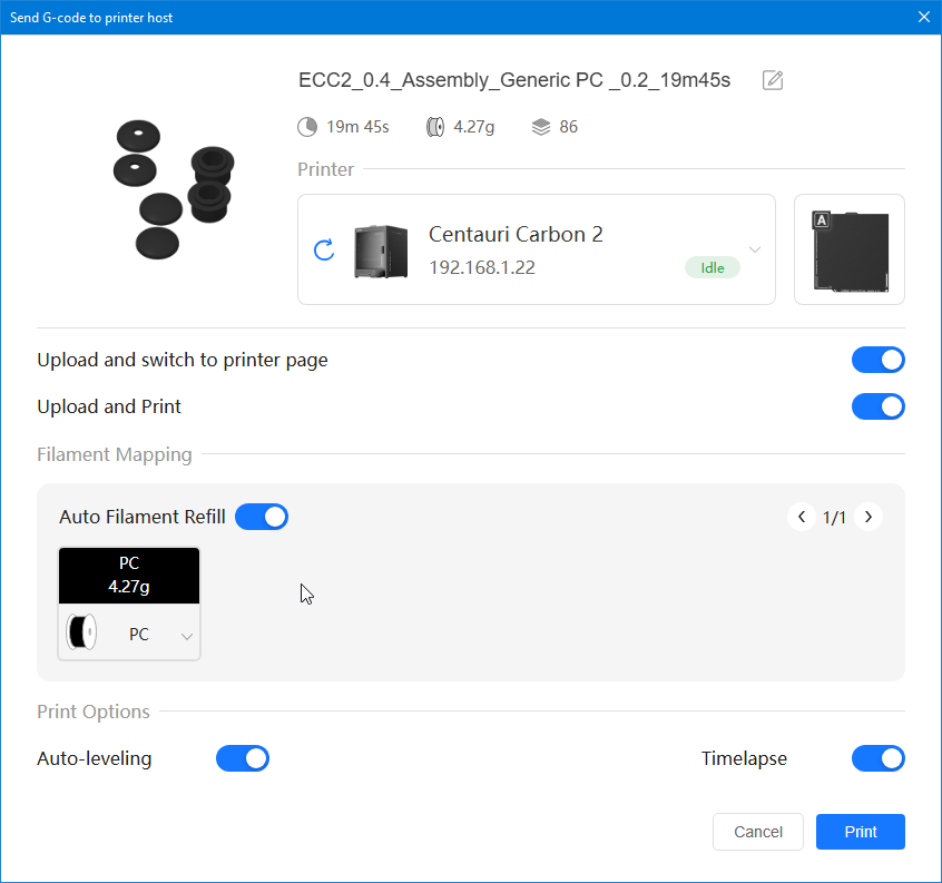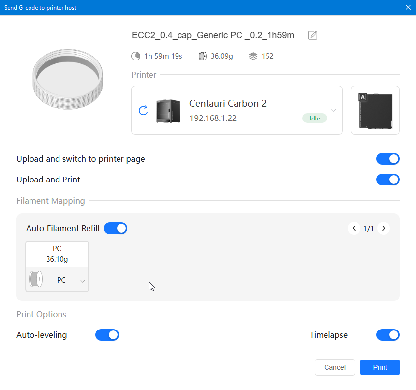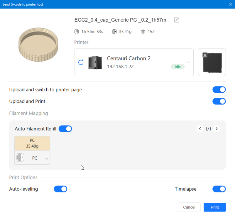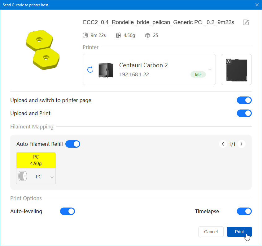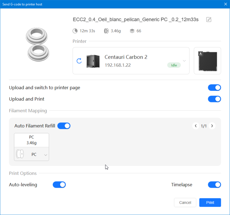 Comment t'es trop fort ! C'est bien cela ! Bingo ! PC White Anycubic PC Black Anycubic PC Translucent White Anycubic Que je compte tenter d'imprimer avec la Elegoo Centauri Carbon 2 que j'ai en test. (mais pas avant quelques jours car là j'imprime de l'ABS et je n'ai pas encore publié mes résultats PETG, TPU et ASA)3 points