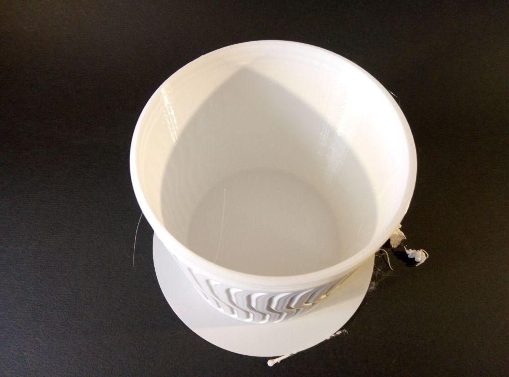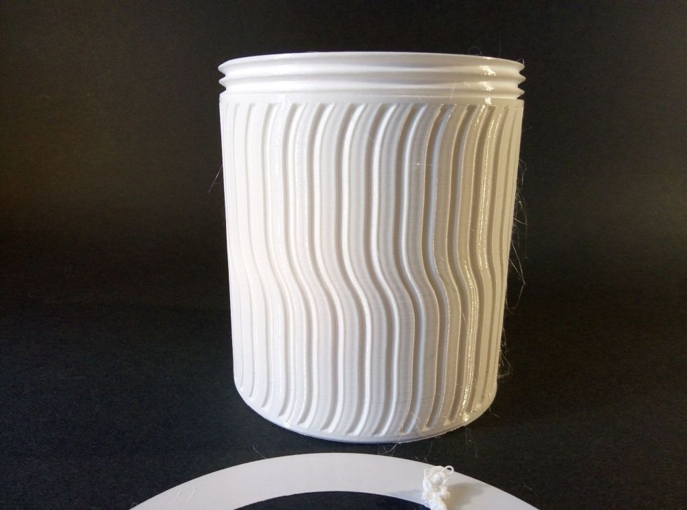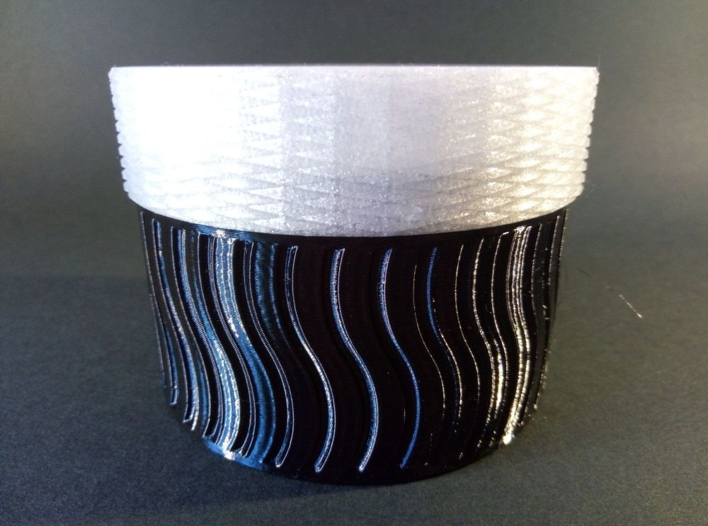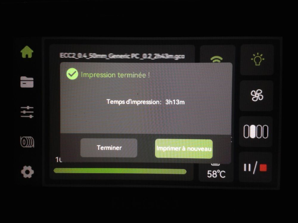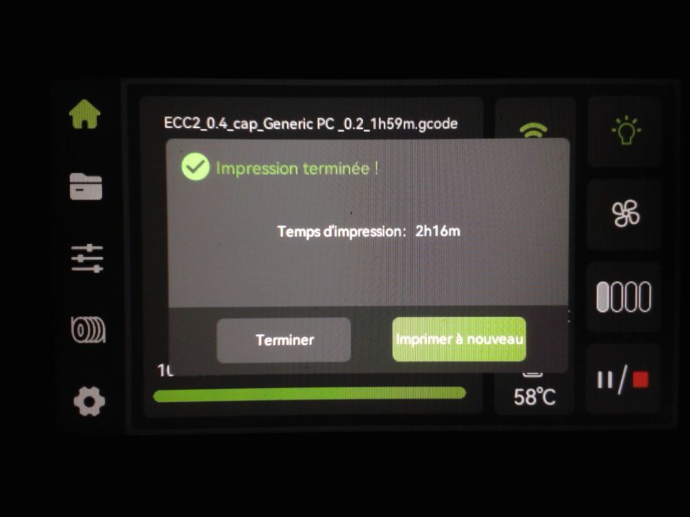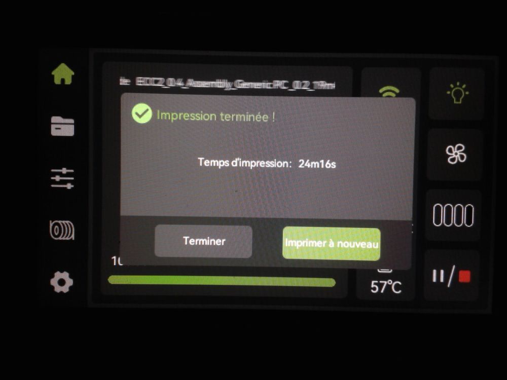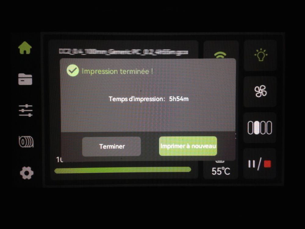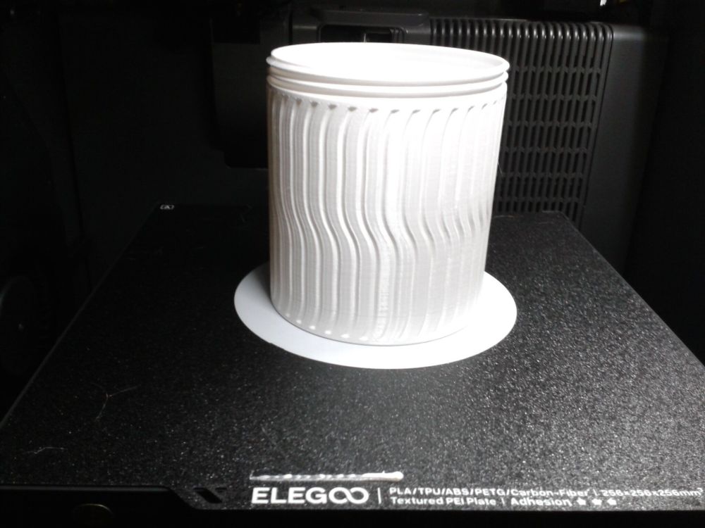 Autres impressions - ABS Je n'ai pas vraiment l'habitude d'imprimer de l'ABS. Mais je sais d'expérience que c'est un matériau bien moins facile à imprimer que le PLA. Il me semble que généralement l'ABS requiert un plateau parfaitement dégraissé car a une forte tendance à se décoller du plateau, Il faut un plateau bien chaud et une large bordure ("brim") d'impression. et préfère une enceinte chauffée pour ne pas gauchir (se déformer) et/ou avoir des délaminations des couches (les couches imprimées se séparent les unes des autres) lors de l'impression ou lors du refroidissement de ce matériau (préférer laisser l'impression refroidir lentement encore sur le plateau de l'imprimante après fin de son impression). Et il dégage une relativement forte odeur quand on l'imprime. (Être dans un espace bien ventilé et/ou avec un système de filtration de l'air et/ou avec un système d'extraction de l'air vers l'extérieur) J'ai donc préféré pour mes essais, me faire une sorte de surcaisson d'isolation thermique pour recouvrir le "capot thermique" plastique d'origine, pour tenter de gagner quelques degrés dans l'enceinte de l'imprimante lors de l'impression car sur la Centauri Carbon 2, l'enceinte n'a pas de système de chauffage dédié et c'est la chaleur diffusée par le plateau et la tête d'impression lors de l'impression qui chauffe indirectement l'enceinte. Si vous prenez le temps de préchauffer l'imprimante (buse et plateau), notez que la température cible de la buse se remet à 0 au bout de ~10 min (si imprimante inactive) avant de faire une impression en ABS. Vérifier de bien avoir sélectionné "maintenir la température" sur l'écran de contrôle de l'imprimante (cela ferme les clapets qui donnent sur le ventilateur d'extraction). Je n'ai pas trouvé comment faire l'équivalent de "maintenir la température" depuis l'onglet "Device" sous Elegoo Slicer v1.3.2.9 ( Firmware 01.03.01.89) Pour l'ensemble des impressions ABS suivantes, j'ai utilisé le profil filament "Elegoo ABS @ECC2" modifié (buse 270°C, plateau 110°C au lieu de 90°C, MVS 18 mm³/s, Flow 0.98 %) Filaments utilisés : ABS White Velleman, ABS Natural Velleman. Happy Octopus Pen Holder - Kumy https://www.nexprint.com/en/models/G2140368 Filament utilisé : ABS White Velleman Même fichier d'impression Filament utilisé : ABS Natural Velleman Zen Turtle Tray - Kumy https://www.nexprint.com/en/models/G8779612 Filament utilisé : ABS White Velleman Même fichier d'impression Filament utilisé : ABS Natural Velleman Ripple Isle – Wave-Textured Desktop Organizer - Yuki&Nan https://www.nexprint.com/en/models/C0328495 avant tranchage, modification de l'échelle, uniforme, pour obtenir un objet ayant une hauteur Z = 250 mm Filament utilisé : ABS Natural Velleman Vidéo du timelapse : sylo • container - h3liØ https://www.nexprint.com/en/models/G2102568 Mais avant de découper, sous le trancheur ElegooSlicer (v1.3..2.9), j'ai mis sur le même plateau le corps de la boite la moins haute avec un couvercle ( chaque élément est seul sur un plateau dans le fichier .3mf fourni par l'auteur) On peut remarquer quelques petits défauts d'impression du filetage du couvercle (avoir imprimé le corps et le couvercle de la boîte en même temps sur le même plateau et donc avoir pour chaque couche des déplacements entre le corps et le couvercle sont probablement la raison de ses petites imperfections d'impression du filetage du couvercle) Ici, j'ai utilisé la fin de ma bobine d'ABS Natural Velleman avec en "auto-refill" ( initialement paramétré avec la même couleur sur l'onglet "CANVAS" de la machine pour que l'"auto-refill" fonctionne sans intervention) une bobine d'ABS White Velleman. La fonction "auto-refill" a bien fonctionné sans avoir besoin de mon intervention. La quantité de filament restant sur la fin de la bobine d'ABS Natural Velleman n'a permis d'imprimer que quelques-unes des premières couches de cette impression. (Comme les couleurs de filaments utilisés sont relativement proches, cela ne se voit pas vraiment sur les photos, sauf quand on regarde à l'œil et avec une lumière adaptée les faces imprimées en contact avec le plateau.) Malgré les petits défauts d'impression du filetage du couvercle, le couvercle se visse et se dévisse bien du corps de la boîte. Pour l'ensemble de ses impressions en ABS On peut noter que grâce au surcaisson d'isolation thermique fait "à l'arrache" avec les mousses de transport, placé sur le "capot thermique" d'origine, dans mon environnement d'impression à ~17°C, buse 270°C, plateau 110°C, l'enceinte arrive à atteindre les ~57°C.7 points