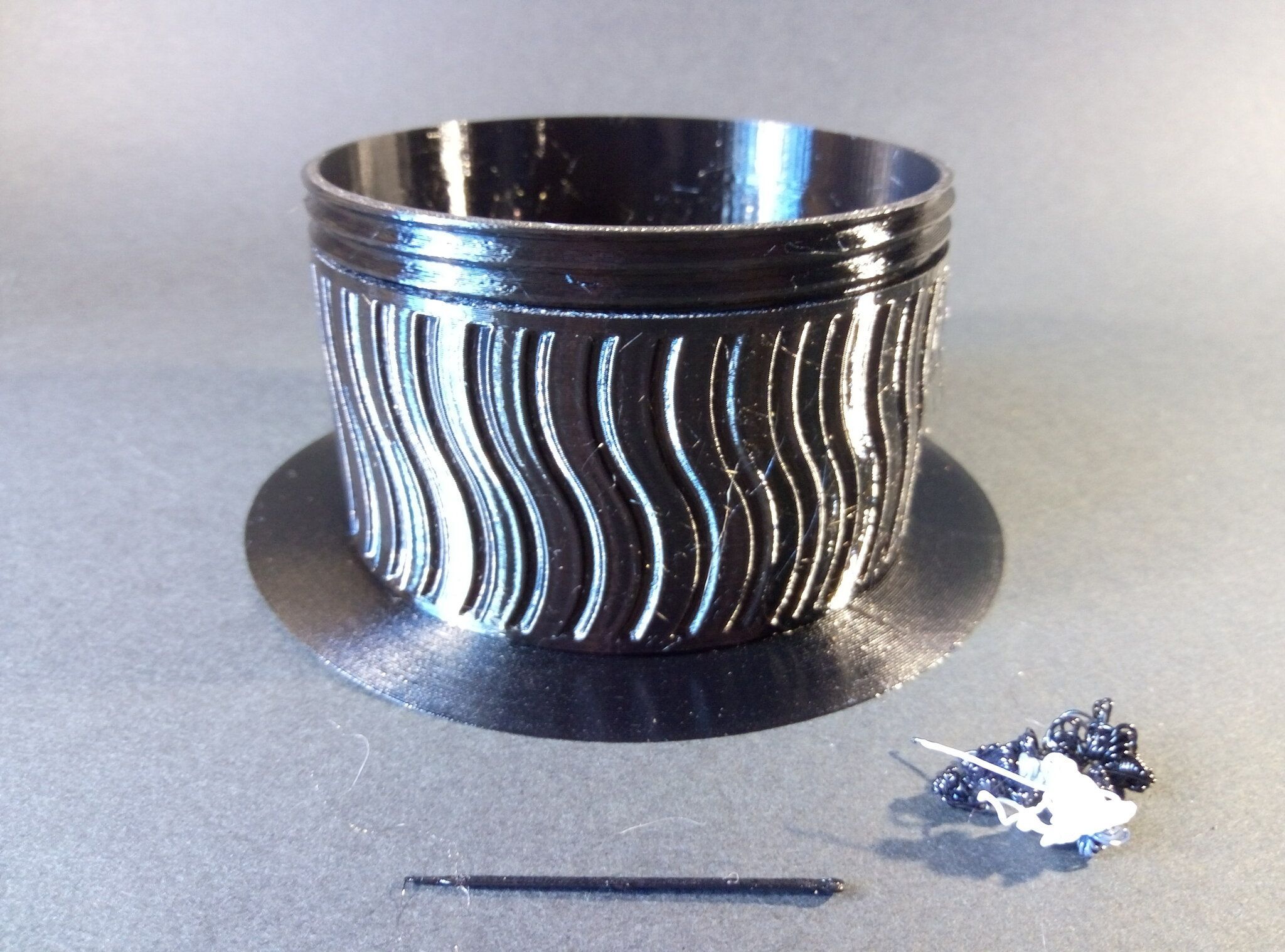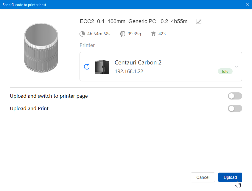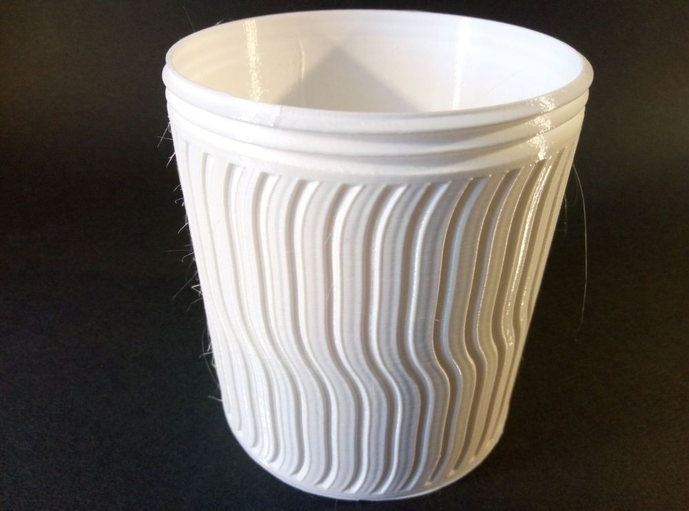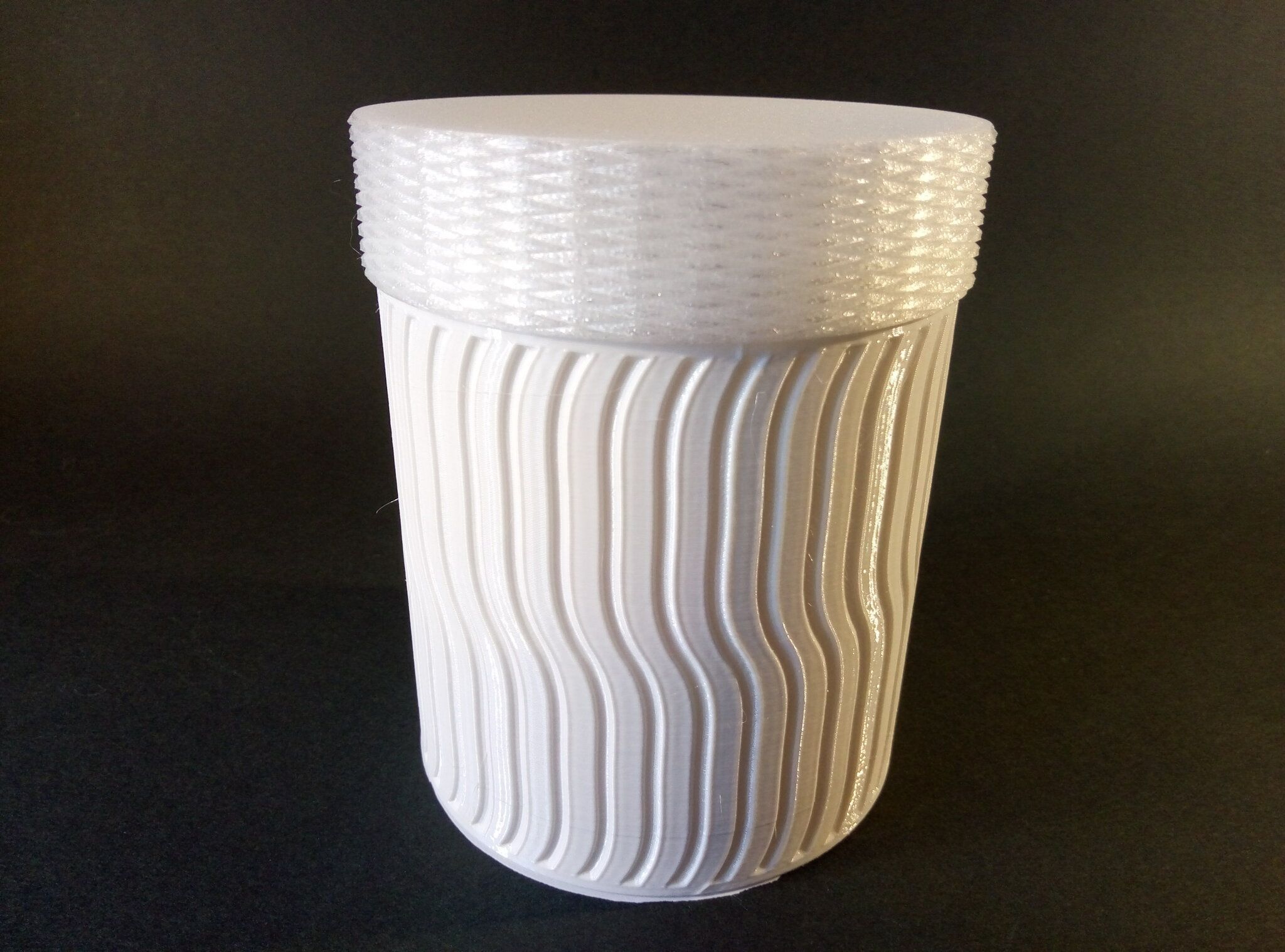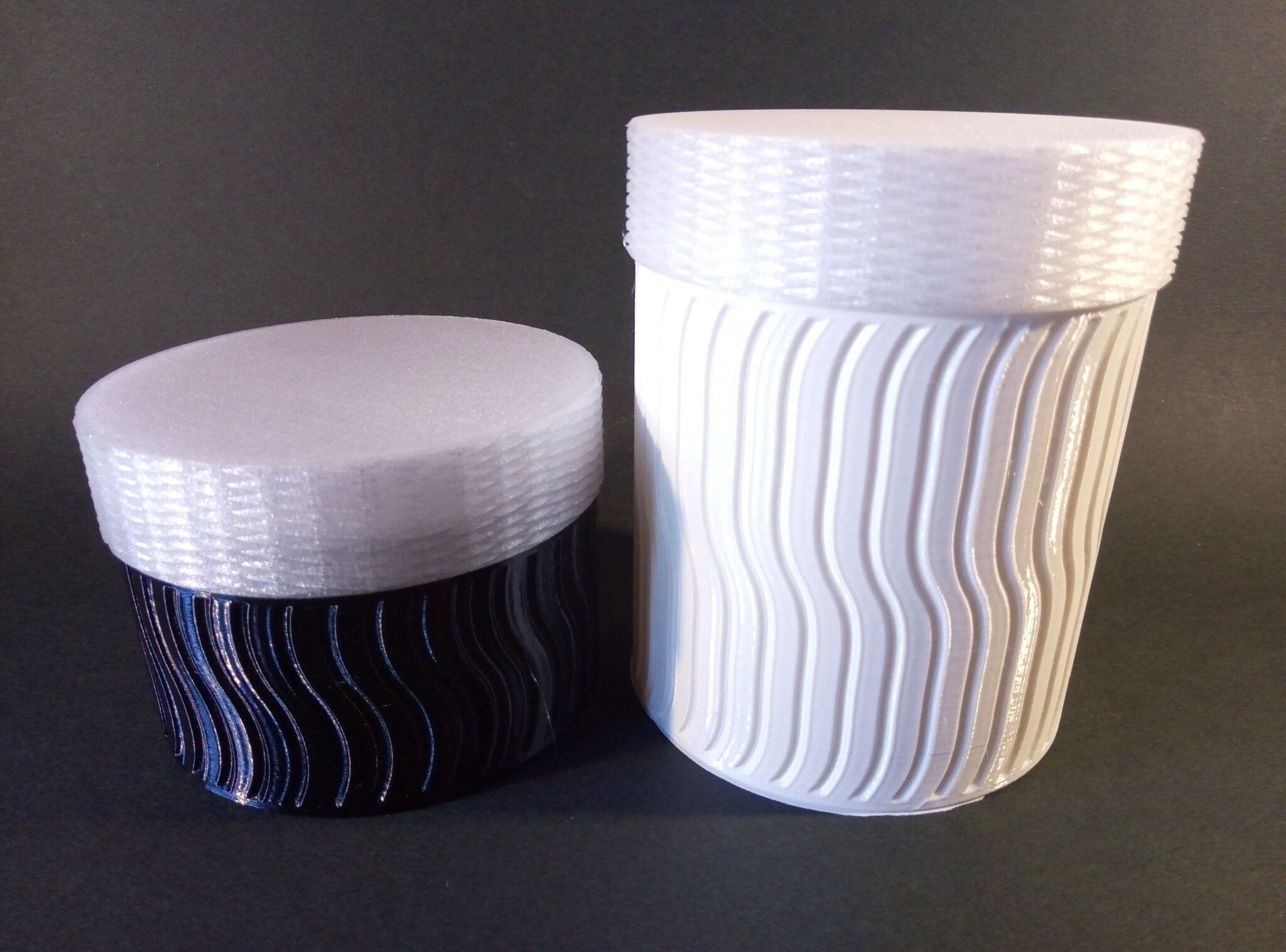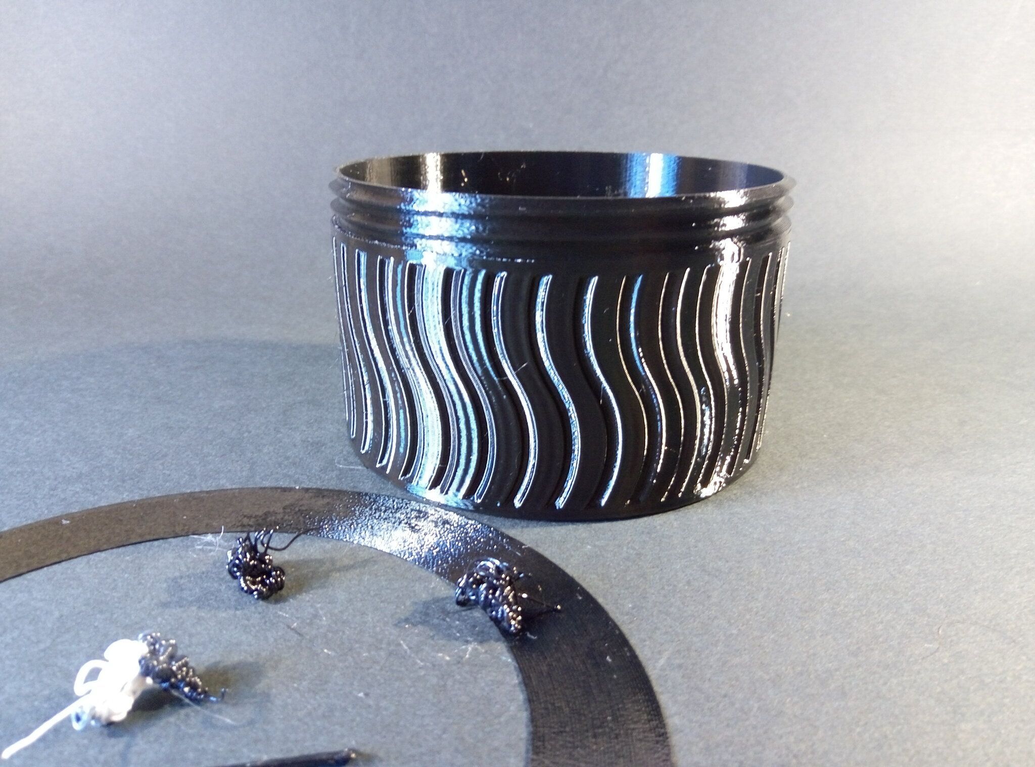 Autres impressions - ABS Je n'ai pas vraiment l'habitude d'imprimer de l'ABS. Mais je sais d'expérience que c'est un matériau bien moins facile à imprimer que le PLA. Il me semble que généralement l'ABS requiert un plateau parfaitement dégraissé car a une forte tendance à se décoller du plateau, Il faut un plateau bien chaud et une large bordure ("brim") d'impression. et préfère une enceinte chauffée pour ne pas gauchir (se déformer) et/ou avoir des délaminations des couches (les couches imprimées se séparent les unes des autres) lors de l'impression ou lors du refroidissement de ce matériau (préférer laisser l'impression refroidir lentement encore sur le plateau de l'imprimante après fin de son impression). Et il dégage une relativement forte odeur quand on l'imprime. (Être dans un espace bien ventilé et/ou avec un système de filtration de l'air et/ou avec un système d'extraction de l'air vers l'extérieur) J'ai donc préféré pour mes essais, me faire une sorte de surcaisson d'isolation thermique pour recouvrir le "capot thermique" plastique d'origine, pour tenter de gagner quelques degrés dans l'enceinte de l'imprimante lors de l'impression car sur la Centauri Carbon 2, l'enceinte n'a pas de système de chauffage dédié et c'est la chaleur diffusée par le plateau et la tête d'impression lors de l'impression qui chauffe indirectement l'enceinte. Si vous prenez le temps de préchauffer l'imprimante (buse et plateau), notez que la température cible de la buse se remet à 0 au bout de ~10 min (si imprimante inactive) avant de faire une impression en ABS. Vérifier de bien avoir sélectionné "maintenir la température" sur l'écran de contrôle de l'imprimante (cela ferme les clapets qui donnent sur le ventilateur d'extraction). Je n'ai pas trouvé comment faire l'équivalent de "maintenir la température" depuis l'onglet "Device" sous Elegoo Slicer v1.3.2.9 ( Firmware 01.03.01.89) Pour l'ensemble des impressions ABS suivantes, j'ai utilisé le profil filament "Elegoo ABS @ECC2" modifié (buse 270°C, plateau 110°C au lieu de 90°C, MVS 18 mm³/s, Flow 0.98 %) Filaments utilisés : ABS White Velleman, ABS Natural Velleman. Happy Octopus Pen Holder - Kumy https://www.nexprint.com/en/models/G2140368 Filament utilisé : ABS White Velleman Même fichier d'impression Filament utilisé : ABS Natural Velleman Zen Turtle Tray - Kumy https://www.nexprint.com/en/models/G8779612 Filament utilisé : ABS White Velleman Même fichier d'impression Filament utilisé : ABS Natural Velleman Ripple Isle – Wave-Textured Desktop Organizer - Yuki&Nan https://www.nexprint.com/en/models/C0328495 avant tranchage, modification de l'échelle, uniforme, pour obtenir un objet ayant une hauteur Z = 250 mm Filament utilisé : ABS Natural Velleman Vidéo du timelapse : sylo • container - h3liØ https://www.nexprint.com/en/models/G2102568 Mais avant de découper, sous le trancheur ElegooSlicer (v1.3..2.9), j'ai mis sur le même plateau le corps de la boite la moins haute avec un couvercle ( chaque élément est seul sur un plateau dans le fichier .3mf fourni par l'auteur) On peut remarquer quelques petits défauts d'impression du filetage du couvercle (avoir imprimé le corps et le couvercle de la boîte en même temps sur le même plateau et donc avoir pour chaque couche des déplacements entre le corps et le couvercle sont probablement la raison de ses petites imperfections d'impression du filetage du couvercle) Ici, j'ai utilisé la fin de ma bobine d'ABS Natural Velleman avec en "auto-refill" ( initialement paramétré avec la même couleur sur l'onglet "CANVAS" de la machine pour que l'"auto-refill" fonctionne sans intervention) une bobine d'ABS White Velleman. La fonction "auto-refill" a bien fonctionné sans avoir besoin de mon intervention. La quantité de filament restant sur la fin de la bobine d'ABS Natural Velleman n'a permis d'imprimer que quelques-unes des premières couches de cette impression. (Comme les couleurs de filaments utilisés sont relativement proches, cela ne se voit pas vraiment sur les photos, sauf quand on regarde à l'œil et avec une lumière adaptée les faces imprimées en contact avec le plateau.) Malgré les petits défauts d'impression du filetage du couvercle, le couvercle se visse et se dévisse bien du corps de la boîte. Pour l'ensemble de ses impressions en ABS On peut noter que grâce au surcaisson d'isolation thermique fait "à l'arrache" avec les mousses de transport, placé sur le "capot thermique" d'origine, dans mon environnement d'impression à ~17°C, buse 270°C, plateau 110°C, l'enceinte arrive à atteindre les ~57°C.7 points