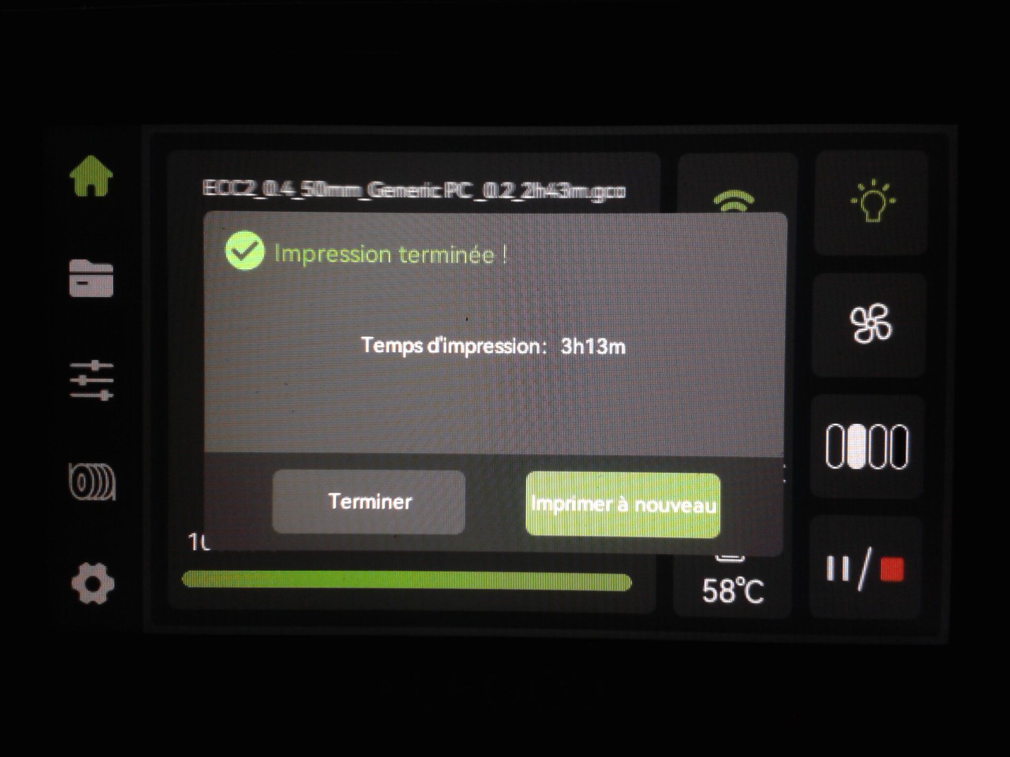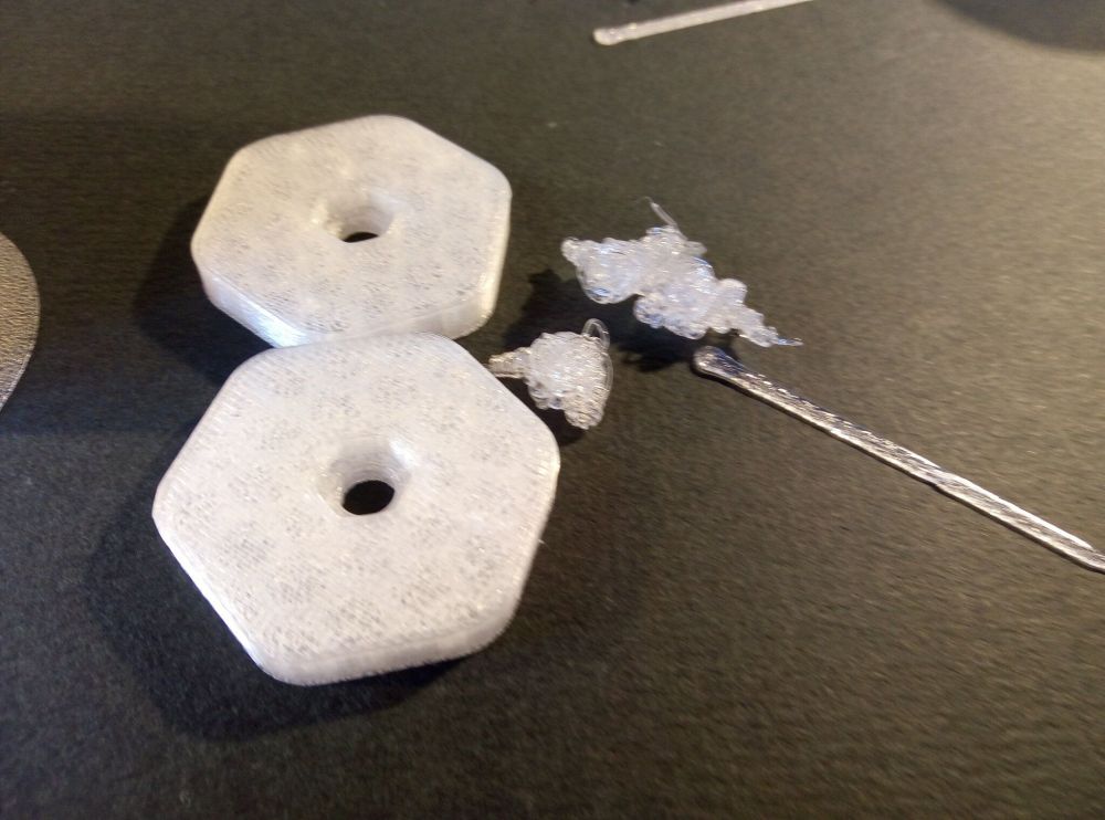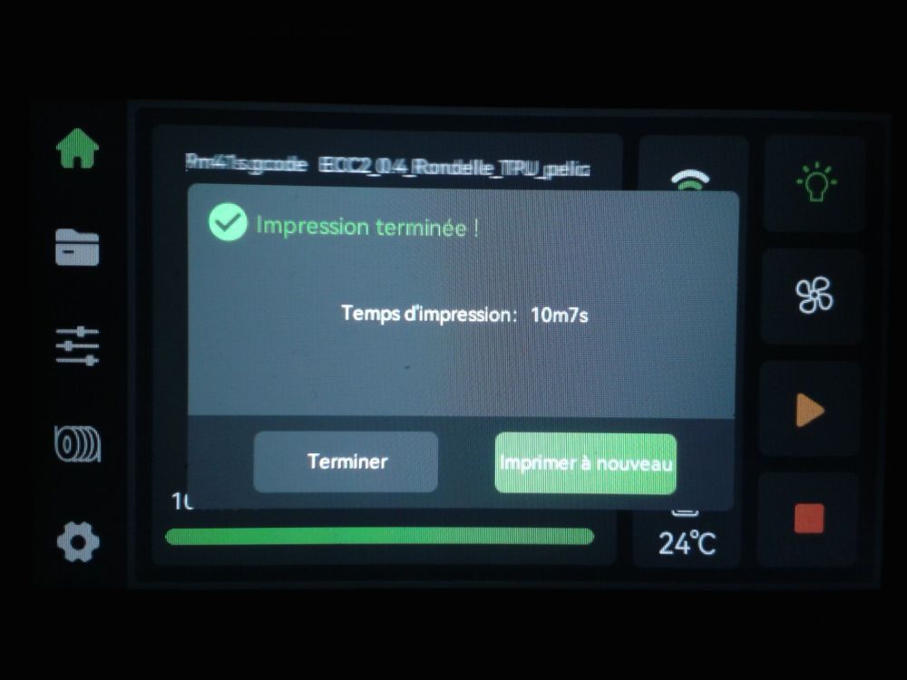Autres impressions - TPU Je n'ai pas essayé l'outil à imprimer, à utiliser pour les filaments flexibles, proposé par Elegoo pour contourner le système CANVAS. D'expérience, pour éviter les soucis d'impression avec les filaments TPU qui, selon leur dureté Shore, sont plus ou moins souples et élastiques, il faut Alimenter au plus direct le filament de la bobine à la tête d'impression. (sans détours ou passages qui pourraient être source de frottements) Utiliser un support de bobine qui laisse la bobine se dérouler avec le plus de facilité possible (lubrifier les roulements ou le manche du porte-bobine utilisé s'il en a). L'idée, c'est que comme le filament est élastique, il faut qu'il arrive avec le moins de frottement ou de tension d'étirement possible à l'entrée de l'extrudeur. (Il faut donc préférer un extrudeur de type "direct drive" comme c'est le cas sur la CC2 et éviter les extrudeurs montés en "bowden" où l'extrudeur doit pousser le filament dans un tube PTFE qui guide le filament jusqu'à la tête d'impression.) ce qui, sauf pour le filament TPU ayant une forte dureté Shore, fait que les systèmes automatisés de chargement de filament type AMS, CFS, ... et donc ici le système CANVAS sont à éviter, tout comme des hub filament, car le filament flexible y sera possiblement coincé, bourré ou étiré avant d'arriver à la tête d'impression, ce qui ne permettra pas un débit correct. Les filaments TPU ont vite tendance à prendre l'humidité (en moins de 24 h à l'air libre), ce qui augmente les cheveux d'ange ("stringing") et l'aspect rugueux des parois à l'impression. Il faut donc préférablement les sécher plusieurs heures à ~45-50°C avant usage (mais avoir laissé le temps au filament de revenir à température ambiante pour éviter qu'il soit plus mou et/ou élastique s'il est encore chaud). Pour mes essais, j'ai donc, machine éteinte, après avoir enlevé le capot de protection thermique déconnecter le système CANVAS Démonter le hub filament 4-1 ( 4 entrées, une sortie) maintenu par deux vis, à l'entrée de la tête d'impression, pour le temps de mes impressions avec du TPU le "coincer" dans les tubes PTFE au-dessus du système CANVAS. Cela afin d'alimenter directement la tête d'impression sans le hub 4-1, avec mon filament TPU. placer ma bobine de filament sur un système porte-bobine qui laisse la bobine se dérouler le plus facilement possible porte-bobine, lui-même placé sur un plateau d'une étagère, à plusieurs centimètres au-dessus de la machine. (pour que quand il y ait de rapides déplacements de la tête d'impression sur l'ensemble de la surface d'impression, il y ait un jeu angulaire de la partie déroulée du filament afin que cela ne tire pas d'un coup sec sur la bobine ... ) Pour ces impressions TPU, il n'y aura pas le capot de protection thermique en place sur l'imprimante. (Je ne voulais pas le percer ...) Et donc, malheureusement, les bruits de déplacements de la tête d'impression et de ses ventilateurs de refroidissement ne seront pas étouffés par la présence du capot thermique ) Bien noter que les supports de bobine d'origine fournis avec la CC2 ont un système de ressort qui permet de réenrouler partiellement la bobine afin que, quand on utilise le système CANVAS, lors des changements de filament, le filament soit légèrement sous tension et ainsi éviter l'enchevêtrement / les nœuds du filament sur la bobine suite à de multiples chargements / déchargements de celle-ci. Les supports de bobine d'origine fournis avec la CC2 ne sont donc pas recommandés avec un filament élastique comme le TPU car ils vont ajouter une tension sur le filament TPU et possiblement étirer le filament et risquer de gêner son passage dans l'extrudeur de la tête d'impression. Comme le système CANVAS n'est pas connecté, dans le menu Filament, il n'y a qu'une bobine et l'onglet est nommé "Bobine externe" ( au lieu de "CANVAS" quand ce dernier est connecté ) Les purges TPU ont tendance à se coincer dans le système de la chute des purges, j'ai donc ensuite évité d'utiliser "Charger" du menu Filament. J'ai préféré faire l'équivalent à ma sauce de "charger" mais de manière à ce que la tête reste à plusieurs centimètres au-dessus du plateau et en son centre. En allant dans le menu de préparation, pour mettre en chauffe la buse (240°C pour du TPU), (éventuellement faire un home XYZ si pas déjà fait depuis l'allumage de la machine), abaisser le plateau, placer la tête grossièrement au milieu du plateau, et quand buse à température, extruder plusieurs fois de suite via l'icône flèche vers le bas "V" de Extrudeuse, ... En paramètre filament, j'ai utilisé le profil "Generic TPU @System" ( buse 240°C, plateau 35°C, MVS 3.2 mm³/s ) sous ElegooSlicer v1.3.2.9 car le profil filament "Elegoo TPU 95A @ECC2" ( buse 225°C, plateau 35°C, MVS 3.2 mm³/s ) sous ElegooSlicer v1.3.2.9 me semblait avoir une température de buse trop basse pour mes filaments TPU ... J'ai testé du CR-TPU Green Creality (dureté Shore 95A) TPU 95A Translucide ArianePlast (dureté Shore 95A) TPU 85A Violet ArianePlast (dureté Shore 85A. Donc ce dernier est plus souple et élastique qu'un filament de dureté Shore 95A) Cute Mini Octopus - McGybeer https://www.nexprint.com/en/models/G1718064?keyword=cute+mini+octopus&printConfigId=G3350337 Chubby Dinosaur T-Rex Dino Pencil Holder - IK3D https://www.crealitycloud.com/model-detail/chubby-dinosaur-t-rex-dino-pencil-holder Lors de mes essais, le firmware alors sur ma machine en test (firmware v01.03.01.89) ignore les commandes G-code "M600", "M0" et bug (freeze/gèle de la machine) sur le G-code avancé "PAUSE". Il n'est donc pas possible (firmware v01.03.01.89) de faire un fichier d'impression avec une pause interactive pour effectuer un changement de filament quand le système CANVAS est déconnecté. (Quand le système CANVAS est connecté, faire un changement de filament vers un slo