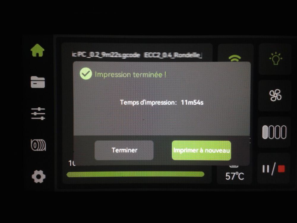 Pimp ma Sidewinder X4 Plus S1 Afin de ne pas polluer des sujets plus techniques : "Artillery Sidewinder X4 Pro et Plus, tout ce qu'il faut savoir" : et "Problèmes d'impression avec Artillery Sidewinder X4 Plus S1" : , j'ouvre ici un sujet concernant les améliorations et accessoires concernant ma Sidewinder X4 Plus S1, mais aussi les votre. Après divers tests/réglages en tous genres, avoir lus quelques sujets sur le forum, voici les « améliorations et accessoires» à ce jour sur ma Sidewinder X4 Plus S1, ainsi que celles à venir. « Améliorations et accessoires» en place : - Cette imprimante n'étant pas équipée d'origine de molettes pour faire le leveling du plateau, qui m'a donné de bonne prise de tête, je m'en suis imprimé un jeu. Vous pouvez les trouver ici : https://www.thingiverse.com/thing:7322297 Avec un petit schéma pour savoir dans quel sens tourner les molettes pour compenser en fonction du schéma du "Bed Mesh" dans Orca/Klipper, cela facilite le leveling, sans avoir à utiliser de clé plate pour serrer ou desserrer les molettes. - Le support bobine sur le portique n'étant pas top, j'en ai trouver un avec des roulements (608ZZ) qui rend beaucoup plus fluide le déroulement de la bobine sans à-coup. Mais il est destiné à ne plus être trop utilisé. Vous pouvez le trouver ici : https://www.thingiverse.com/thing:6979154 - N'étant pas un grand fan des bobines sur le portique, et utilisant aussi de grandes bobines (2.5kg) donc non utilisables sur le portique, je suis parti à la recherche d'un accessoire pour pouvoir mettre celles-ci sur le coté. Vous pouvez le trouver ici : https://www.printables.com/model/1249019-artillery-sidewinder-x3x4-filament-side-guide J'ai ainsi pu utiliser mes anciens supports de bobine de bureau. Vous pouvez les trouver ici (https://www.thingiverse.com/thing:2047554) et ici pour les grandes bobines (https://www.thingiverse.com/thing:3885870) - J'ai aussi modifié le support du capteur de fin de filament, afin de le déporter un petit peu sans qu'il n'y ai de gêne. - Le tiroir d'origine demande de petits doigts afin de pouvoir attraper le semblant de poignée, donc petite recherche. Il est un peu trop lâche, mais avec un morceau d'adhésif double face, il ne bouge plus et permet une bien meilleure prise. Vous pouvez le trouver ici https://www.thingiverse.com/thing:6565703 Je trouve aussi qu'il y a un gros jeu avec l'emplacement d'origine dans la machine, donc je vais peut être voir pour en faire un beaucoup moins lâche. - Un petit guide fil se vissant sur le support bobine d'origine pour aider à guider le fil entre le "guide de coté" et le capteur de fin. J'ai relié les deux avec un tube PTFE, qui me restait. [ - Un support lingette microfibre bien pratique pour le nettoyage du plateau avec l'alcool isopropylique. Vous pouvez le trouver ici : https://makerworld.com/fr/models/386963-build-plate-cleaner#profileId-343275 Ma Sidewinder à ce jour « Améliorations et accessoires» prévues, pas obligatoirement dans cet ordre : - Peut être remplacer la coque de l'extruder par celle-ci mieux optimisée. Elle est disponible par Artillery sur le groupe Facebook : "Artillery Sidewinder X4 User Group [Official]", dans les publications épinglées. Mais aussi, repostée ici : https://www.thingiverse.com/thing:6683721 - Voir pour éventuellement remplacer le ventilateur turbine de la coque par un plus silencieux. - Faire un support pour le capteur de compensation de résonnance ADXL345 (fourni d'origine), afin qu'il ne traine plus sur le bureau. - Faire un support pour les outils, tels que la spatule, la pince, et autres... - Mettre des organiseurs de cables, pour qu'ils soient mieux rangés/maintenus. Voilà pour l’instant l’évolution de ma Sidewinder X4 Plus S1. Toutes remarques/critiques et commentaires sont les bienvenus du moment qu’ils soient constructifs Keryn4 points