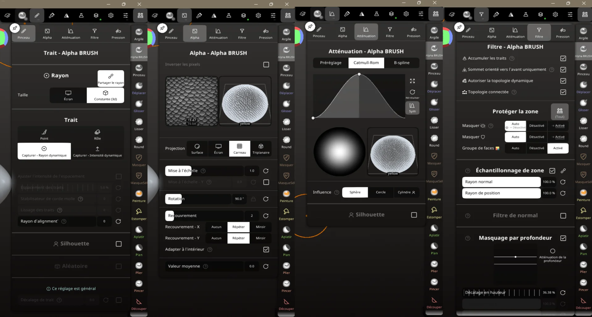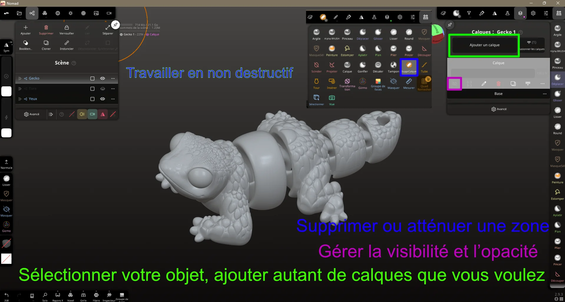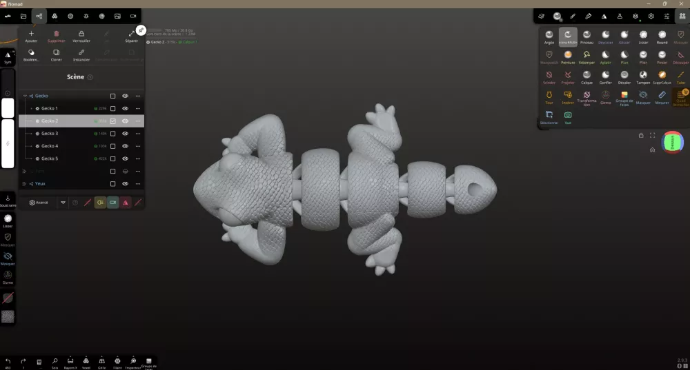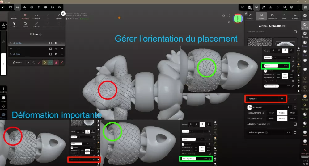 Travailler rapidement en utilisant les calques. Une fois votre modèle fini, vous pouvez le modifier et tester des choses de façon quasi “infinie”. Ajouter un calque et le tour est joué. Vous appliquez vos pinceaux et autres opérations dessus, vous pouvez le masquer et gérer l’opacité. On va changer la texture pour une autre. On fait des textures épaisses, adaptées au FDM ici. On règle l’orientation de notre placement avec Rotation. Ici, j’ai utilisé un pinceau large. J’ai peint sur des zones non voulues. Dans la boîte d’outils de droite, je sélectionne Supprimer le calque et je supprime la texture. Résultat Réglage utilisé J’ai dupliqué le pinceau Argile, je l’ai réglé et sauvegardé comme pinceau personnalisé.1 point