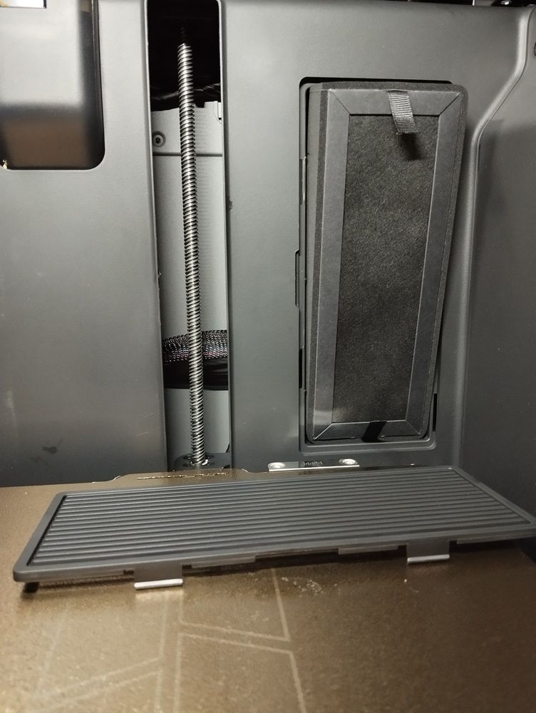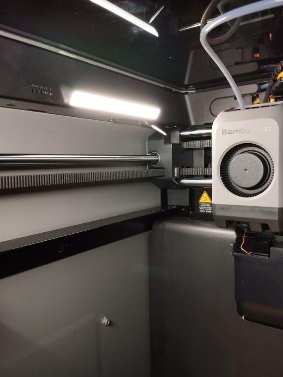Après cette première impression, d'autres suivront qu'elles sont les nouveautés de la P2S ? Le nouveau ventilateur additionnel et la filtration Il est situé sur la droite de la machine par rapport à la P1S ou il était situé à gauche, c'est plus qu'un simple ventilateur additionnel c'est le système d’air adaptatif Active Airflow, il est équipé de 2 volets permettant de soit amener l'air frais pour des filaments genre PLA et de maintenir une température acceptable pour ce filament ou soit de recycler l'air chaud de l'intérieur de la machine permettant ainsi de garder et de faire monter la chaleur pour des filaments technique ou pour l'ABS/ASA, d'après la documentation ce système permettrait de monter la température de la chambre à 55°. Bonne nouvelle, le ventilateur est relativement silencieux et pour le PLA ça permet de laisser la vitre du dessus et la porte fermée, résultat également intéressant la machine est moins bruyante. Avec un lit à 55° et après une impression de 4 heures la température interne était de 32° et le capteur de température est tout en haut de la machine à l'endroit le plus chaud . Au niveau filtration, un filtre à charbon de bonne taille à été installé, à ce stade du test, je n'ai pas encore imprimé d'ABS ou d'ASA pour voir ou plutôt sentir si ce filtre est efficace. La caméra et l'éclairage Une nouvelle caméra 1080P sans doute héritée de la série H2 a pris place à l'avant gauche, les images et les vidéos timelapse sont de très bonnes qualités, le défilement est fluide c'est vraiment une bonne surprise par rapport à la P1S. L'éclairage à led a été amélioré et on y voit très bien par rapport à d'autres machines que j'ai testé4 points