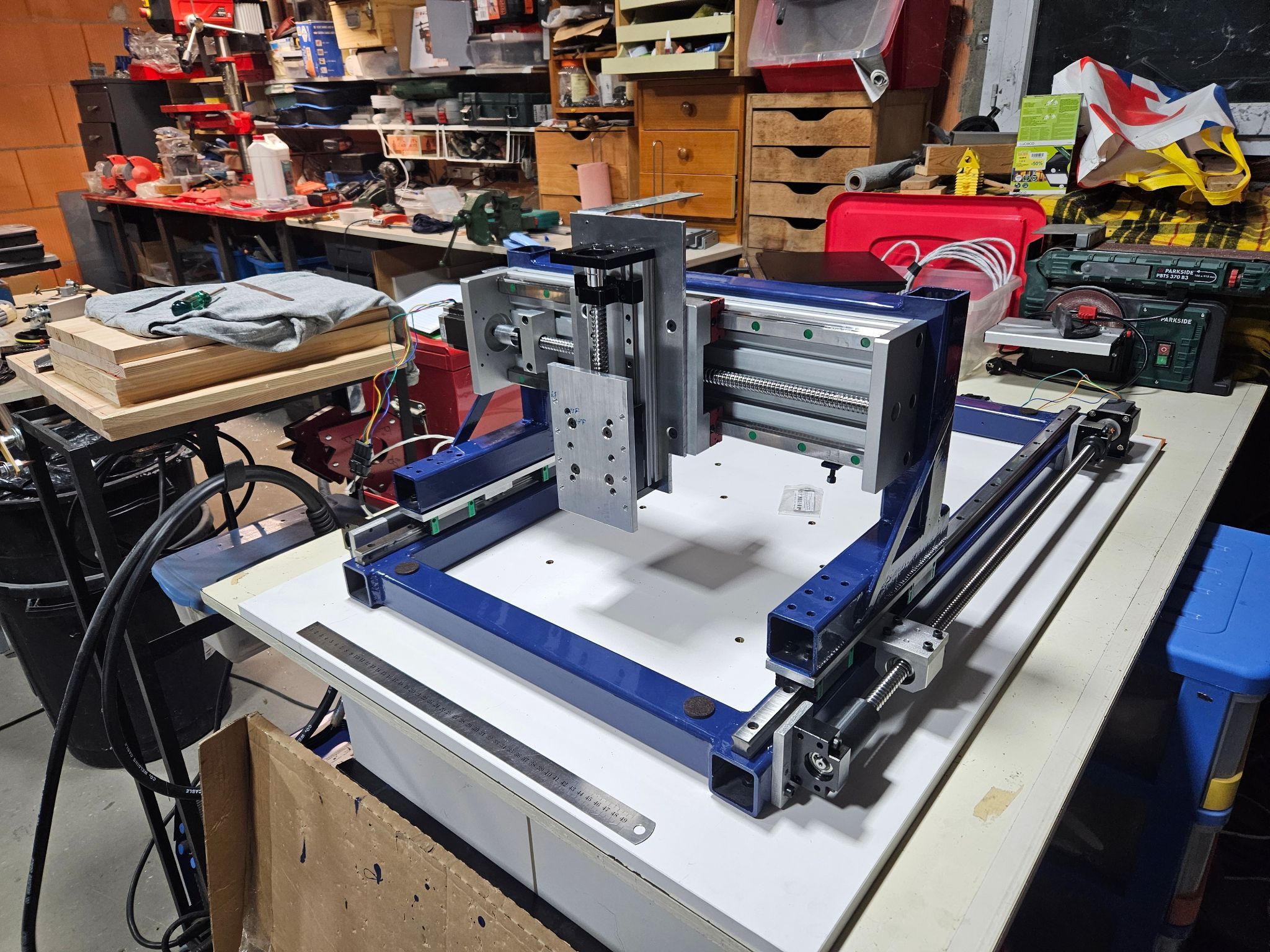 Et bien voilà, gros weekend sur ma cnc. Samedi, pointage soudure, redressage et contrôle de la mécano. J'ai pris énormément de précautions tout au long des soudures, je n'ai eu que les deux poutres longitudinales qui se sont cintrées d'un millimètre que j'ai pu redressé avec un cric hydraulique, pas de gauche sur la planéité des appuis des rails. Sur la mécano mobile, j'ai eu un peu de gauche sur la planéité d'appui des patins, avec un peu de calage, tout était OK. J'ai pu donc faire un montage à blanc de la partie Y avec les rails et les vis à billes, j'ai vérifié la course, les butées mécaniques sur les vis. J'ai contrôlé la perpendicularité de l'appui X, à l'équerre ça parait parfait, au niveau numérique 0.2°, je verrai si je cale la table X pour si peu de défaut. J'ai pu faire bouger l'axe Y avec CNCJS, c'est une grosse étape, j'ai du mettre des connecteurs sur les moteurs Y et des câbles blindés jusqu'au contrôleur. Dimanche, contreperçage des plaques supports des vis à billes, pour les futures goupilles. Démontage de toutes les parties mécaniques. Dégraissage et mise en peinture avec un apprêt en bombe. Direction Casto, pour la planche 80*120 cm qui va recevoir la CNC, j'ai prévu quelques insert M8 pour la mise en place de brides de serrage. Découpage des plaques de plexiglas qui serviront à réduire les projections de copeaux. Première couche de peinture et c'est bon pour ce weekend.4 points