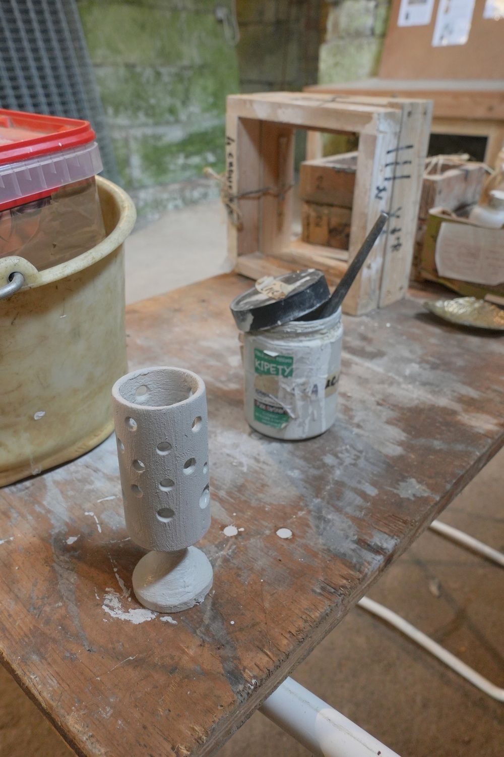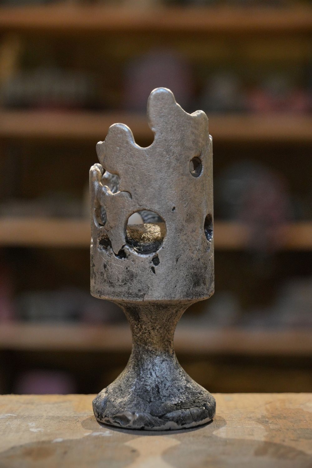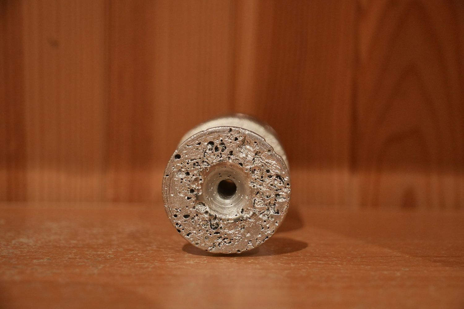 Bonjour à tous, Avec un peu de retard, je partage la pièce que j'ai réalisée cette année aux Journées du Partimoine à Montagney-Servigney. Nous avons fait cette année de la fonderie aluminium, et j'ai eu envie de tester à nouveau le procédé "lost-foam". C'est un procédé dans lequel on créé un modèle en polystyrène, qui est ensuite placé dans un moule avec du sable fluide. Le métal en fusion est coulé directement dessus et prend la place du polystyrène. Ce procédé a été mis au point par Peugeot dans les années 60 pour couler des culasses de moteur, il est encore utilisé aujourd'hui. Un de mes clients, en Franche-Comté, possède une ligne de moulage loast foam pour fabriquer des disques de frein et des tambours de freins de poids lourds en fonte. Je fabrique un modèle, avec une forme volontairement compliquée pour tester les limites du procédé. Je n'ai pas trouvé de quelle façon ajouter des canaux pour faciliter l'évacuation des gaz, donc la pièce sera probablement incomplète. Le but de l'expérience est de connaitre la profondeur limite possible sans canaux. La pièce a été taillée dans un morceau de polystyrène extrudé servant à l'isolation des bâtiments. J'ai utilisé des techniques plus ou moins barbares - d'abord une perceuse à colonne avec un mèche à bouchonner pour faire un gros trou non débouchant assez profond - une scie circulaire de table, avec un support bricolé avec un tube pour réaliser le "tournage" de la partie cylindrique extérieure par sciages successifs - ensuite, une ponceuse oscillante de table pour tailler le pied - enfin, un système à fil chaud pour réaliser les trous Voici les outils utilisés sur place : une caisse en bois pour le moule, un enduit réfractaire avec un pinceau, un couvercle avec un poids (le morceau de rail de chemin de fer) et un maillet pour vibrer le sable La pièce est recouverte de deux couches généreuses d'enduit réfractaire (c'est une mixture à base d'alcool et de poudre d'alumine) : On laisse sécher une bonne demi-heure. La pièce est placée dans le moule qu'on remplit de sable : Le cul de la pièce a été peint en noir pour être bien visible par rapport au sable qui est blanc. C'est indispensable car lors de la coulée, les opérateurs portent une visière de protection, et ils sont aveuglés par l'éclat du métal en fusion. On place le couvercle avec le poids par dessus et on vibre en donnant des coups de maillet : Le moule est prêt pour la coulée. A côté, on peut voir d'autres moules réalisés de façon traditionnelle, avec des modèles en bois qui ont été retirés : La coulée de aluminium liquide : Le polystyrène se consume rapidement en dégageant une fumée épaisse : On laisse refroidir : On démoule. Comme je m'y attendais, la pièce n'est pas complète, mais le résultat est pas mal : De retour chez moi, quelques travaux de nettoyage et de finition. Je dois notamment creuser la pièce au tour à métaux car, même en ayant vibré soigneusement le sable, il n'a pas rempli complétement le fond de la pièce en haut (je rappelle que la pièce est coulée la tête en bas) Même si la pièce est incomplète, elle est en fait très jolie, et même plus jolie que si elle avait été complète. C'est, en quelque sorte, un échec réussi On se rend compte de la finesse des détails qui sont rendus par le procédé, l'état de surface du modèle en polystyrène est très bien rendu. Bien sûr, la pièce à des défauts également. On remarque aussi que j'ai percé la pièce au tour à métaux. Il y a deux raisons : - faciliter l'usinage - permettre le passage de fils électriques pour alimenter un éclairage LED Si on place une petite bougie à l'intérieur, le résultat est vraiment sympa : A bientôt !