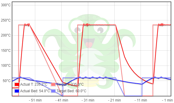 Salut à tous, J'ai un soucis un peu étrange sur mon AM8. J'ai lancé une impression qui a planté au bout de 3h. Octoprint m'indique un thermal runaway sur le bed. Je reconnecte l'imprimante à octoprint, je vois bien les températures du lit et de la tête. Je relance une petite impression et ça plante 4 fois à la suite, jamais au même moment mais toujours avec le même soucis et j'ai finalement toujours les bonnes températures de la tête et de la buse. Est-ce que j'ai une soudure sèche ? Est-ce le MOSFET ? Pour info, voici les courbes des 3 denières impressions qui ont planté : J'ai quand même l'impression que la température du lit chute en dessous de 54° lorsque ça plante. Merci