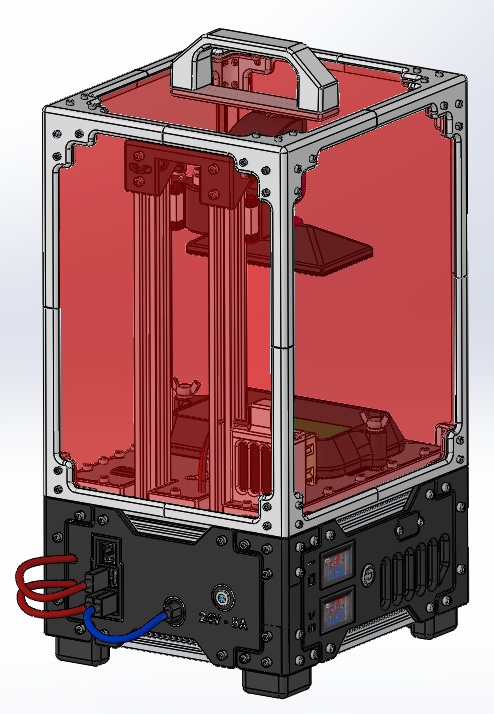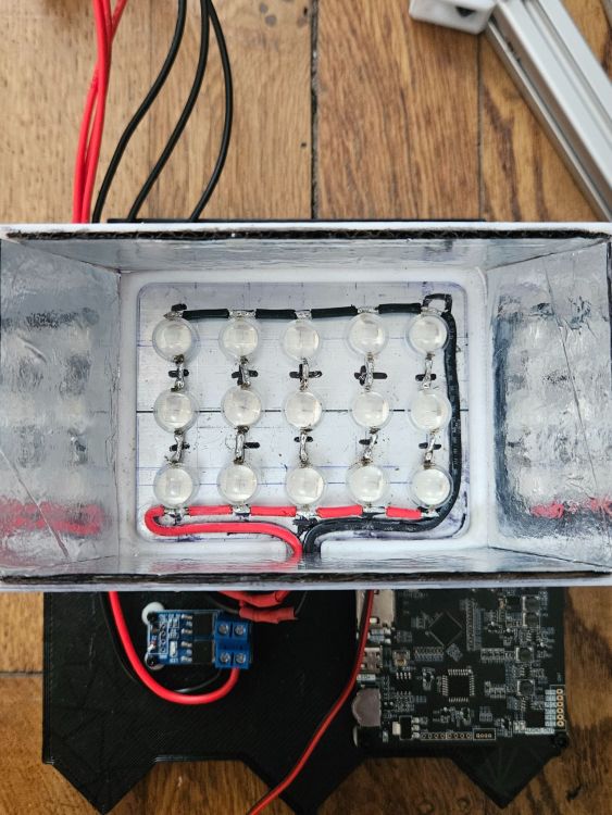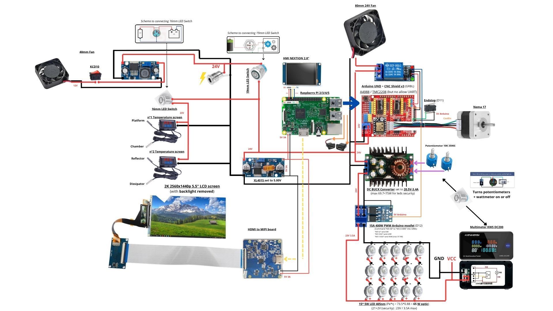 Bonjour à tous, Quelques news de la v2 en cours d'assemblage ! Bon, évidemment, encore une fois tout a changé Chaque pièce est améliorée, et je ne saurais même pas par où commencer. En gros maintenant : plus de problèmes (j'espère du moins) 3x plus de puissance UV (donc gain de rapidité) beaucoup moins bruyante (ventilo silencieux + TMC2208) moins de vis, assemblage/démontage rapide régulation en direct de la puissance + 4 endroits où la température est relevée passage de 12V à 24V Lit d'impression monté sur rotule câblage propre, électronique stable, ports USB (pour éclairage LEDs et caméra RPI en option) Le problème majeur est que la résine ronge le plastique, d'après mes tests le PLA résiste un peu mieux que le PETG. J'applique donc de la résine époxy sur toutes mes pièces en contact avec. Pour la plaque supérieure soutenant le réservoir, j'ai coulé de la résine directement dessus, les parois étant plus hautes que le fond. Heureusement je n'ai pas oublié de placer les aimants avec de mettre la résine J'ai mis quelques gouttes de résine sur le revêtement en époxy, et après 2 jours de contact il n'y a rien eu, ce qui me rassure. Grâce à @Kachidoki et l'i3-RDX, mes plaques latérales sont maintenant en double couleur Les plus grosses modifications sont au niveau des LEDs et de l'électronique. Je passe de 4 LEDs 10W à 15 LEDs de 5W, pour une puissance max d'environ 75W. J'utilise donc une alimentation de 24V pour soulager l'intensité présente dans la machine (21V et 3,5A niveau UV). Un ventilo de 80mm positionné verticalement vient refroidir les dissipateurs sous les LEDs. Des lentilles de 60° sont positionnées sur les LEDs, afin d'optimiser le flux lumineux venant sous l'écran. Le réflecteur est maintenant recouvert de Mylar et non plus d'aluminium. J'avais prévu d'assembler l'imprimante rapidement, mais il me manque encore quelques pièces à recevoir, l'électronique a changé entre-temps (régulateurs DC) Voici le schéma électrique, qui est un peu plus complexe qu'avant : A bientôt