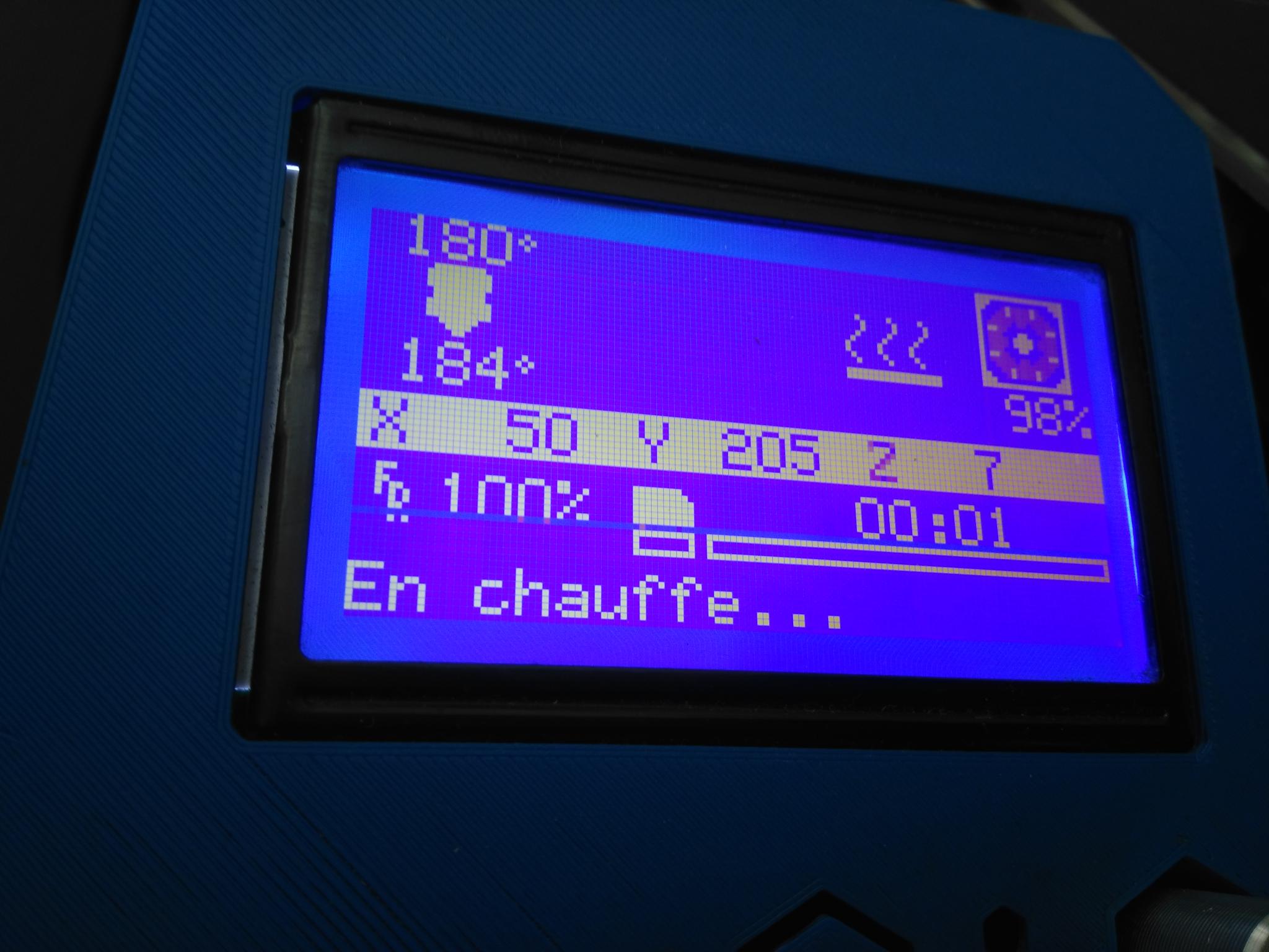 Description du problème: je sélectionne le fichier avec l'écran, l'imprimante chauffe normalement, elle fait plusieurs mouvements habituels (palpe les coins du plateau), puis la tête va se mettre à l'avant du plateau (là où se fait la purge), mais ne bouge plus par la suite. Elle reste "en chauffe" indéfiniment et rien ne se passe. Aucun bruit suspect a priori.
