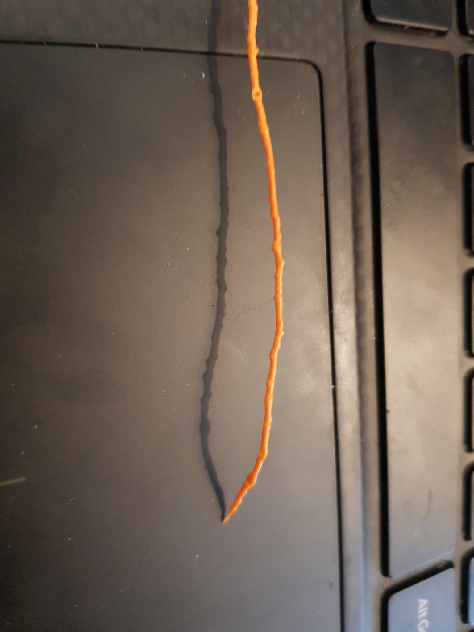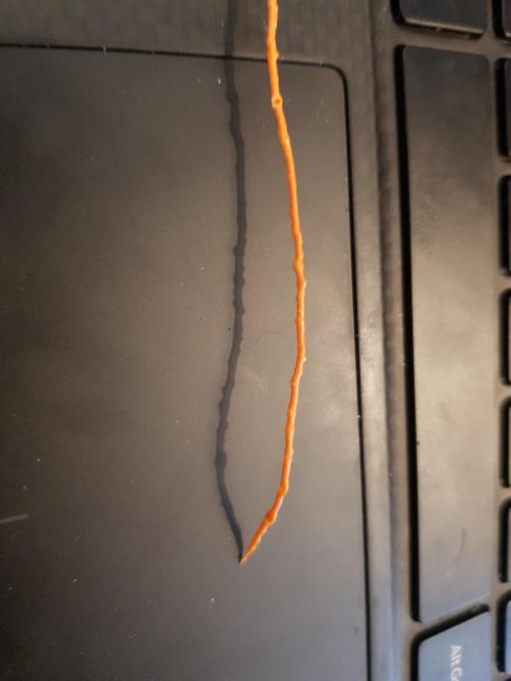 J'ai fini par tout démonter, changer la buse, tout nettoyer et rien y fait ! Ce qui me fait dire qu'il y a un vrai problème est que lorsque je demande à l'extrudeur de me sortir 30mm de filament, celui sort de la buse avec des bulles. D'ailleurs, on perçoit comme des petits craquements (même une fois l'extrudeur au repos) comme si cela pétillait à l'intérieur du corps de chauffe. Je vous joins une photo de ce que cela donne.