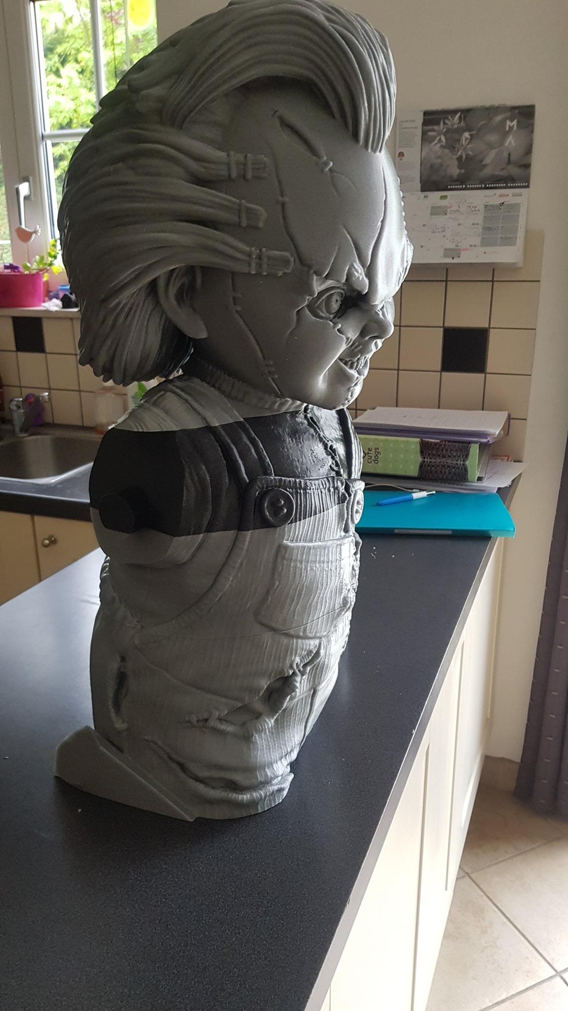 Bonjour , voici un petit retour après 2 mois de re modification et différent test smoothie et s3D.... je commence à être vraiment très correcte .... voici mon print en court : Chucky Life size ....89cm de haut .... 500 heure .... mais un hibou m a permit de valider le commencement de mon Chucky ..... -