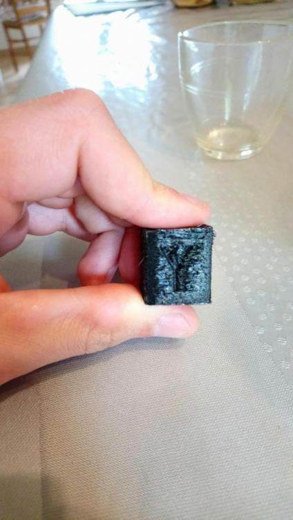 Du coup maintenant j'ai vu qu'on pouvait régler l'axe z. C'est ce que j'ai fait, la buse frottait sur ce qu'elle venait de poser ce qui faisait sauter des crans au la courroie du plateau. Maintenant elle ne touche plus et j'obtiens enfin une pièce final ! Ça fait 4 mois que je l'ai et c'est la première fois que je réussi donc c'est pour ça que je trouve que mon cube est plutôt bien. Après des défauts il y en a et justement je n'ai aucune idée des réglages restants et je n'ai absolument pas envie de tout recommencer, je l'ai déjà fait plusieurs fois. Je vais essayer de regarder mes courroies, elles sont peut être détendus ou alors les serrages ça peut être ça. Maintenant j'ai imprimée une autre pièce qui rend plutôt bien je trouve mais toujours pareil il y a un côté je je trouve nickel et l'autre qui est bof bof ( même si pour moi rien que le fait d'avoir réussi a l'imprimer est énorme ) je vous met les photos