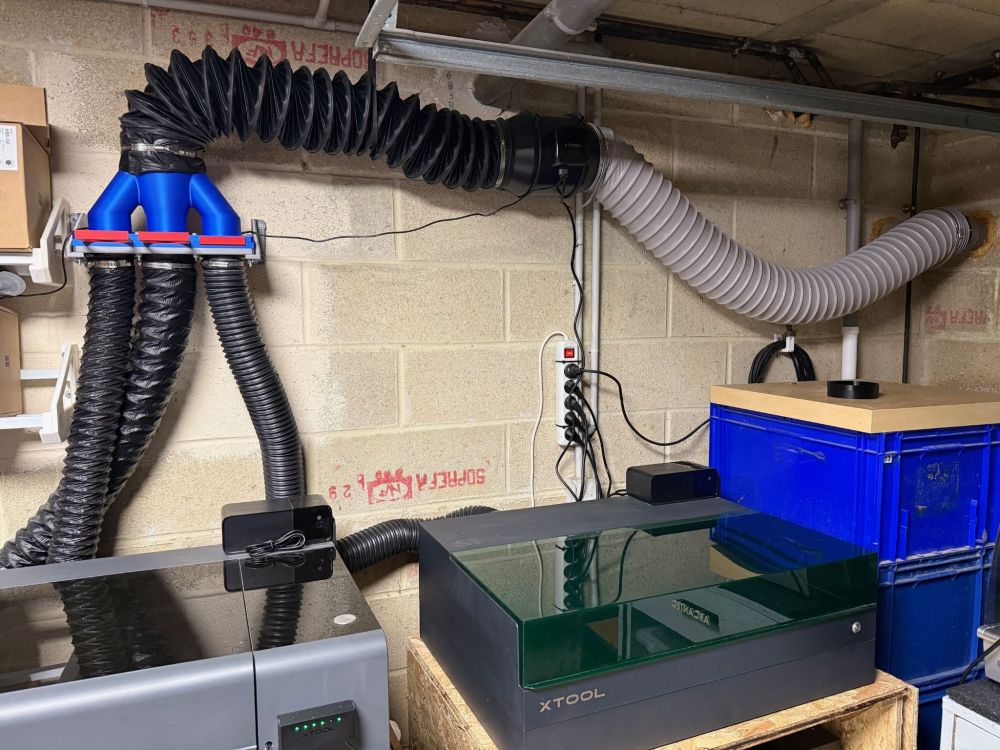 L'installation de l'évacuation centralisée est finie et son fonctionnement est efficace, mais cela reste bruyant. Le gros avantage, je n'ai plus de filtres onéreux à changer et la filtration laissait passer quelques odeurs. Le sélecteur (en bleu) remplit très bien sa fonction, il n'y a pas de fuite. La Makera est maintenant installée, mais toujours pas mise en service, car je n'ai pas le temps à lui consacrer (dommage, parce qu'elle ne plait bien cette petite bécane).