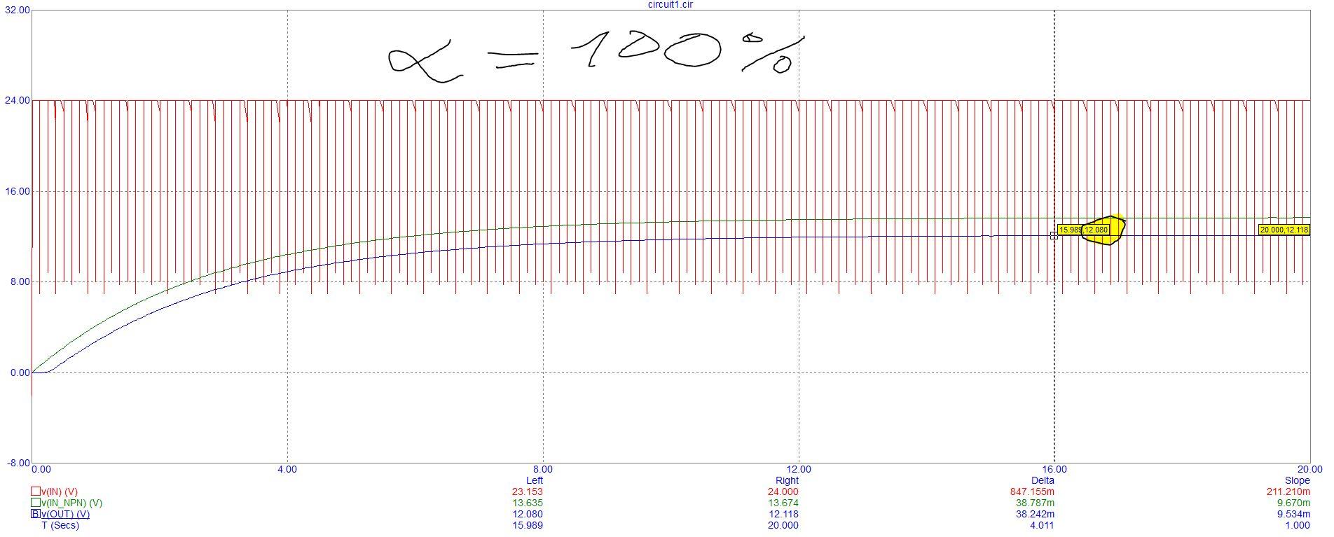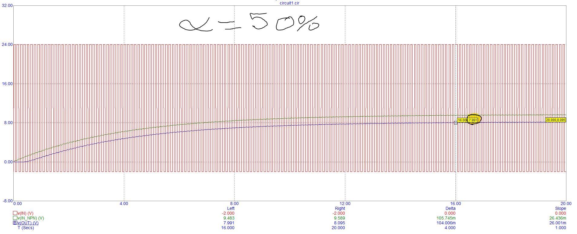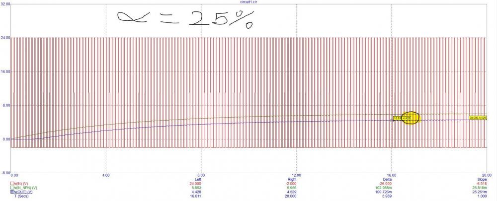 11. Salut, en complément des supers montages de @Janpolanton pour filtré le PWM 24V du ventilo, je voulais vous partager mon montage, bien que celui de @Janpolanton avec un aop marchant certainement très bien, j'ai théoriquement (sur logiciel) réussi a faire un montage assez simple avec des transistors pour ceux qui voudrais ce bricoler un filtre eux même sans AOP. Ce montage, devrait théoriquement être indépendant (jusqu'a un certain point tout de même) de la charge (ventilateur) et des transistors utilisés. Je vous met la photo du montage, je fais les tests avec GBF et oscillo demain et si c'est concluant je le monte sur l'imprimante dans la semaine prochaine. Je vous poste le montage avant d'essayer parce que comme ça si vous voyez quelque chose de bizarre n’hésiter pas ça pourrait m'éviter de cramer ma U30 . Je tiens a préciser que ce n'est qu'un test donc ne brancher pas ça sur votre imprimante si vous ne savez pas ce que vous faites. Le fonctionnement est simple : le signal d'entrée passe dans une première diode pour retirer la composante négative (les condos polarisés n'aiment pas ça) , Ensuite un petit filtre passe bas (T = RC = 47k * 100uF) et une résistance en pull down pour crée un pont diviseur entre le filtre et les transistors. Et donc on termine pas 2 transistors NPN (j'utiliserai personnellement des BC547C et je changerais si ils chauffent trop) qui sont en suiveur uniquement pour amplifier le courant. (On amplifie le courant uniquement pour ne pas que la charge (le ventilateur) n'influence le montage précédent du filtre) Sur les courbes : Vin = PWM_ imprimante , Vin_NPN = PWM filtré en entrée des transistors et Vout = Sortie Ventilo (Vout - Vin_NPN = chute de tension au borne des transistors) J'ai mis des composants pour atteindre au max 12V mais si le montage marche il faudra remplacer R4 par une ~ 82K pour monter a 14V en sortie. Et autre sujet mais pour le ventilo de l'alim, celui de base pour ma part je ne le trouve pas horrible mais il vibre contre la carcasse de l'alim, le problème vient de là. Je l'ai donc simplement fixé avec un joint silicone pour l'isoler de l'alim(ne pas mettre de visse) et il ne fait plus qu'un doux ronronnement sourd.