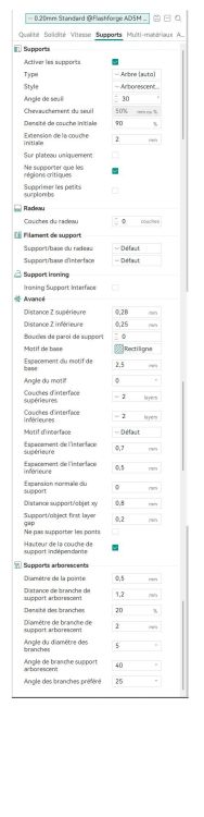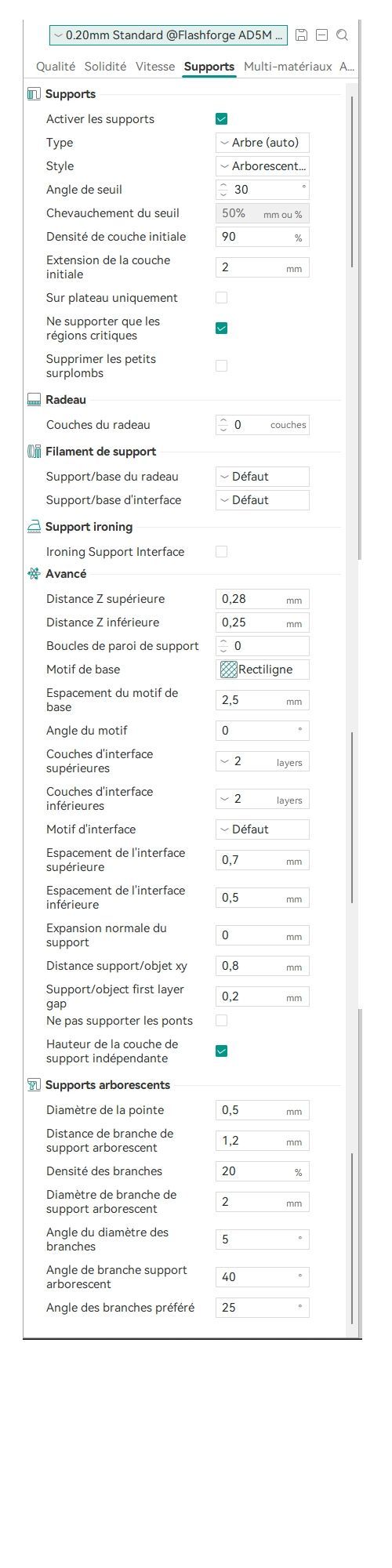 Bonjour, J'ai une Flashforge 5M Pro. J'imprime principalement en PLA. Que ce soit sur Orcaslicer ou Flashprint les supports ne s'enlèvent pas. Ils sont aussi durs que la pièce principale et il faut les couper à la pince et meuler pour pouvoir les enlever. Je supposes qu'il y a un réglage à faire mais je ne m'y connais pas assez. Merci pour votre aide. -