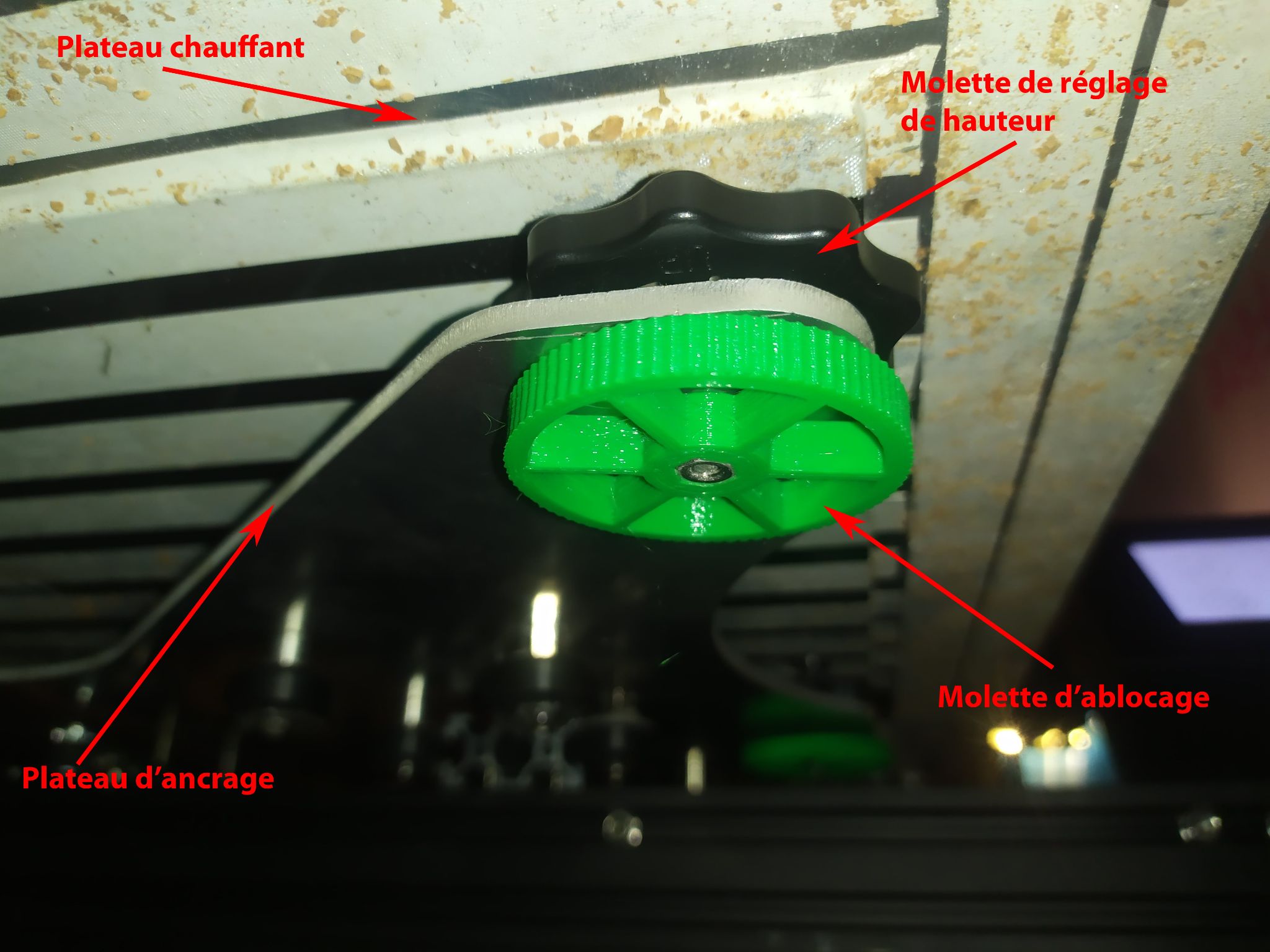 Il suffit de rendre solidaire, les boulons d'origine de nivellement, au plateau d'impression. Avec une rondelle pour avoir une bonne prise et un écrou NILSTOP.