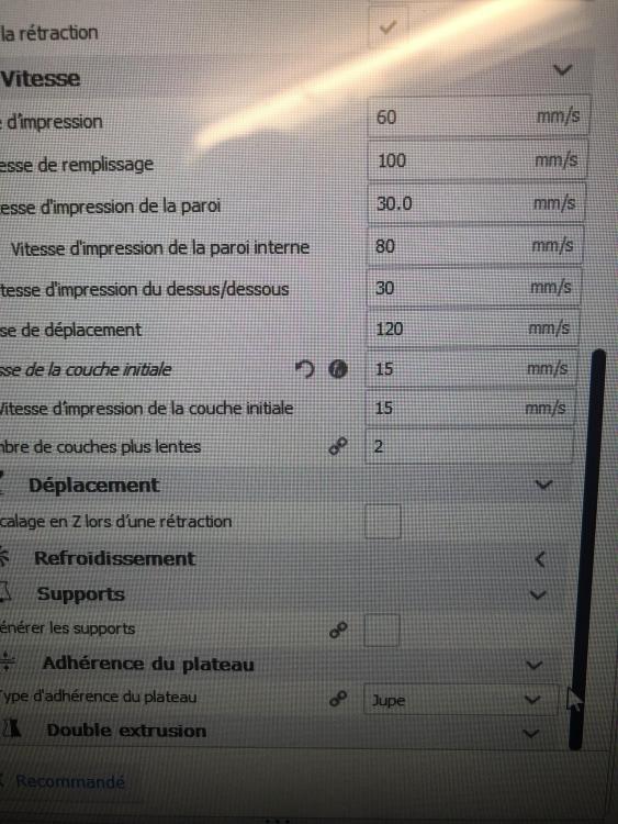 Pas de problème fran6p. Bon j'ai tous vérifier et le problème viens de l'avance du filament il n'avance pas bien. J'ai commander le kit en aluminium peut etre que ça vas règler le problème. Merci a vous tous. Je vous tiens au courant -