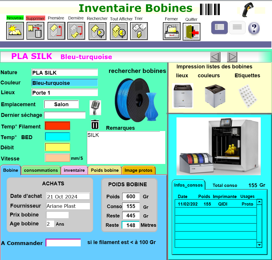 Bonjour à tous, @jcjames_13009 @papajds @pascal_lb Voici j'ai ajouté une aide pour utiliser la gestion des bobines voici i en résumé le texte pour décrire les fonctionnalités A propos de la gestion des bobines de filaments 3D Elle permet notamment de connaître les quantités disponibles, leur emplacement, et à quel moment il faudra réapprovisionner des bobines vides. C’est un gain de temps pour la recherche d’une bobine avec un filament spécifique. De valoriser son stock et de personnaliser son rangement. Description Utilisez cette base de données pour gérer les bobines, tels que les matières, les coloris, le poids etc... La gestion de stock permet la saisie de tous les paramètres envisageables de la qualité d’une bobine de filament. Ainsi que les paramètres d’impressions (températures extrudeur et BED, Vitesse, débit etc…) Barre des menus Vous retrouvez toutes fonctions indispensables (nouveaux enregistrements, suppressions, recherche, tout afficher, navigation des enregistrements. Onglet menu des impressions Différentes listes sont disponible afin de trier les enregistrements par les lieux, les couleurs, les fabricants et autres choix à votre disposition. Utilisation des listes modifiables Cliquez sur un onglet pour entrer ou afficher des informations générales; sur la nature du filament, couleur, poids,rangement, date d’achat etc…. Cliquez sur le bouton Rapport pour utiliser des rapports d'inventaire et vous permettront d’éditer différentes listes selon des critères de choix. Nota une main s’affiche quand une liste peut être éditée ou imprimée. Impression d'une liste Cliquez sur Afficher le rapport Inventaire. Choisissez Imprimer dans le menu Fichier. Après l'impression, cliquez sur le bouton Continuer. le choix et important possibilité d’imprimer selon des choix de TRI (lieux, couleurs, rangement, fournisseurs etc…) Mode rechercher bobine (image bobine bleue) Cette action permet de rechercher une bobine spécifique par la qualité, la couleur, le fournisseur, le rangement etc...) une liste s’affiche si il y a plusieurs occurrences il suffit de cliquer sur l’index gauche de la ligne pour ouvrir la fiche de cette bobine. Impression des étiquettes celles-ci sont utilisées pour identifier une bobine en collant l’étiquette soit sur le carton ou la bobine. Séchage bobines Une date du dernier séchage permet d’évaluer selon le filament la dernière période de séchage. La date devient rouge quand le délai est supérieur à 30 jours ou plus. la date de saisie est valorisée par un calendrier. Commande d’une bobine Un indice de commande devient “oui” quand le stock est à zéro ! dans ce cas il est possible de commander une nouvelle bobine ou de supprimer cette bobine. Onglet des consommations La rubrique date du jour de l’impression, le type d’imprimante, le projet, le poids. les saisies des rubriques permettent d’évaluer avec précision la consommation précise du filament. Le filament consommé est noté à l’issue du tranchage du Slicer de son choix et reporté dans le poids consommé. Inventaire une date d’inventaire permet pointer avec précision la présence ou non des bobines de son stock. Cette option est un pointage précis afin de corriger des erreurs de saisies ou des négligences du suivi. Ainsi il est possible de corriger le poids du filament restant d’une bobine. >A+ francis voici la nouvelle version de la gestion des bobines avec des onglets pour faciliter les saisies a+ -
