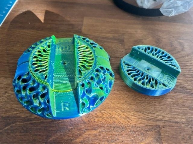 Salut ! Je reviens avec quelques nouvelles, j'ai corrigé cette histoire de point dur en donnant un peu de jeux, en desserrant les écrous de serrages des poulies. J'ai pu repartir sur des prints que j'ai lancé avec audace les yeux fermés (et surtout obligé de quitter la pièce pour une raison tout autre) sans même regarder la ligne de purge se faire: Très content j'ai une superbe première couche et une pièce qui est sortie plutôt nickel, quelques stinging, probablement revoir la température pour ce matériel. Non je ne suis toujours pas adepte du Benchy je préfère envoyer du concret et de l'utile Ici des pièces pour un Head(amame) projet de casque audio Hifi opensource. Le lien pour ceux que ca intéresse : https://headamame.com/ Imprimées @ 0,15mm / 80 mm/s avec buse de 0.6mm Et la version imprimée ici est une version "openback" qu'il est possible d'imprimer a partir des fichiers originaux en jouant avec les paramètres du slicer, je suis parti sur une version modifié de ce modèle dispo ici : https://thangs.com/designer/DaveMakesStuff/3d-model/Gyroid Cones for Head(amame) Headphones - Single Extruder Files-930949 Je partagerais le rendu final lorsque j'aurais reçu les composants et réalisé le montage. Je ne clos pas forcement ce post car probablement d'autres améliorations seront apportées a l'imprimante : breakboard pour la tête d'impression, ventilateur auxiliaire (type bambulab) et peut-être plus ... A plus tard ! -