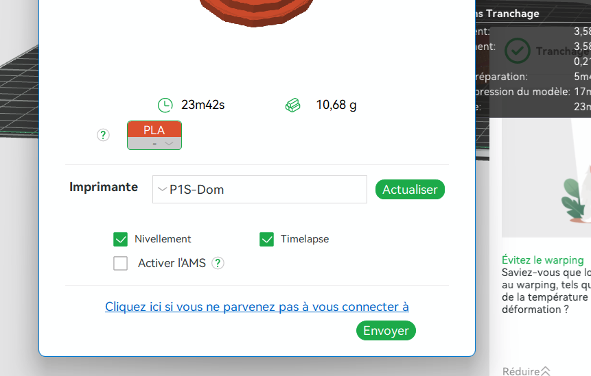 J'ai refais un essai avec un autre pla, mais même soucis . J'ai pris les paramètres par défaut de bambustudio il doit y avoir un paramètre à régler. (réduire vitesse des surplombs est coché et j'ai laissé les vitesses .)