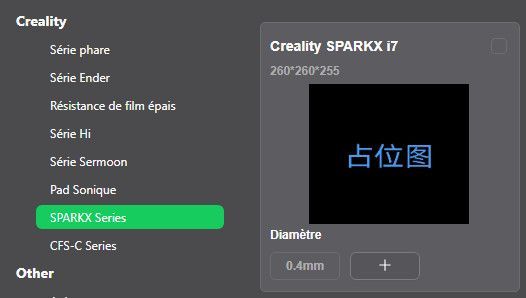 Derrière ce curieux nom, une nouvelle gamme d'imprimante 3D filament référencée dans Creality Print : SPARKX i7 Pas d'autre information officielle pour l'instant, outre son volume de 260 x 260 x 255 mm.