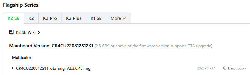 Discrètement aussi sur la page de téléchargement des firmwares : (le lien "wiki" est un leurre) On dirait une K1 SE donc une K2 ouverte avec un plus petit volume (la K2 standard propose 260 x 260 x 260 mm). Avec logiquement compatibilité du CFS classique pour cette K2 SE.