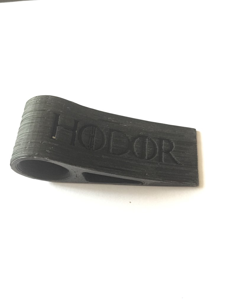 J’ai donc fait des tests pour le reste … Vitesse et température …. Mais rien de bien concluant. Des choses ma foi satisfaisantes et encore, mais toujours frustré de voir vos réalisations et mes résultats ….. Voici une partie de mon cimetière de plastiques ;) et un robot moche en qualité. Le cale-porte de geek était largement correct pour son utilisation qui est de caler la porte de ma petite. le cale-porte que j’ai trouvé sur Thingiverse : (simple, efficace) http://www.thingiverse.com/thing:1588585 je lui ai fait un support pour le pendre à la poigné de la porte :). -