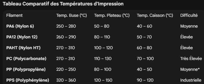 Salut et bienvenue dans le monde l'impression 3D @Lgargo. Alors sa va être assez rapide pour le choix de la machine, car en 500x500x500 en machine close a moins de 1200€ y a rien d'autre. Si tu as besoin d'avoir une large gamme de support de filament technique, attention tu sera limité par les capacité de chauffe de la buse limite a 300°c si rend certain filament Technique comme le PPS le PP ou certain PA HT difficile a utilisé car il demanderont plus de 300°C de buse, la chauffe du Lit a 100°c est aussi limitante pour certain filament : Voici les plage de temp° nécessaire (note que pour le PPS en réalité même avec un caisson a temp° plus faible sa peu passer hein) autant te dire que les filament technique même pour quelqu'un comme moi je suis pas a l'abri d'une surprise il faut être très vigilent avec ces filaments mais si en plus ta machine a des limites attention sa rajoute de la complexité. Il faut prendre un autre point en compte certain filament comme les PA et encore plus le PA6 sont très hygrofill il absorbe très très vite l'humidité il est donc vital de prendre en compte qu'il est préférable de les placer dans un dryer adapter (pour le PA il faut un dryer supportant mini 70°C, mais un modèle supportant 85°c sera plus pertinent avec certain filament comme le PC et le PPS voir le PAHT mais sa je sais plus si il demande une temp° supérieur au PA6 et PA12). La Sovol SV08 et 08 max sont des machines exploitables mais elle demande un peu d'apprentissage en maintenance et utilisation voir optimisation, ce ne sont pas des machine que je recommande généralement a un débutant car il est préférable d'avoir des bases, mais après rien d'impossible avec la motivation. Pour être très honnête avec le profile de filament que tu vise dans ton message je t'aurais plus orienté vers une Qidi comme la Max 4 qui va sortir sous peu (en générale je parle pas d'une machine sur laquelle on a pas encore de retour, mais c'est la grand sœur des Qidi Q2/Q2C et Plus 4 que l'on connais déjà dont y a un ADN que l'on connais), les Qidi sont les machine assez accessible les mieux pourvu pour le filament technique car de bas support plateau a 120°c, buse a 370°C et caisson chauffant de base, de plus elles sont devenue de plus en plus simple a prendre en mains avec un bon SAV. Le souci la Qidi Max 4 est loin des 500x500, on est a 390x390x340 ce qui est déjà énorme, perso j'ai la K2 Plus en machine technique qui fait 350x350x350 c'est déjà un beau bebe. -