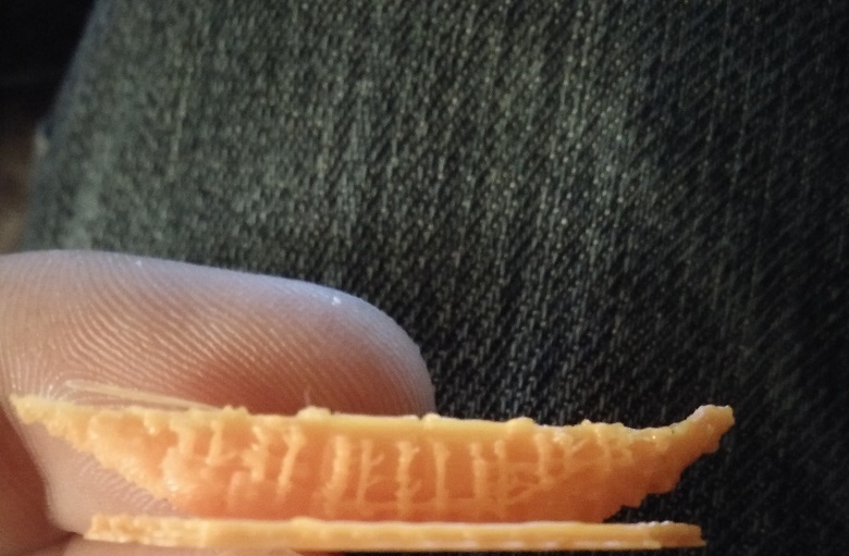 Oui mais ils remontent quand même ^^ J'ai imprimé d'autres pièces mais des pièces simples, en général il n'y avait pas de "porte-à-faux", c'est pour ça que j'insiste sur celle là je ne veux pas abandonner sinon je vais me restreindre à des carrés et des portes-clés dagoma En fait je pense à deux raisons possibles: - chaleur excessive (qui fait remonter et ramollir le plastique), la solution serait peut-être de ventiler au niveau de la pièce (quoi que ça risquerait de sécher la première couche et du coup la pièce décrocherait) - buse abîmée qui accroche, ce qui est possible car la première fois je l'ai nettoyée avec une éponge humide et on m'a dit que j'étais crétin car le métal allait s'oxyder. En tous cas je lâche rien et je posterais à nouveau quand j'aurais réussi (ou je passerais la dagoma par la fenêtre si je n'y arrive vraiment pas )