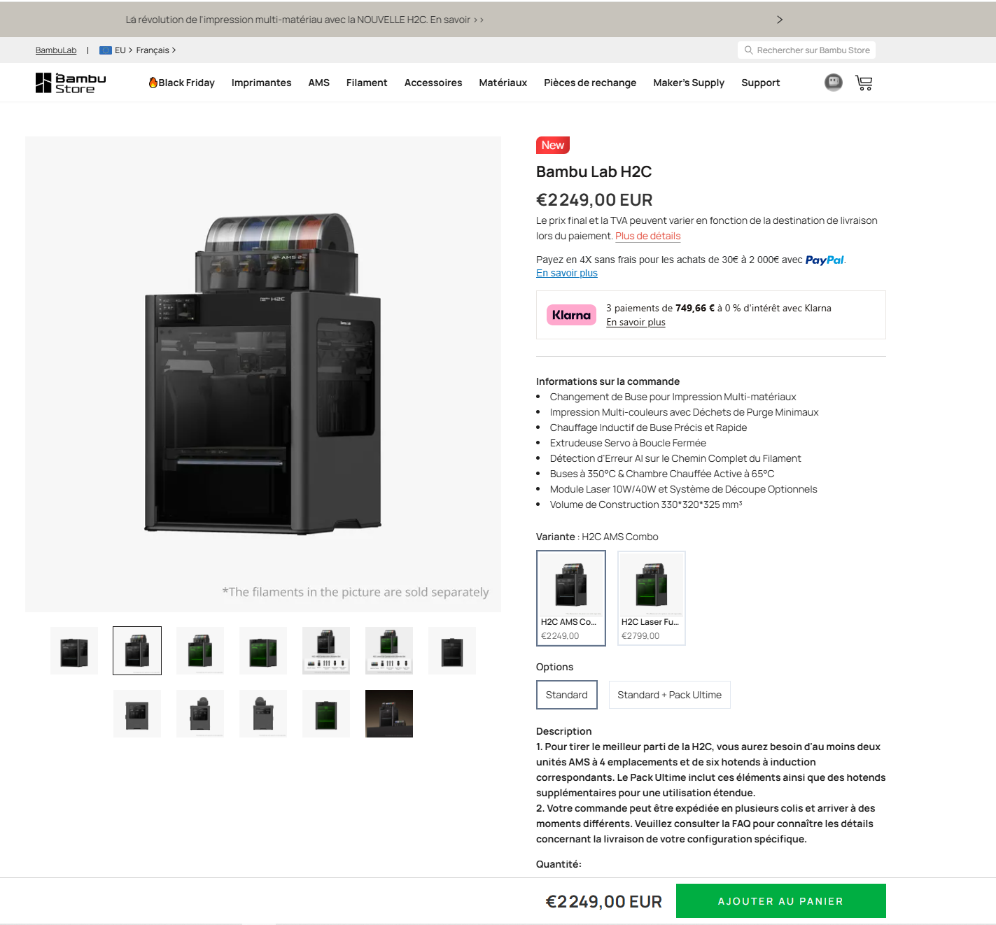 ça y est c'est de nouveau en ligne. - X3 Pro à 206 € avec une taille de 240 x 240 x 260. https://www.artillery3d.com/products/artillery - X3 Plus à 310 € avec une taille de 300 x 300 x 400. https://www.artillery3d.com/collections/3d-printers/products/artillery-sidewinder-x3-plus